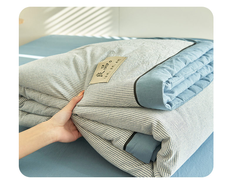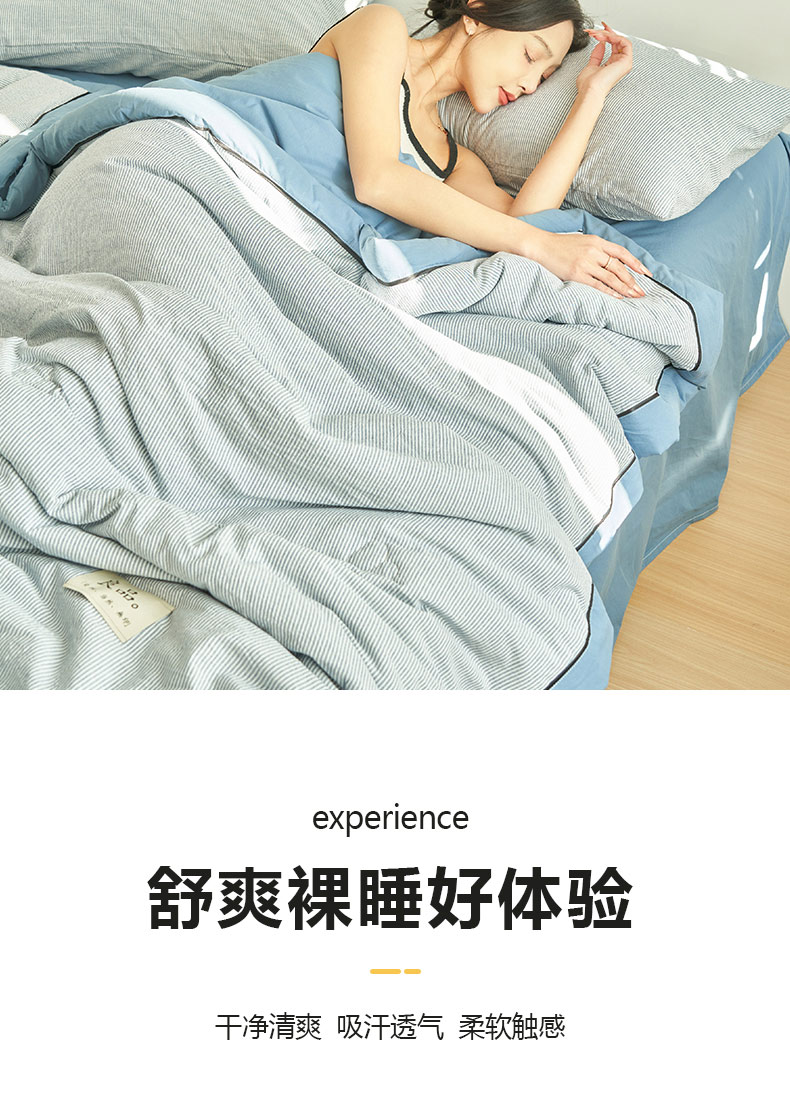 • 91家纺网 家纺一手货源 找家纺 寐绸家纺 2025新款纯棉水洗棉细条宽边大豆纤维夏被四件套 密条-牛仔蓝