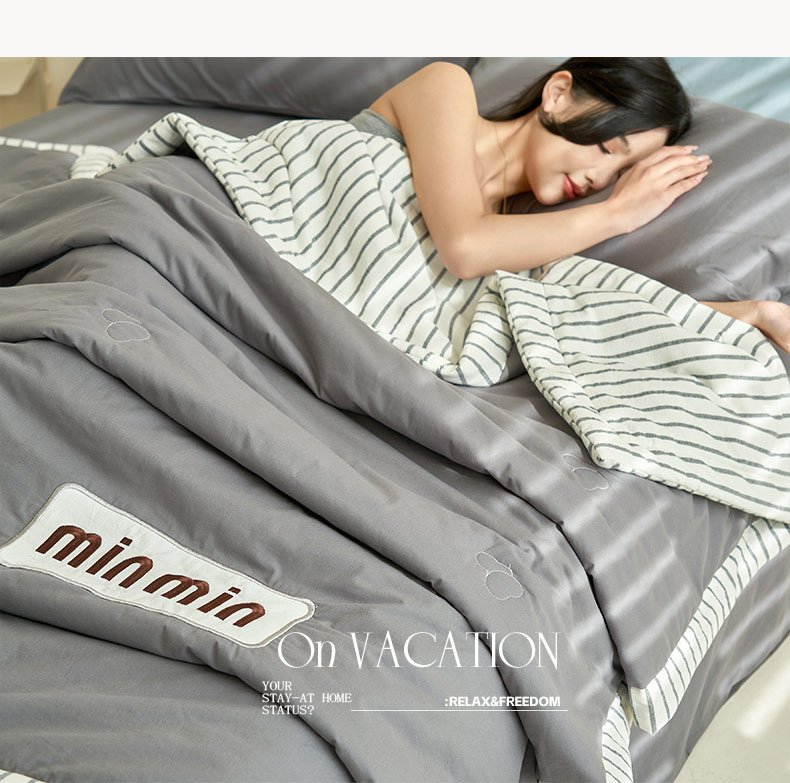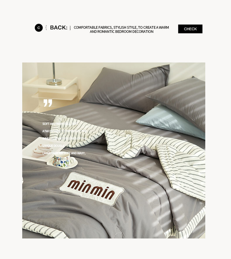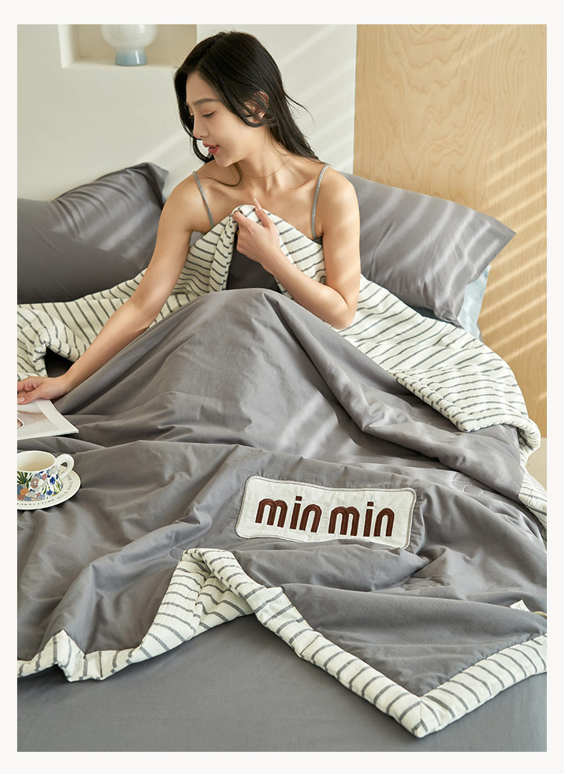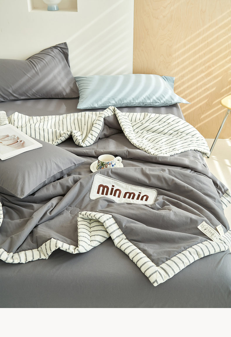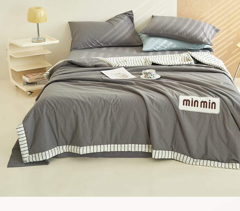 • 91家纺网 家纺一手货源 找家纺 寐绸家纺 2025新款纯棉水洗棉min绣花竖条边大豆纤维夏被四件套 MIN-深灰