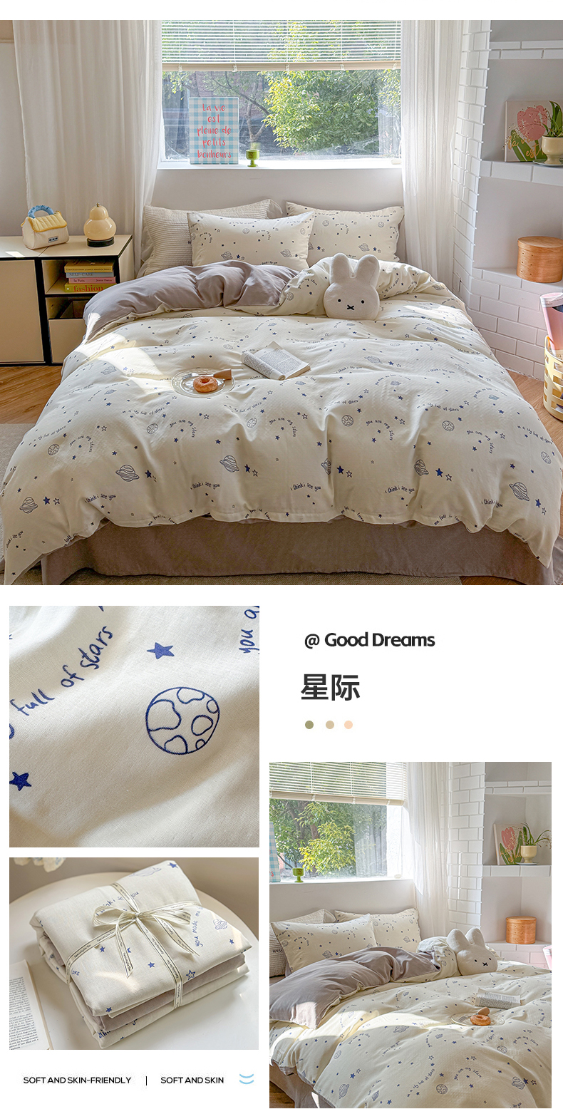 (总)时年家纺 2025新款全棉纯棉生态磨毛嵌绳款系列四件套,绿光森林,星光彩虹,芝士蘑菇