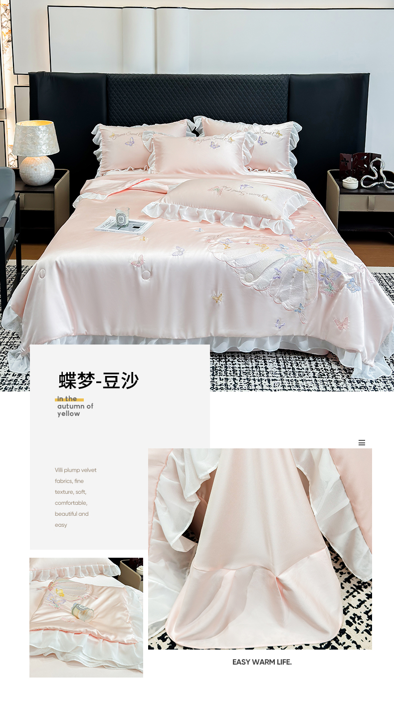 优贝家纺 2025新款韩版天丝刺绣四件套-蝶梦夏被系列 蝶梦-豆沙