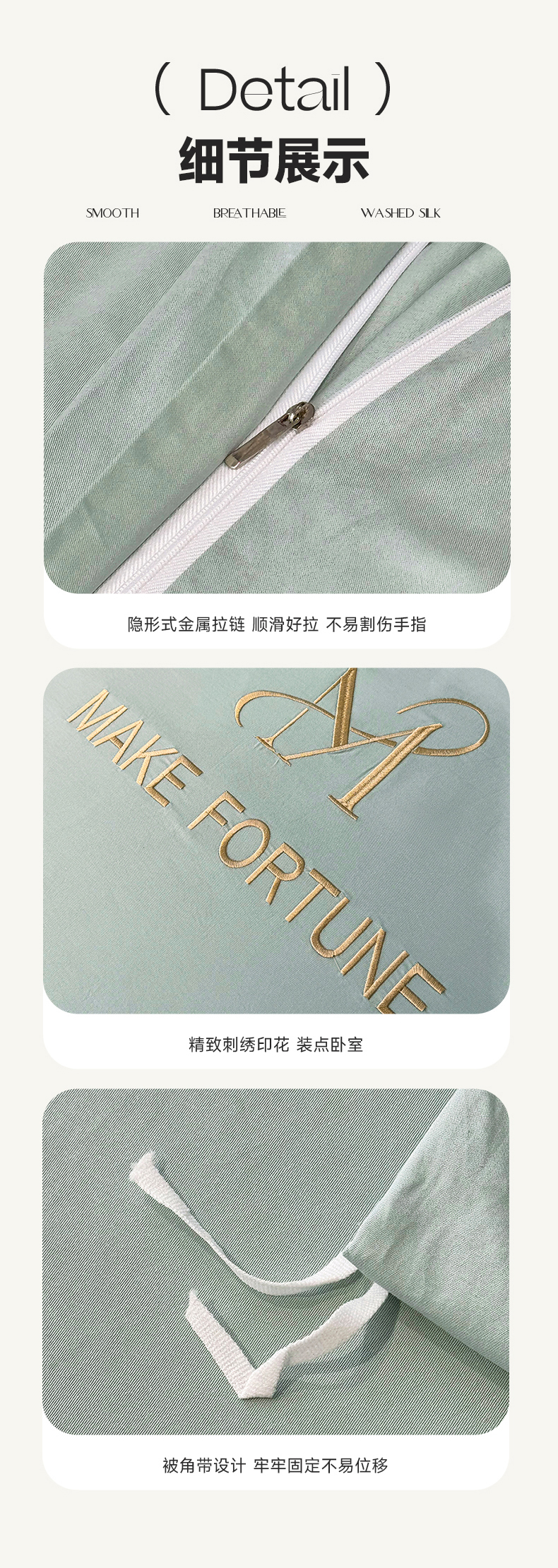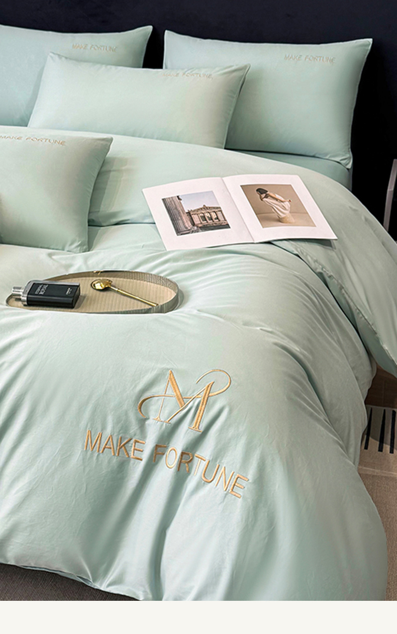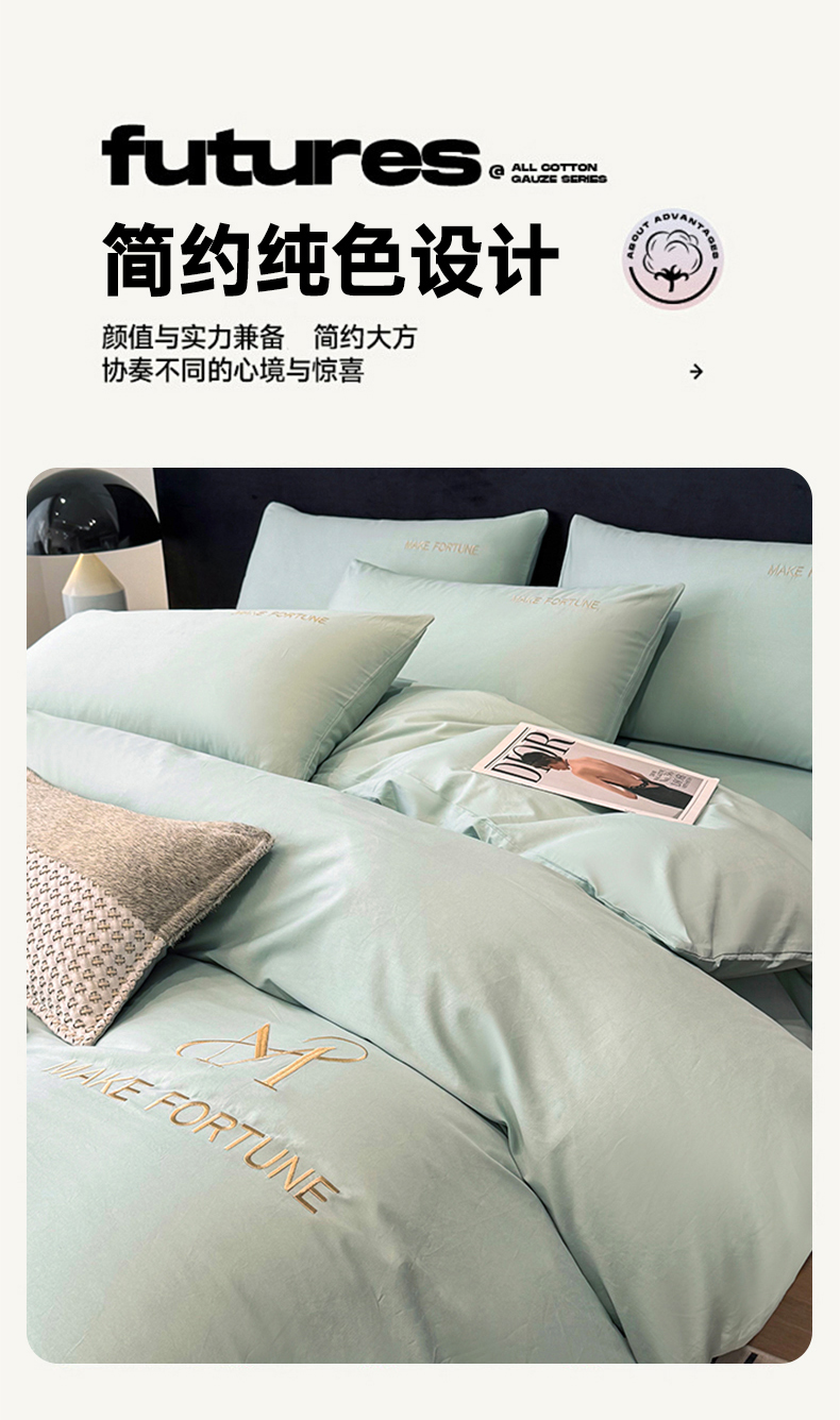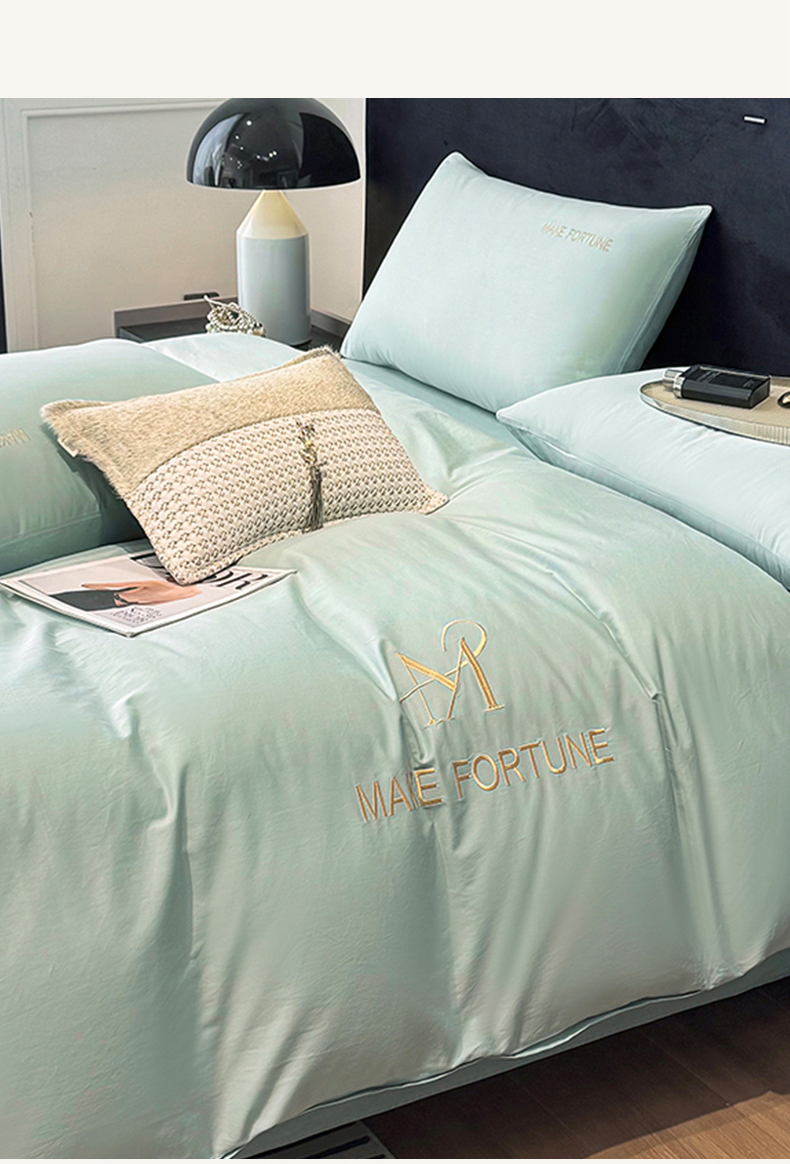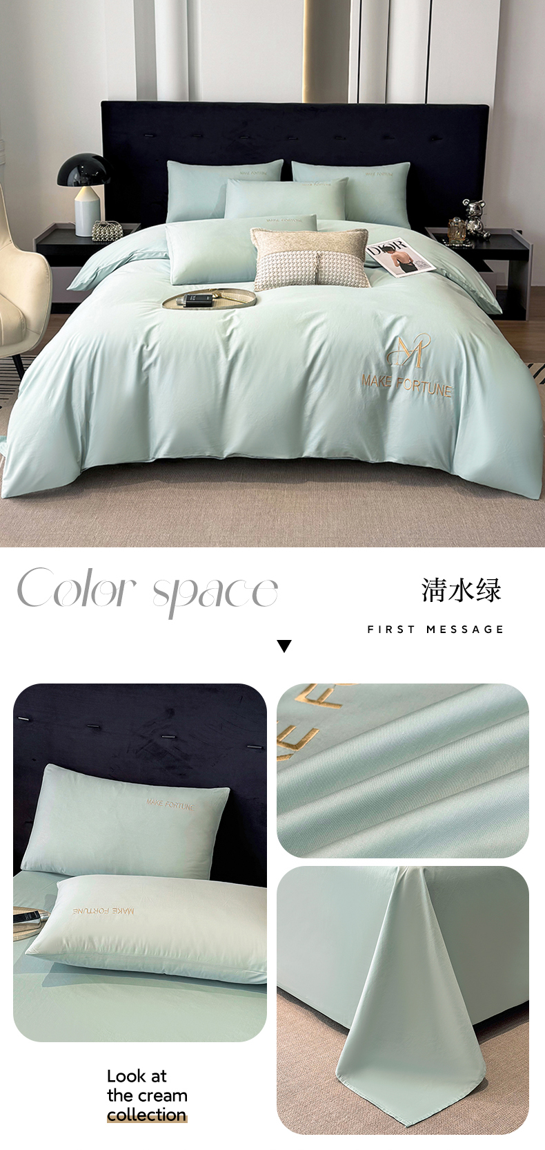鸿织源家纺 2025新款全棉刺绣款简约纯色四件套 清水绿