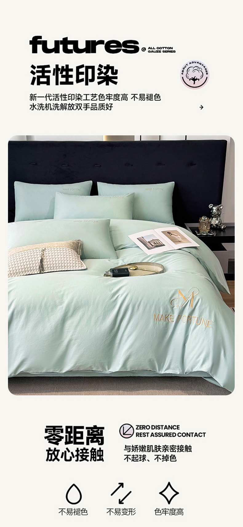 商品名称:鸿织源家纺 2025新款全棉刺绣款简约纯色四件套 清水绿