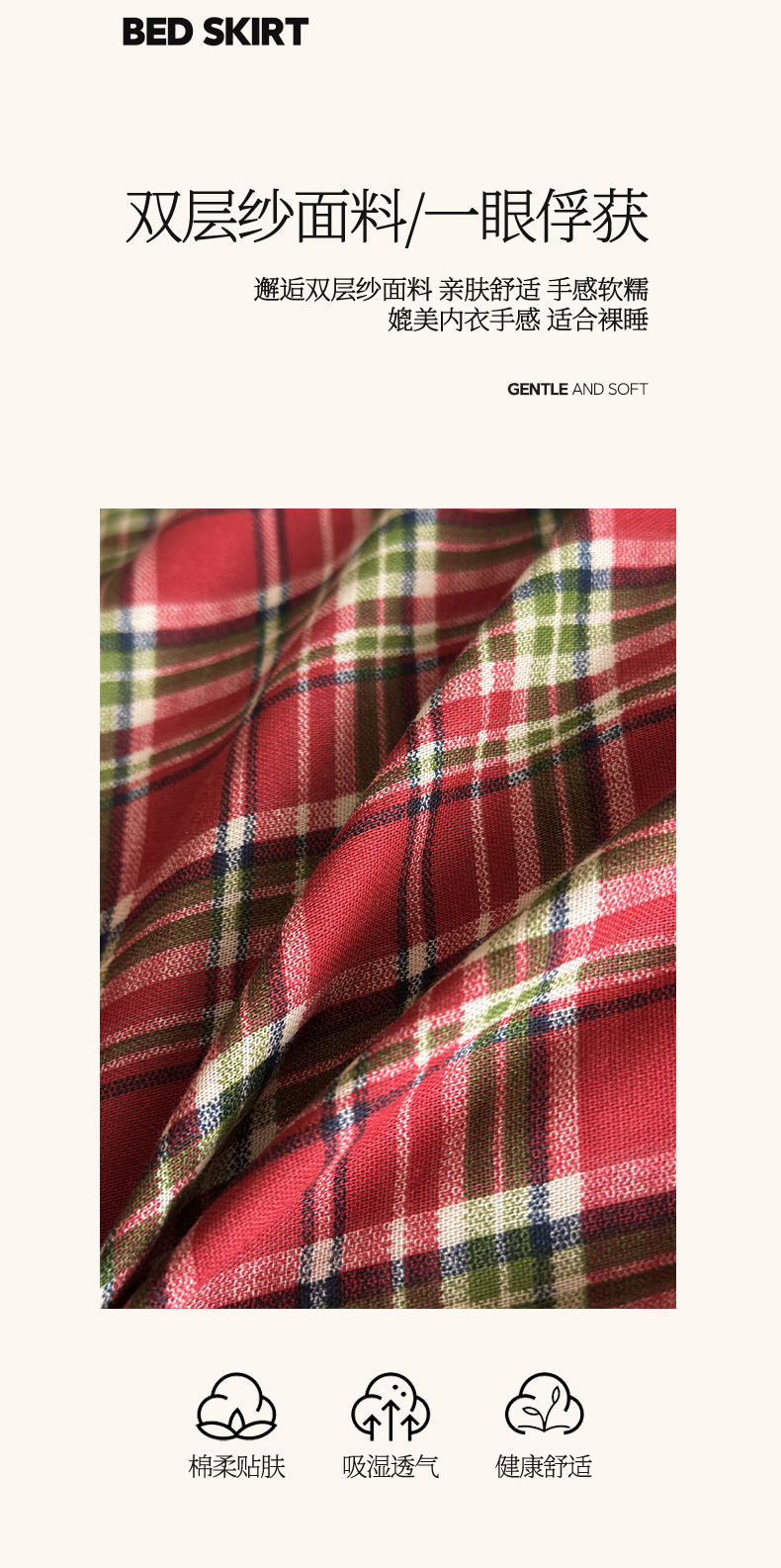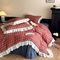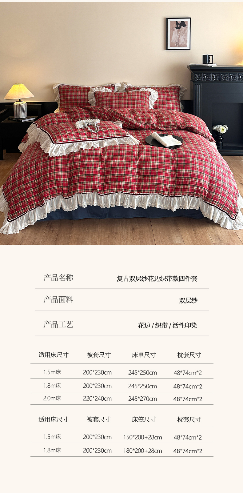 商品名称:蓝邻家纺 2025春夏新款全棉纯棉复古双层纱花边织带款四件套 清格