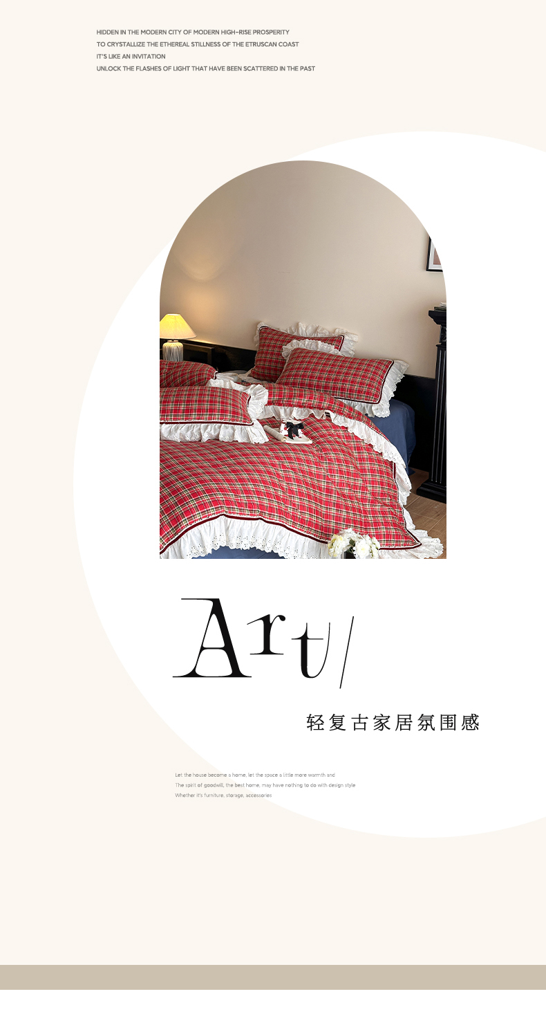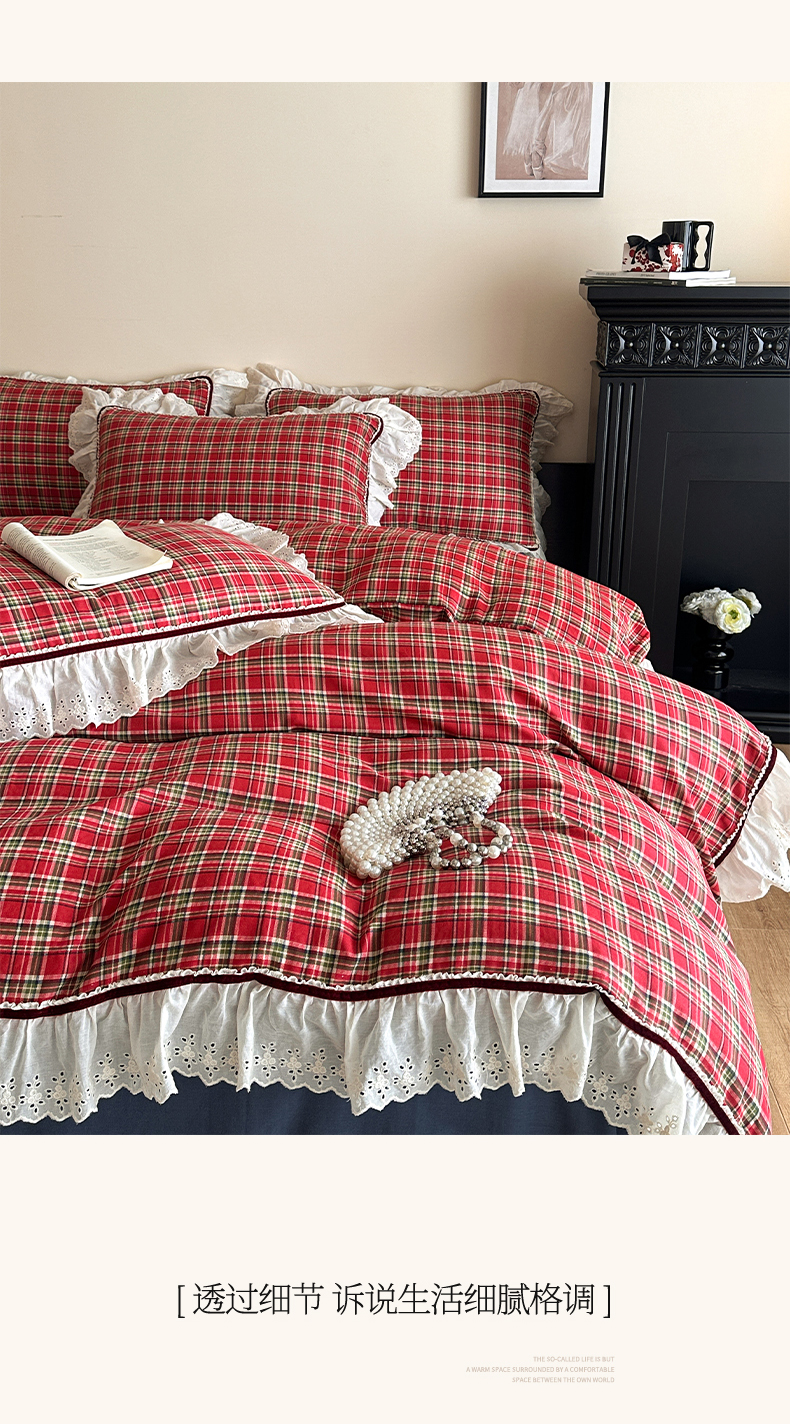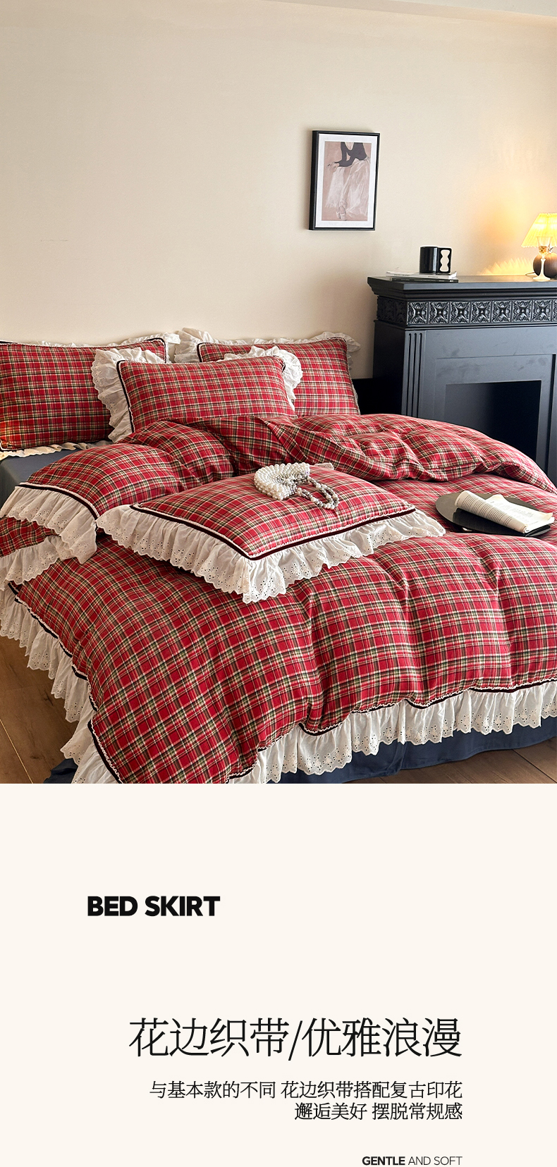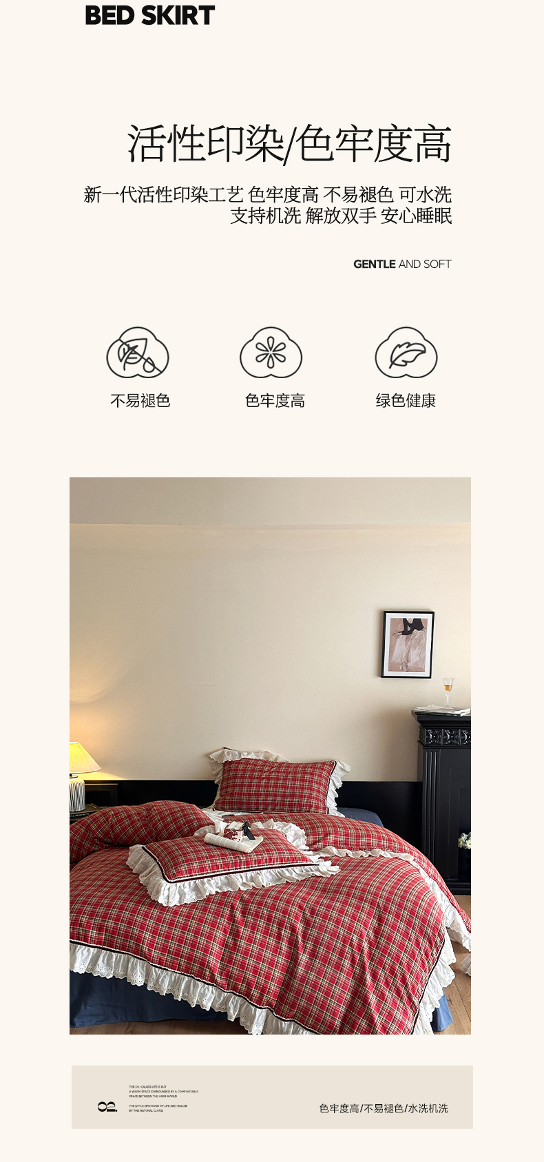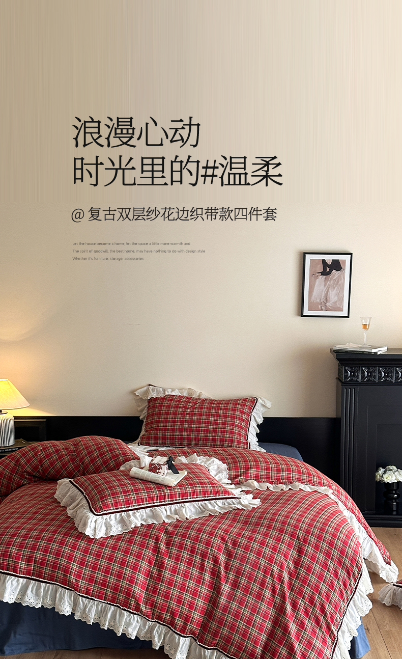 蓝邻家纺 2025春夏新款全棉纯棉复古双层纱花边织带款四件套 清格