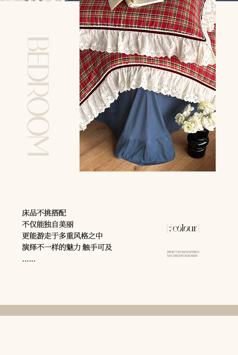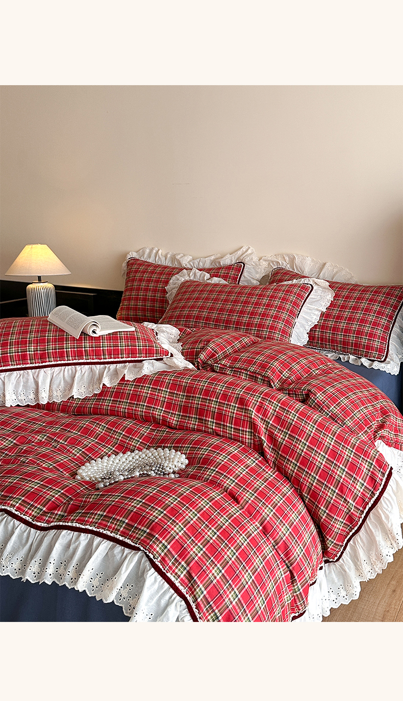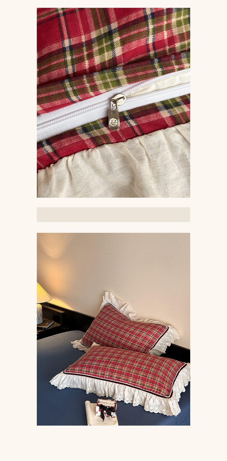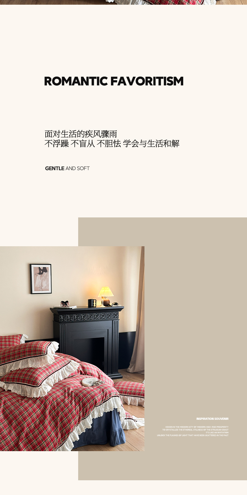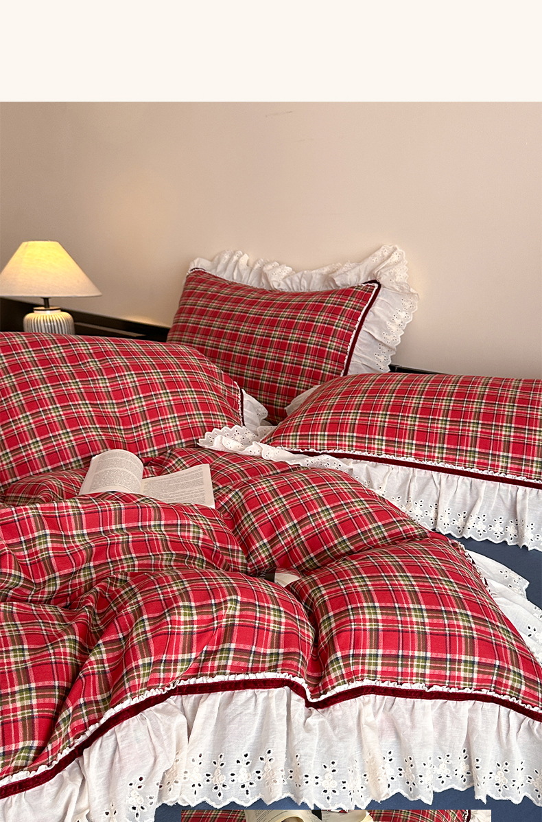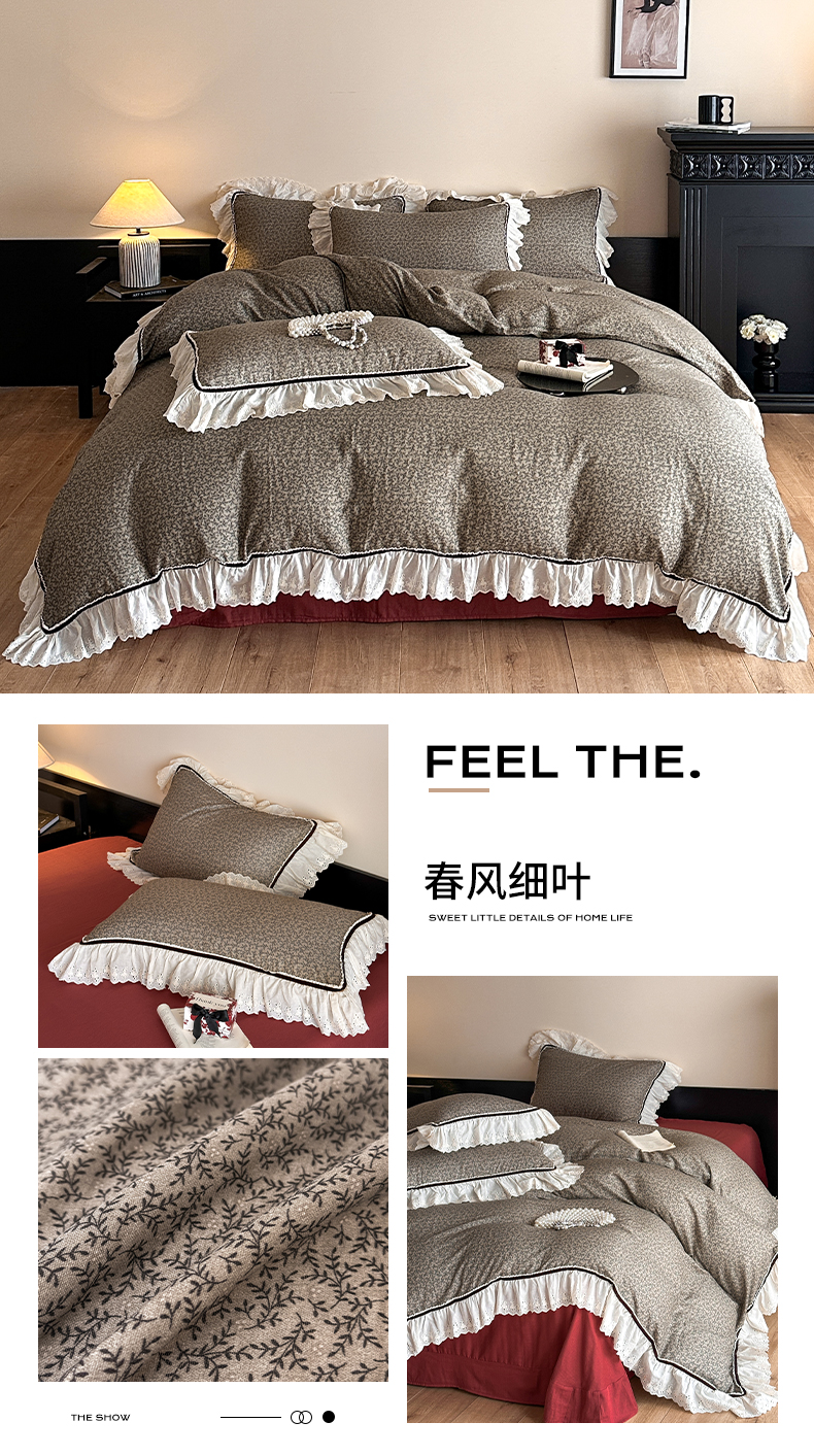 蓝邻家纺 2025春夏新款全棉纯棉复古双层纱花边织带款四件套 清格