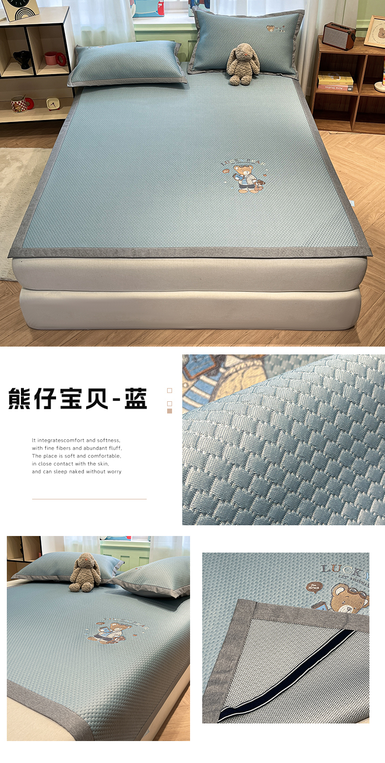 启程家纺 2025春夏新款冰豆豆凉席刺绣款复合三明治三件套 熊仔宝贝-蓝