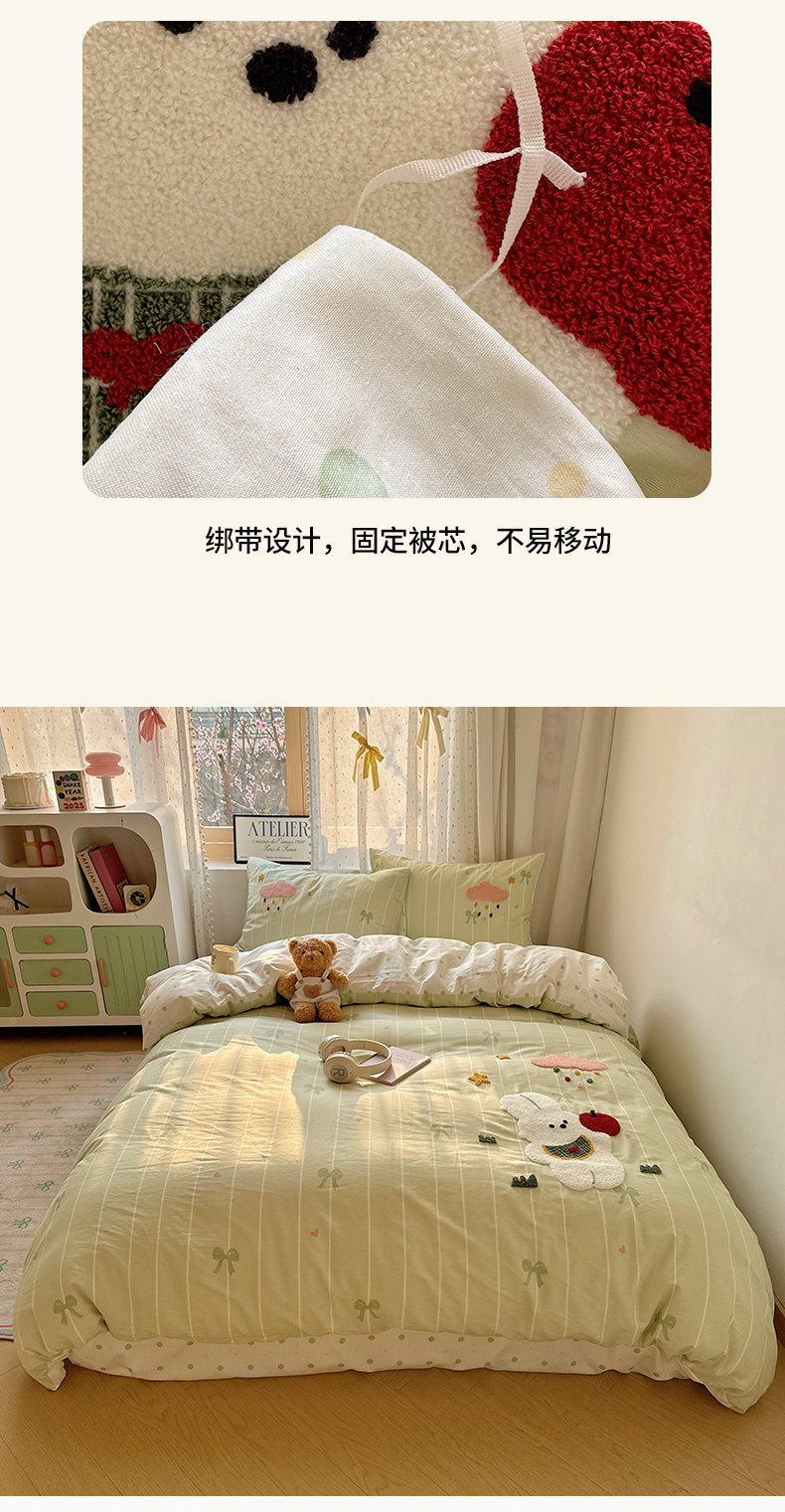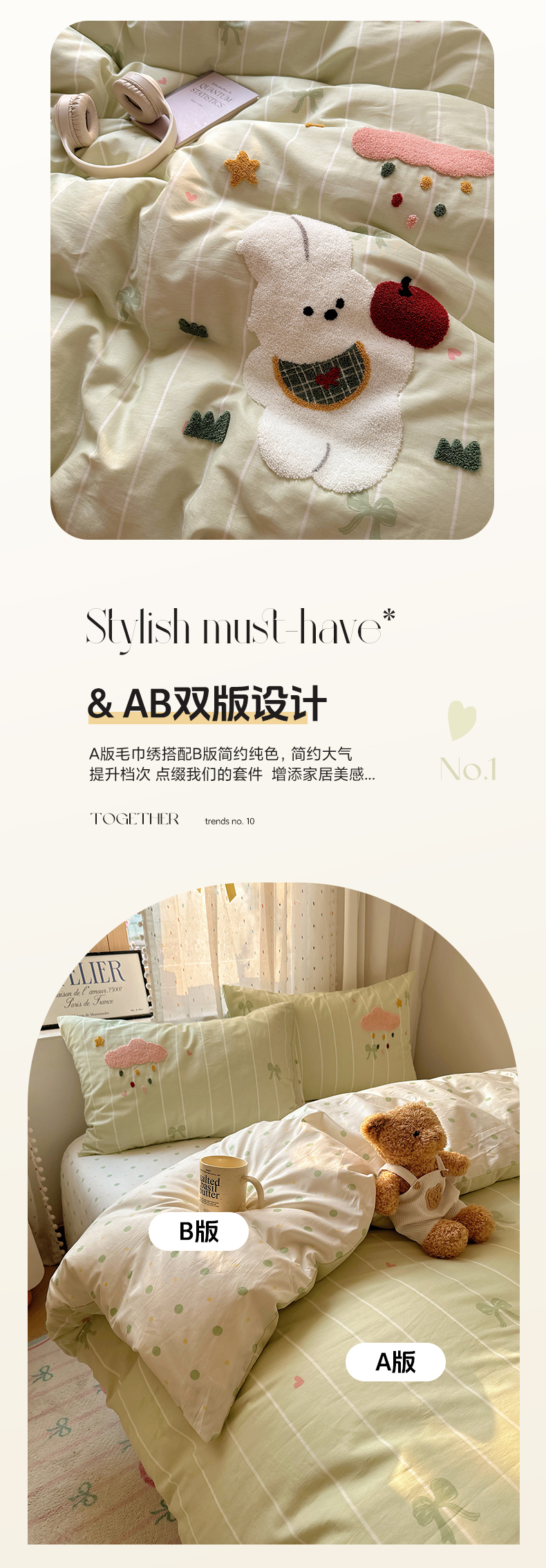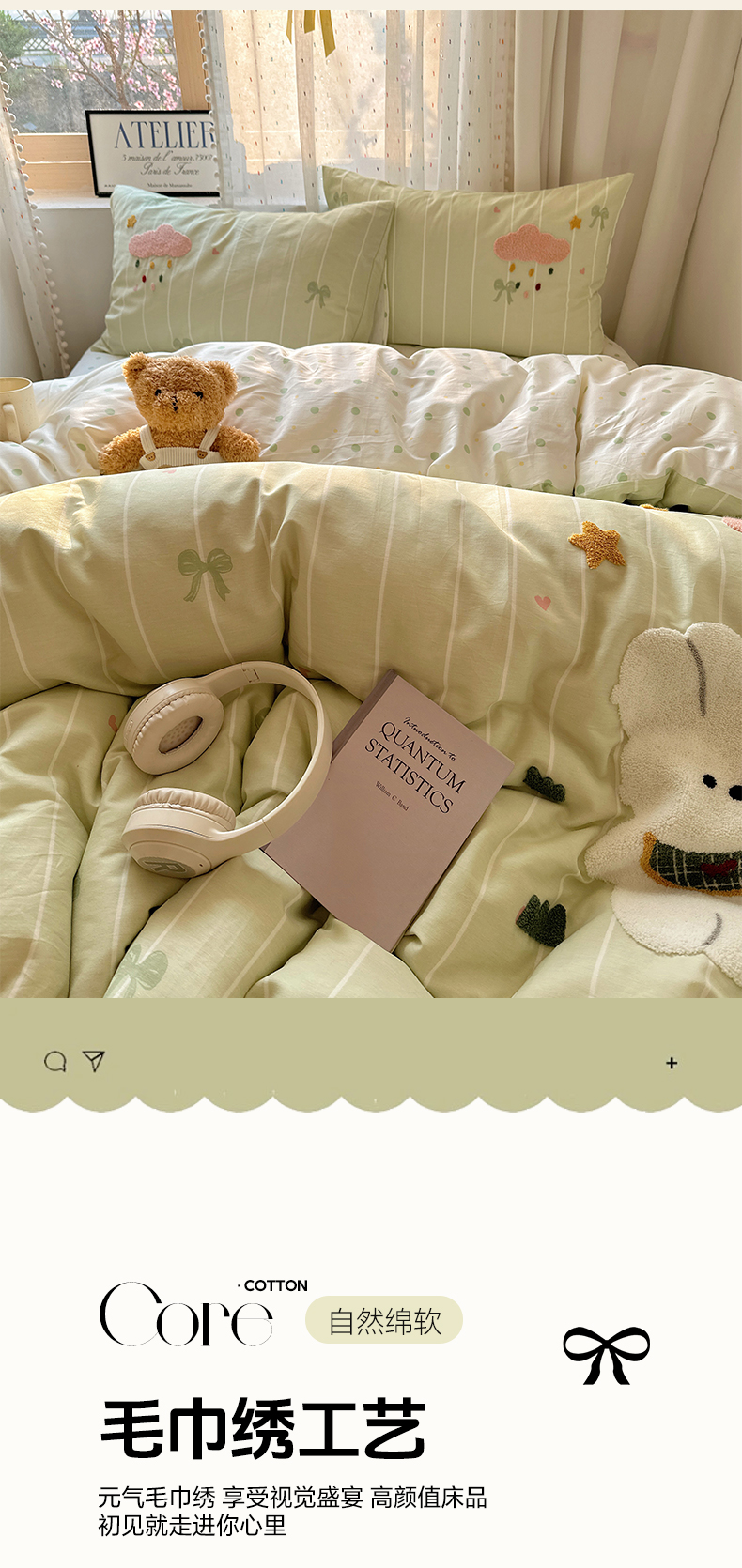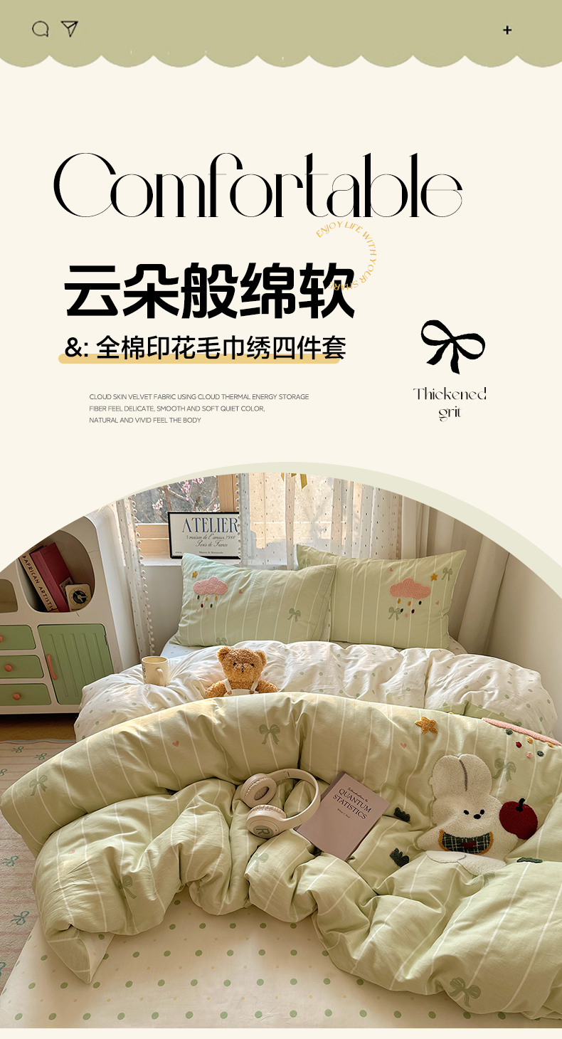当前位置: 91家纺网 > 商品网购 > 床品套件 > 四件套 > 毛巾绣四件套 > 澳梵家居 2025新款小清新全棉印花毛巾绣四件套 苹果兔兔