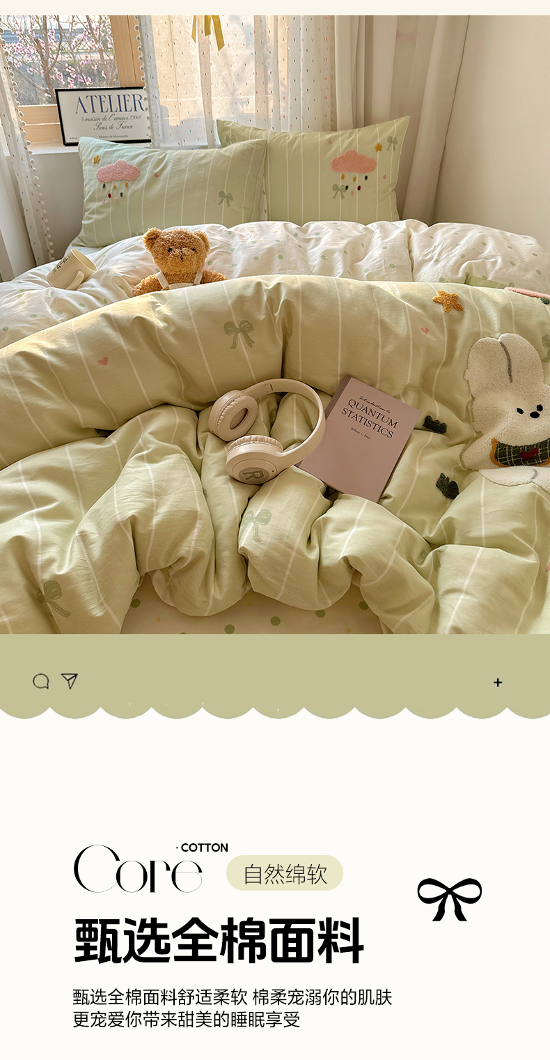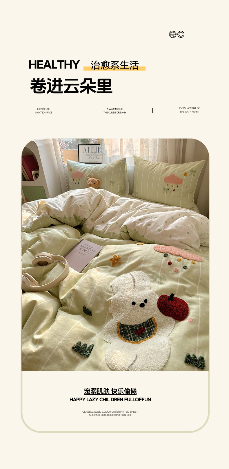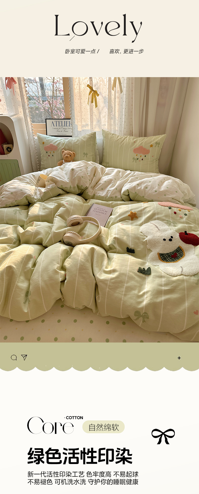 当前位置: 91家纺网 > 商品网购 > 床品套件 > 四件套 > 毛巾绣四件套 > 澳梵家居 2025新款小清新全棉印花毛巾绣四件套 苹果兔兔