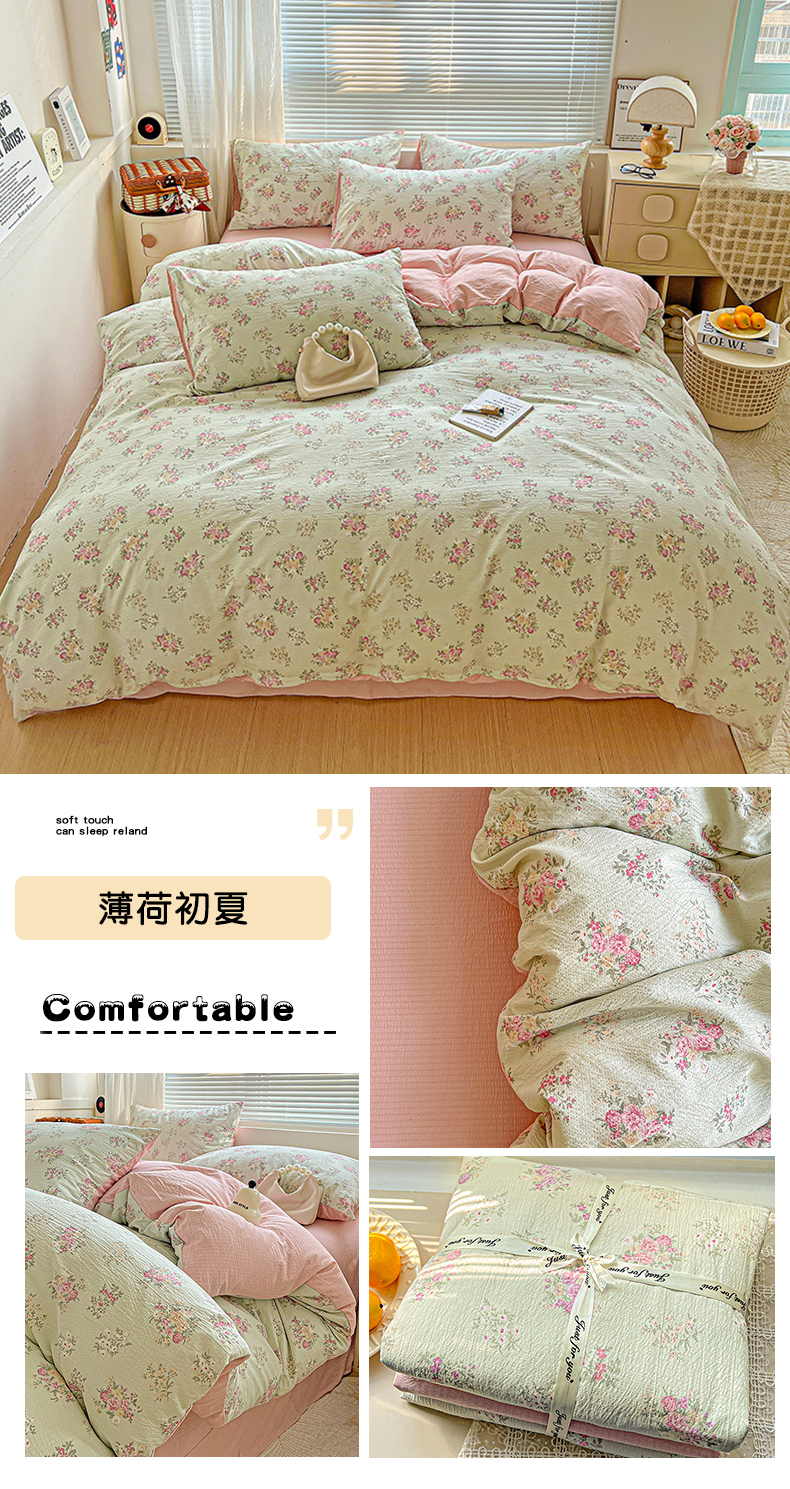 当前位置: 91家纺网 > 商品网购 > 床品套件 > 四件套 > 双层纱四件套 > 金梦拉家纺 2025新款提花纱布棉双层纱皱皱纱四件套 绿茵
