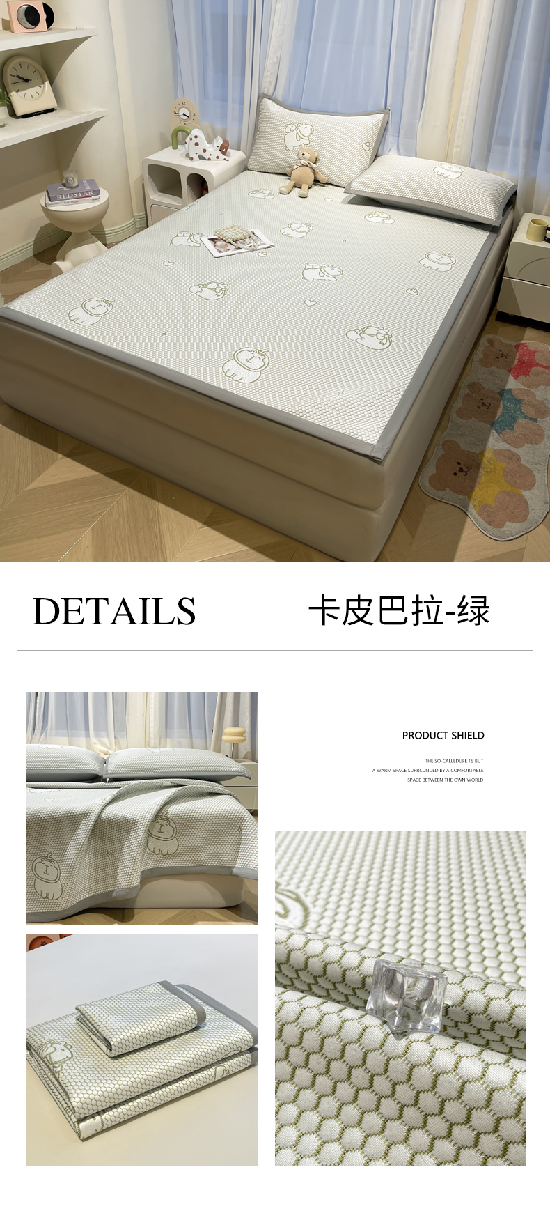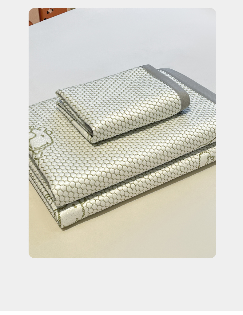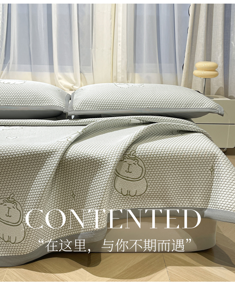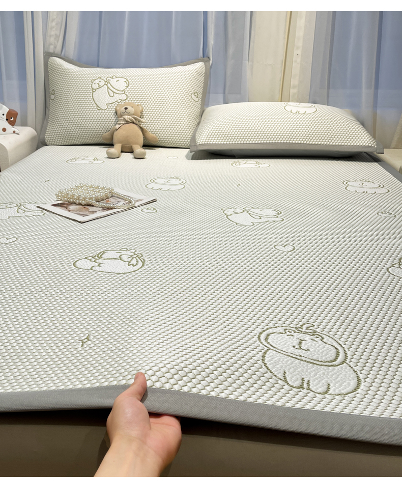 商品名称:LIFE.丽芙 2025春夏季新品A类针织提花冰凉豆豆凉感软席子平铺绑带款冰丝凉席三件套(450克)-风格二 卡皮巴拉-绿