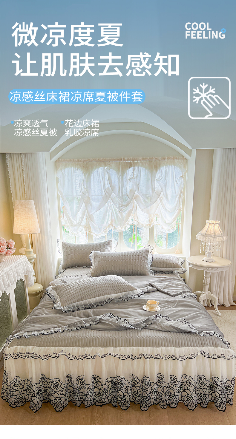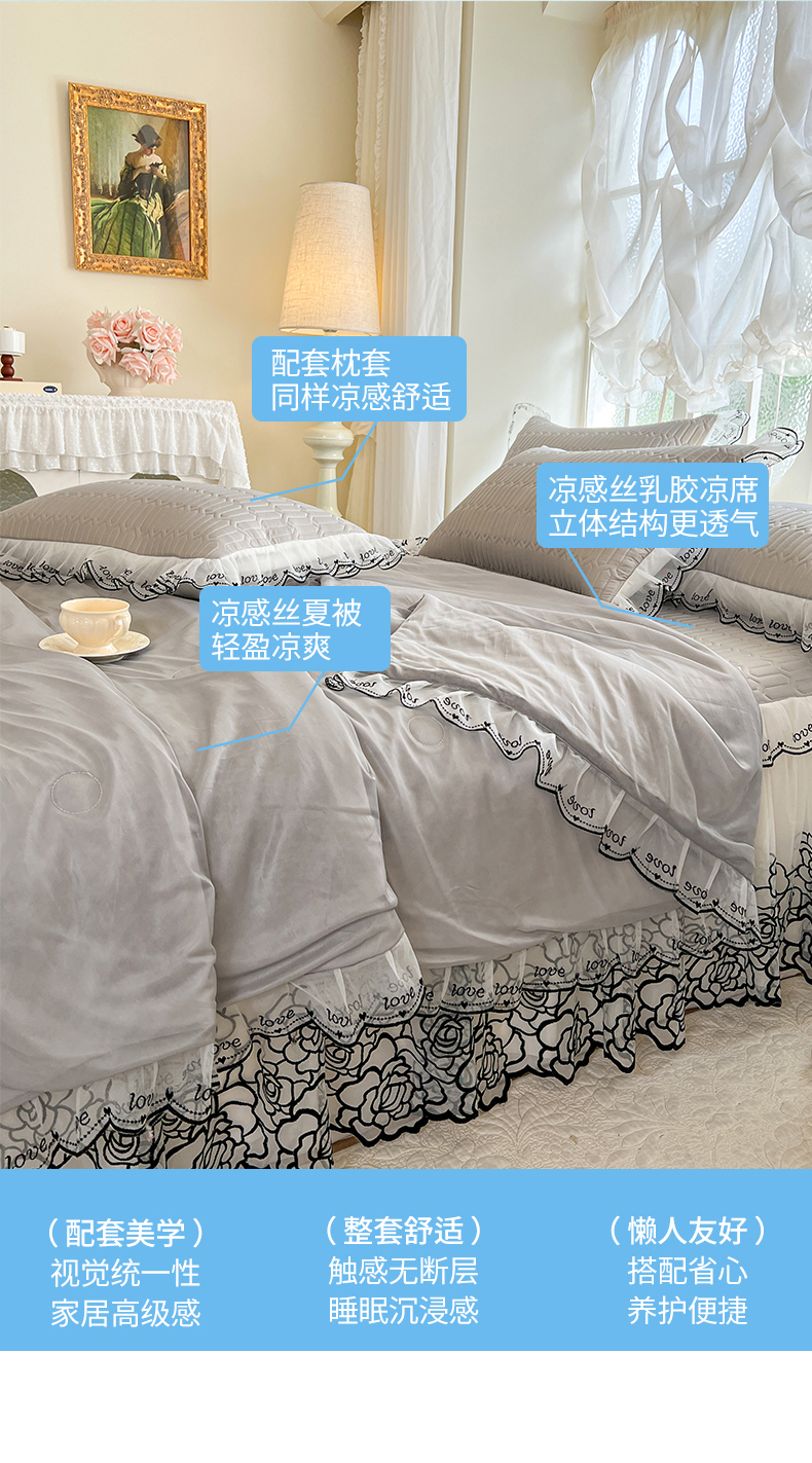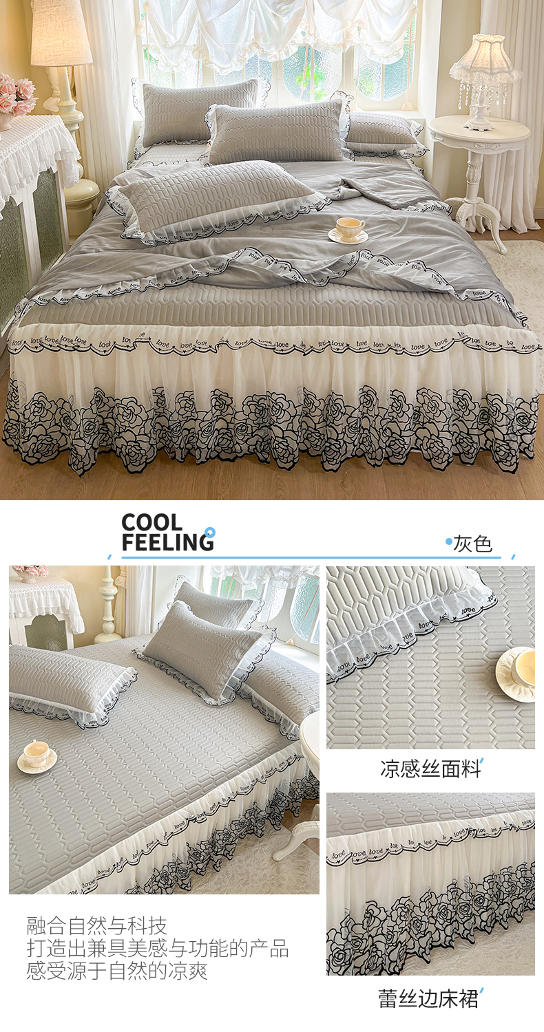 2025新款凉感丝乳胶凉席床裙款夏被四件套-爱恋 灰