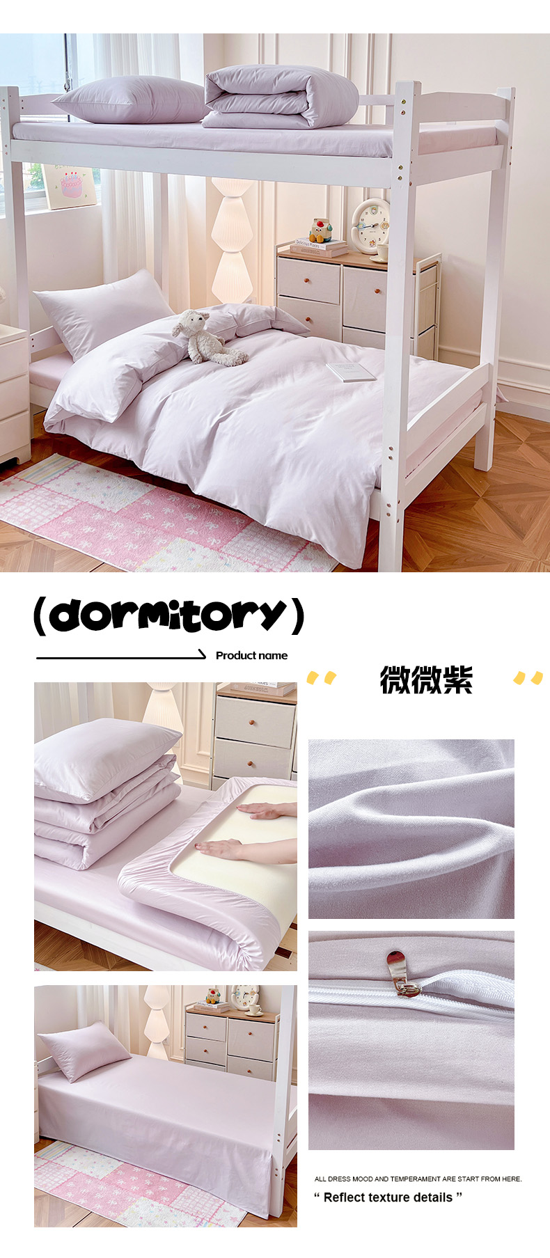 商品名称:泽西家纺 2025新款A类加密全棉40支13376简约风宿舍双拼纯色纯棉学生三件套 微微紫