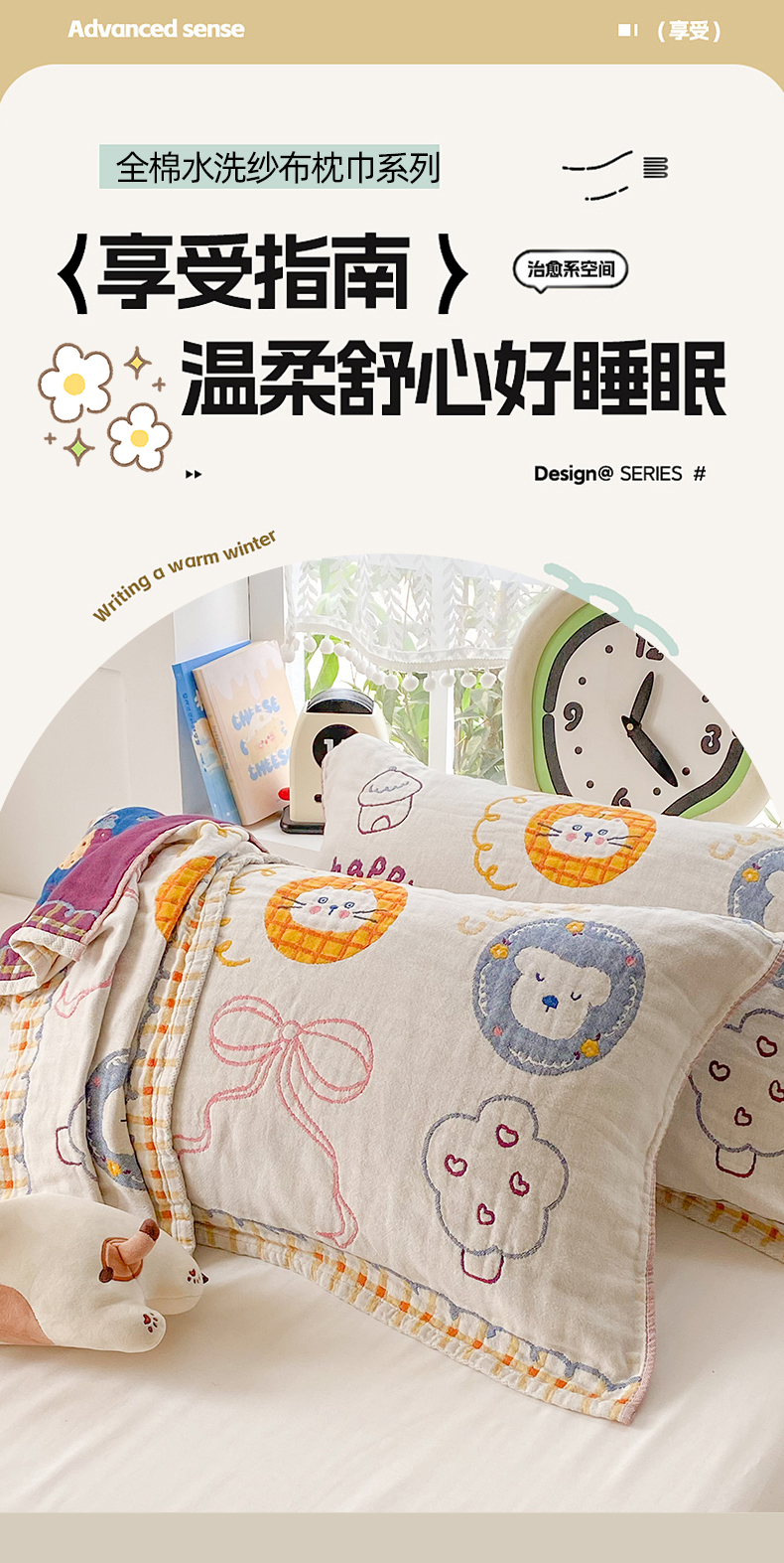 (总)美宜家 2026新款全棉细纱加厚萌系治愈风枕巾,条纹蘑菇一只,伙伴一只,萌萌兔一只,绅士熊一只,童趣一只,小暖狗一只,条纹蘑菇一对,伙伴一对,萌萌兔一对,绅士熊一对,童趣一对,小暖狗一对