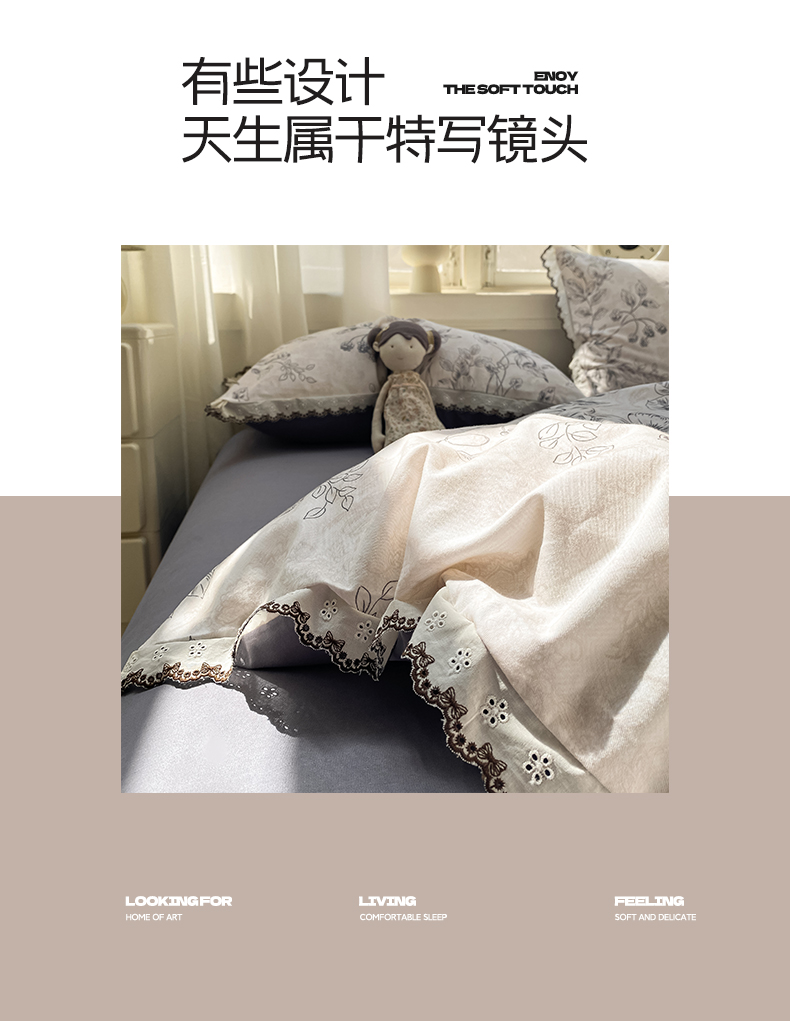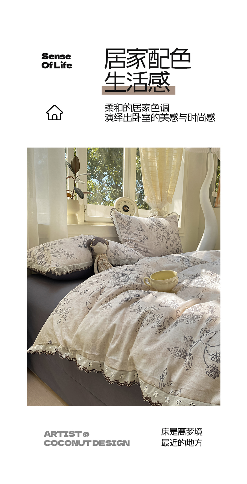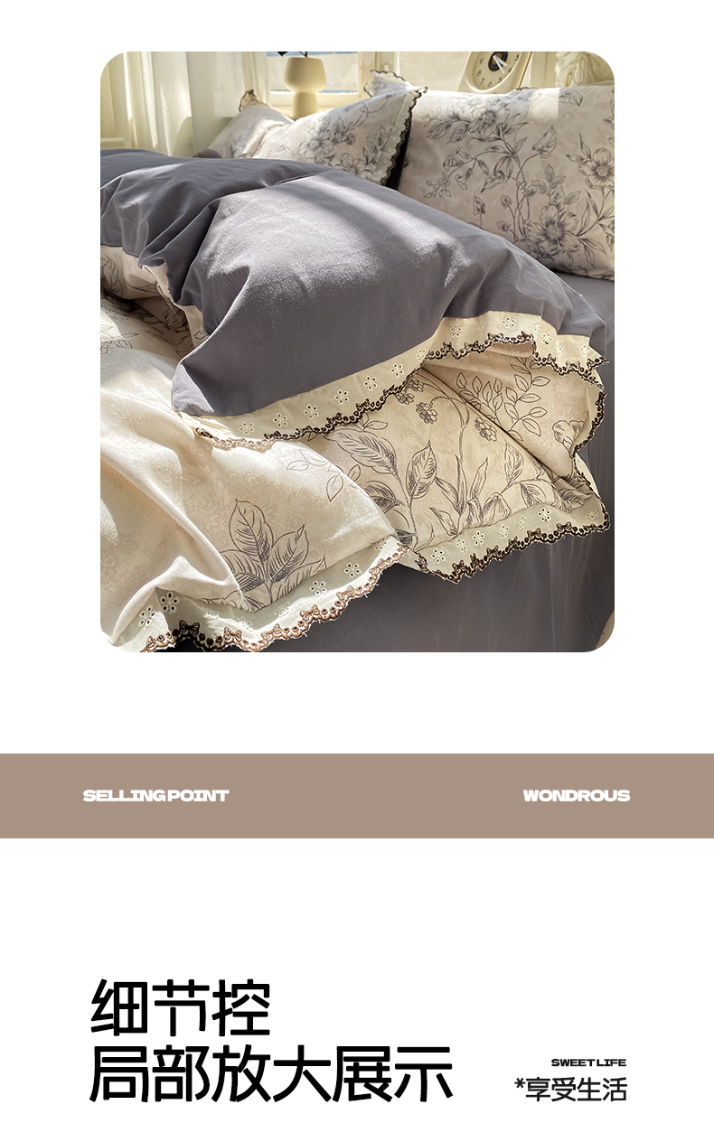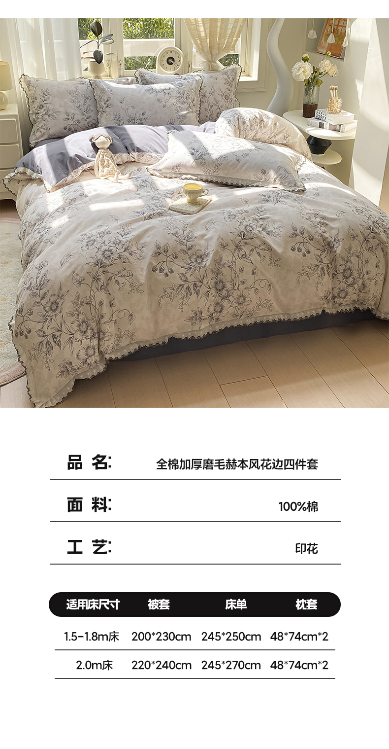 商品名称:慕希家纺 2025新款全棉纯棉加厚赫本风花边磨毛四件套 花禧-灰