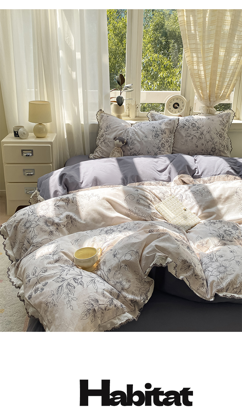 慕希家纺 2025新款全棉纯棉加厚赫本风花边磨毛四件套 花禧-灰