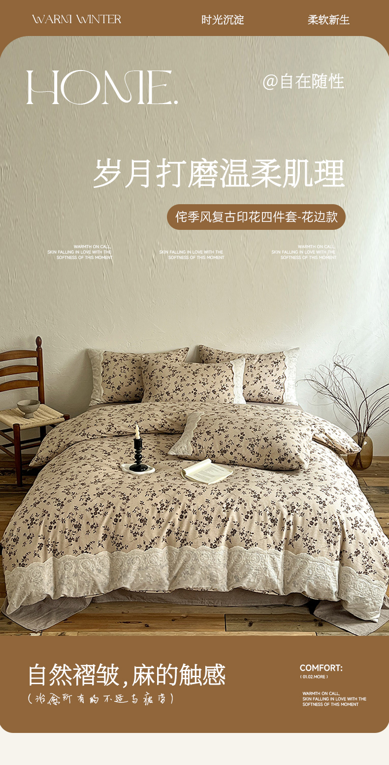 一比一家纺 2025秋冬新品高克重原麻复古全棉花边棉麻侘寂风原麻四件套 (控价99元) 茶里
