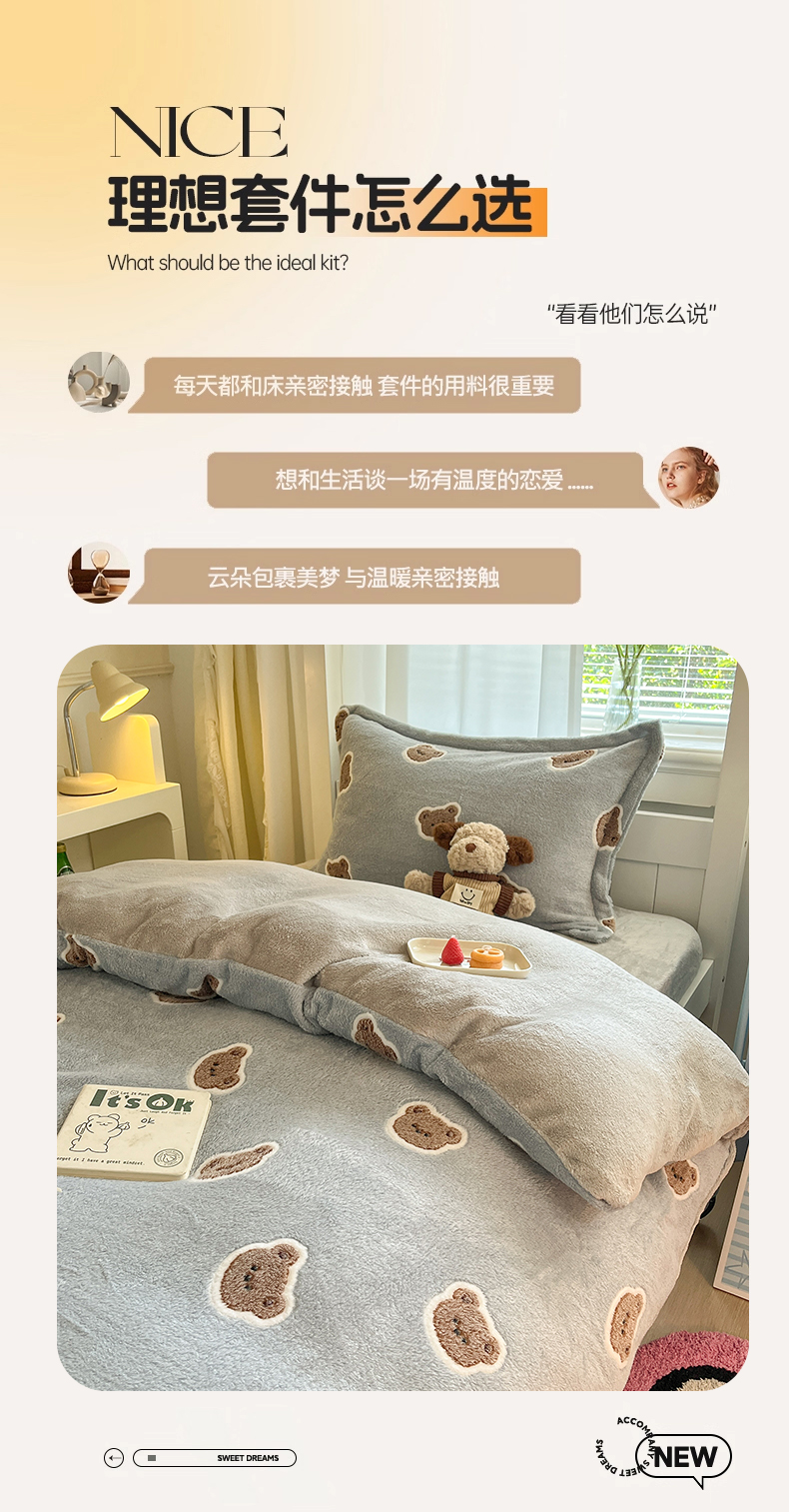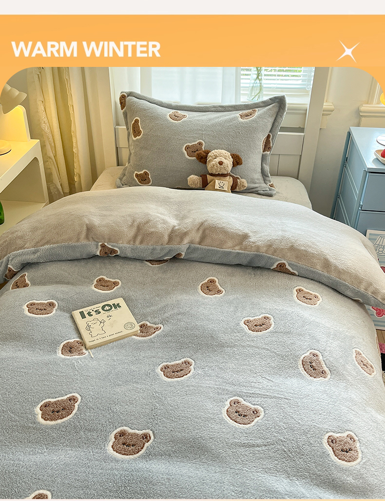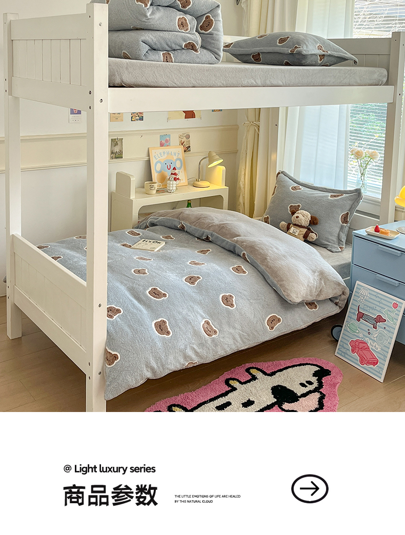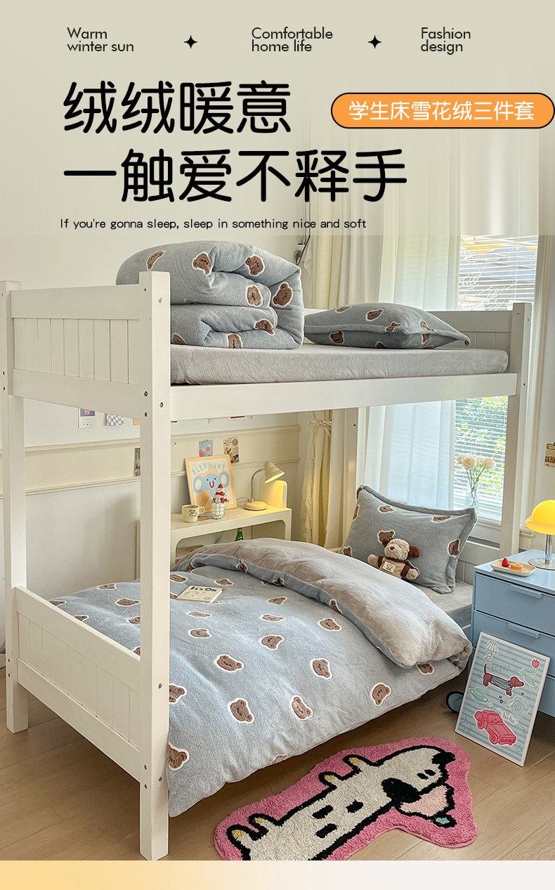 当前位置: 91家纺网 > 商品网购 > 床品套件 > 四件套 > 法莱绒四件套 > 川悦生活 2025新款立体雪花绒印花四件套学生床系列一场景二 波波熊