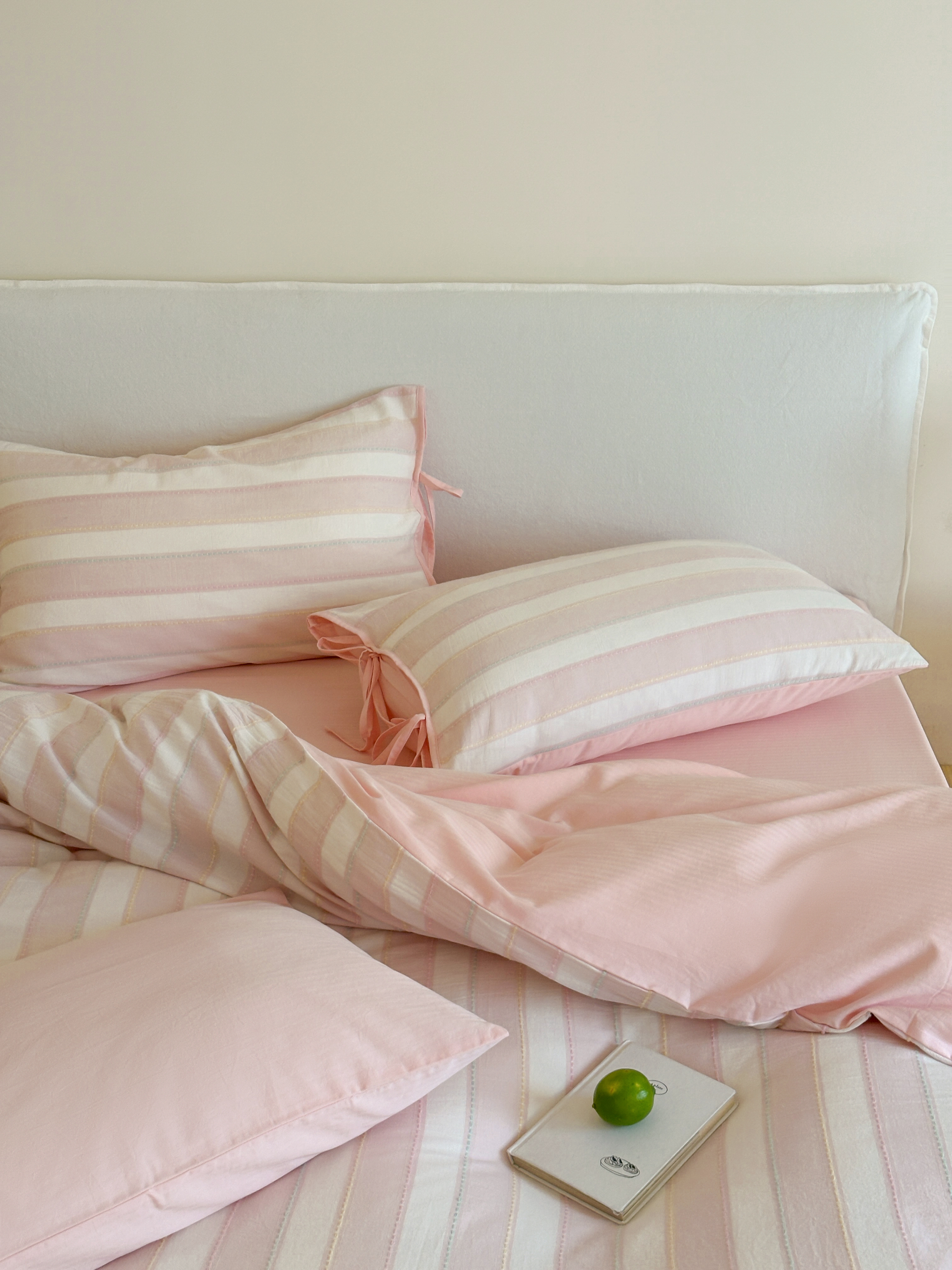 (总)小春日和 2025新款纯棉提花条纹四件套全棉简约民宿高端床品四件套水洗提花人字纹床单1.8床笠加大床单,喜又-粉,喜又-蓝