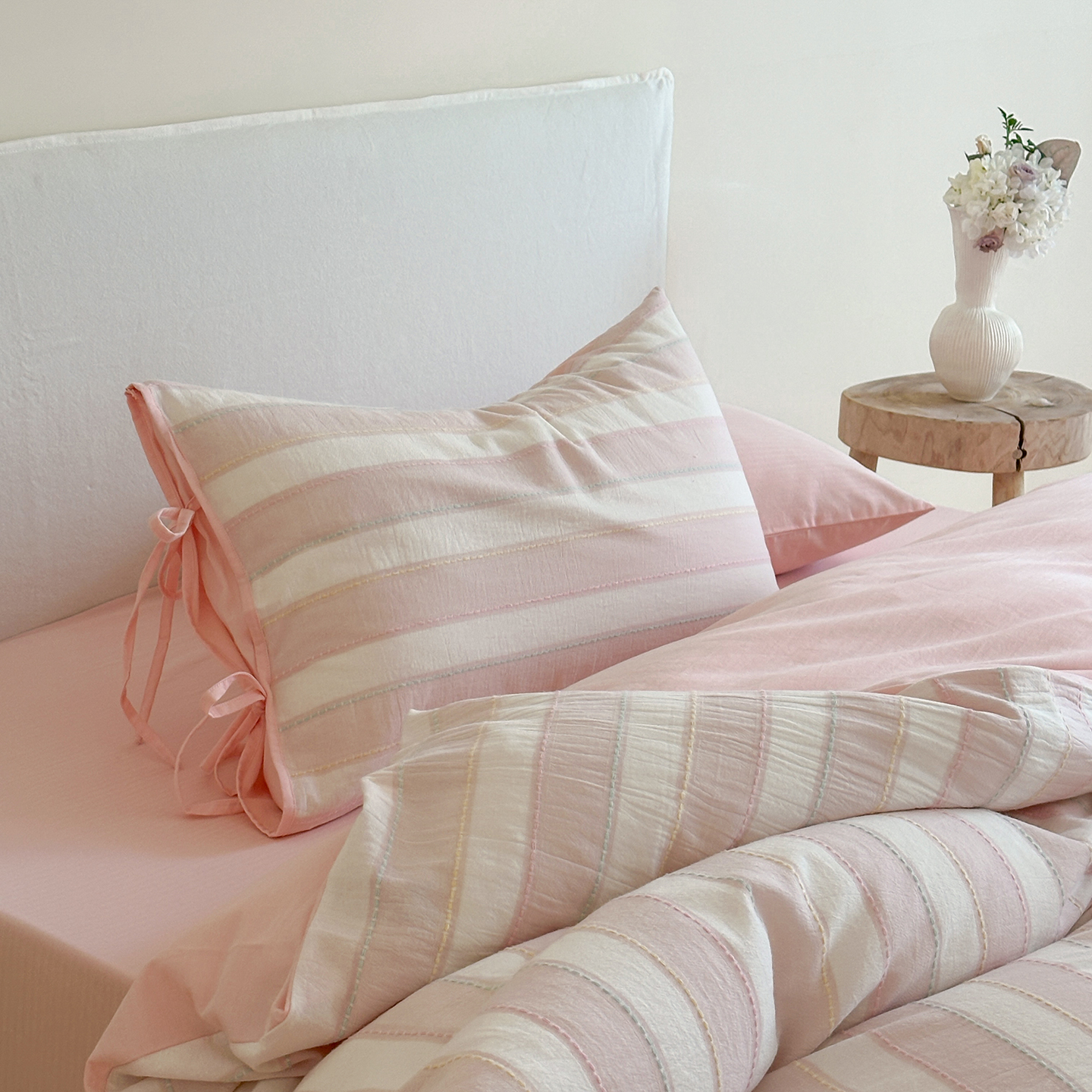 商品名称:(总)小春日和 2025新款纯棉水洗提花四件套全棉中性风三件套穿绳工艺被套民宿床单加大被套1.8纯色床笠-醒春系列