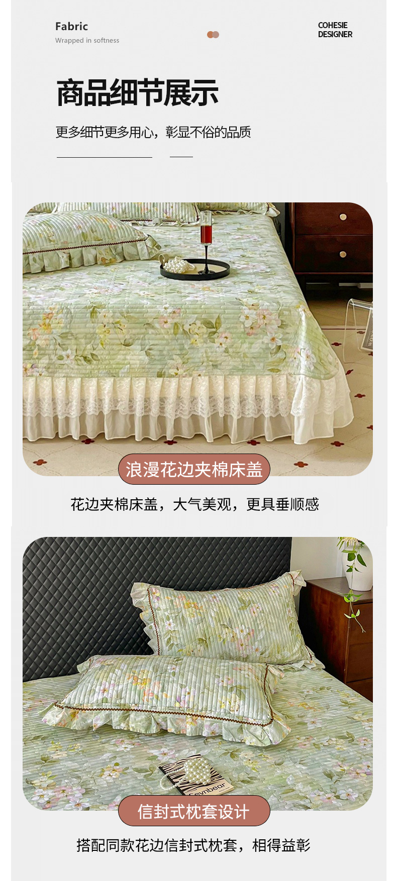 商品名称:胜权家纺 2025秋冬新款全棉法式13372数码印花夹棉床盖四件套系列 花海绿