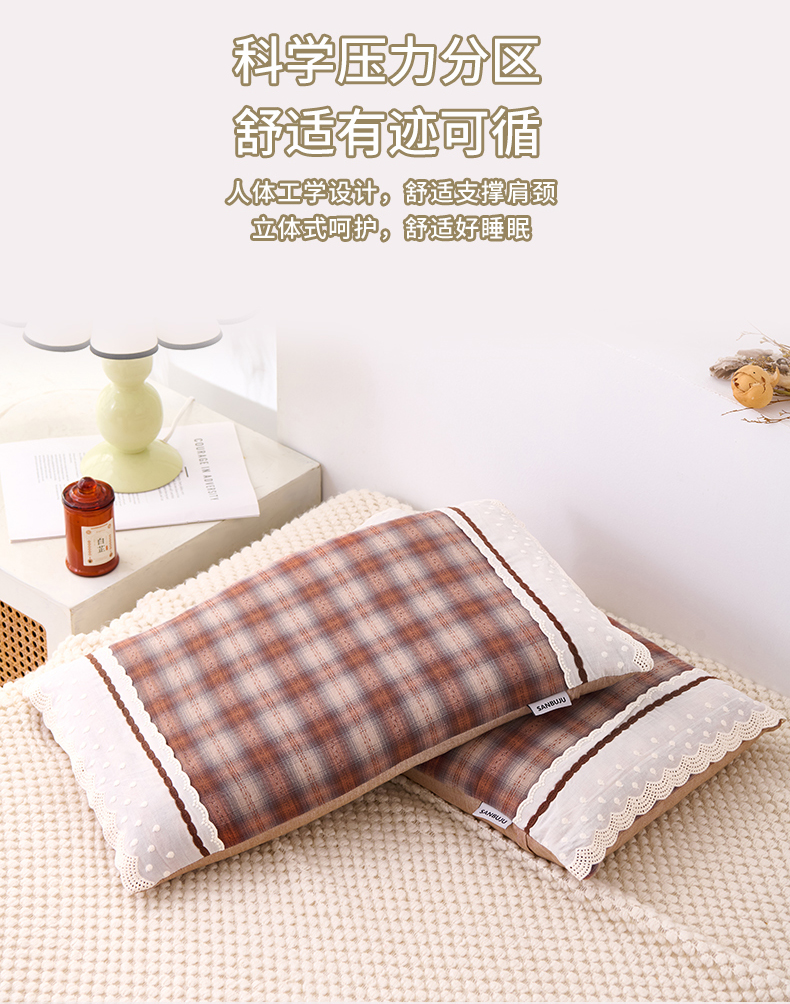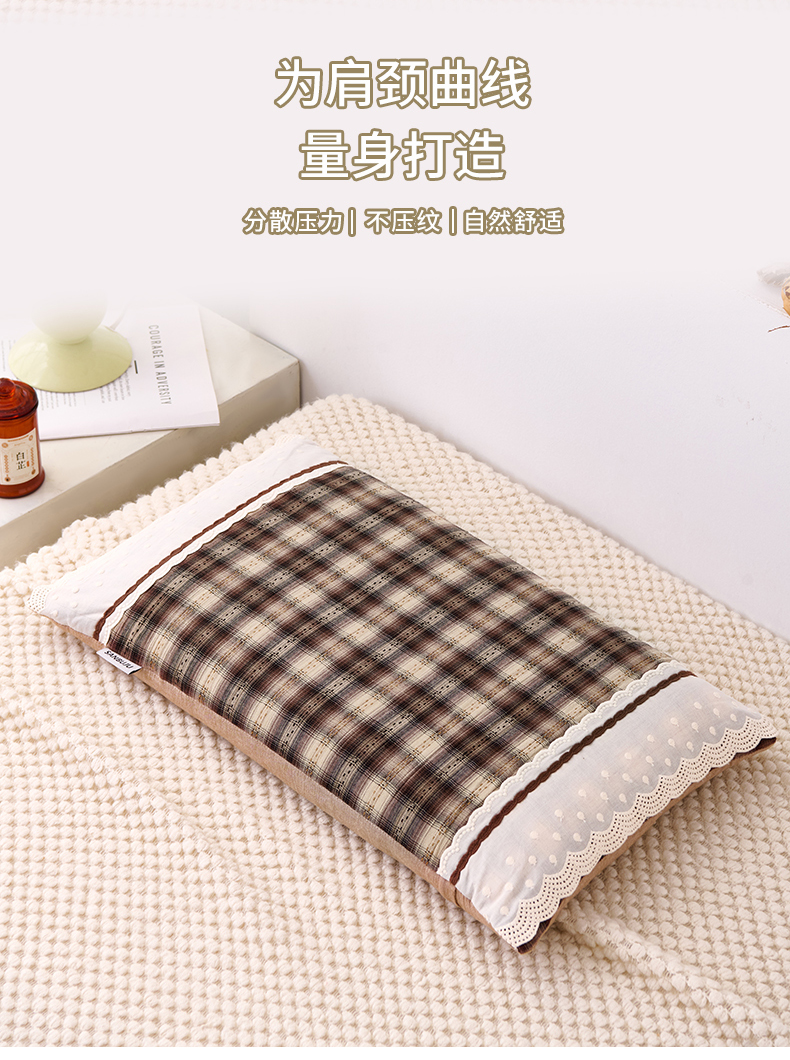 商品名称:大熊枕芯 2025新款 全棉花边荞麦枕 格子花边-卡其
