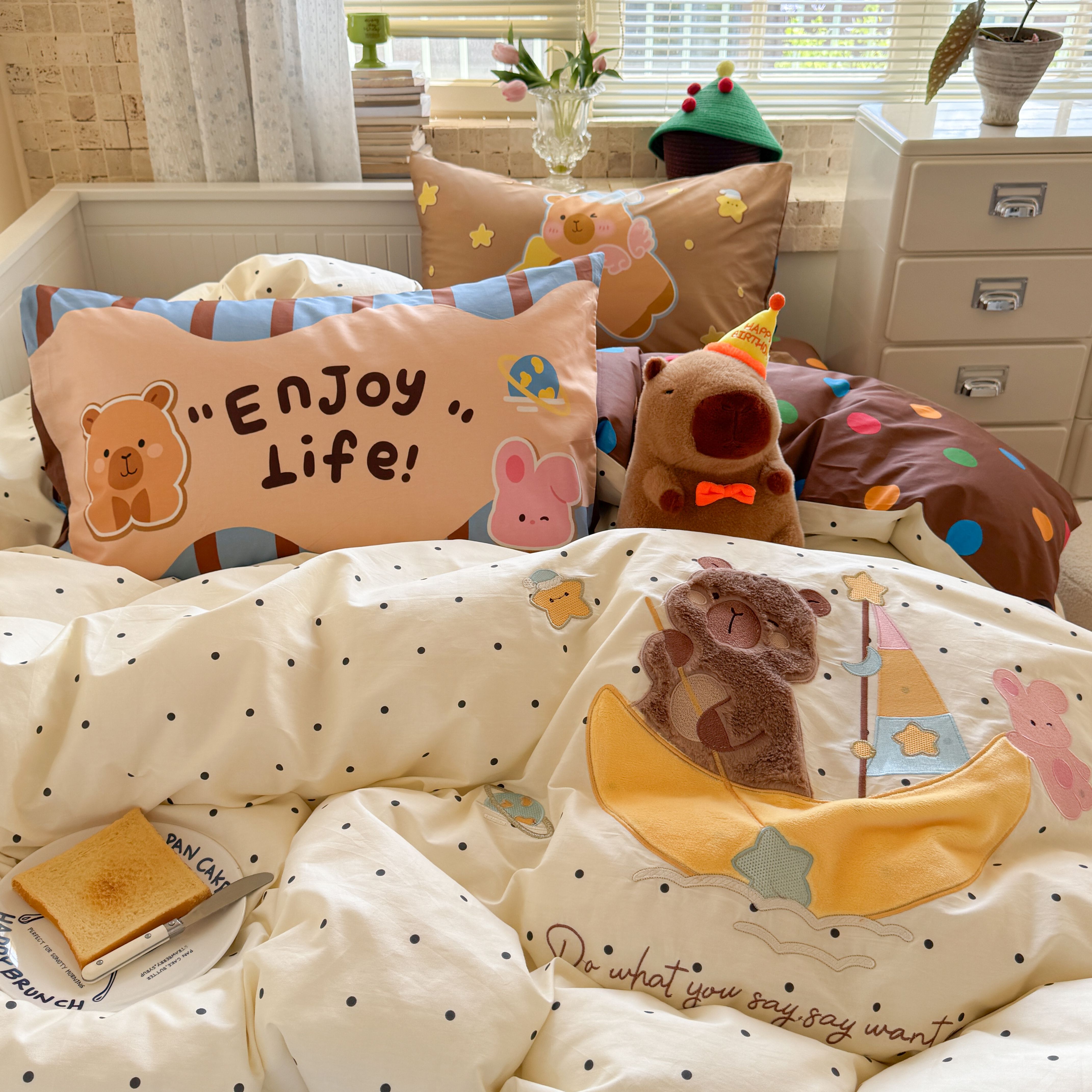 (总)柚子YOUTH 2025新款全棉A类母婴级卡通绣花四件套,吹泡泡,汉堡小猫,马上有钱,女孩的礼物,小狗面包,月亮船