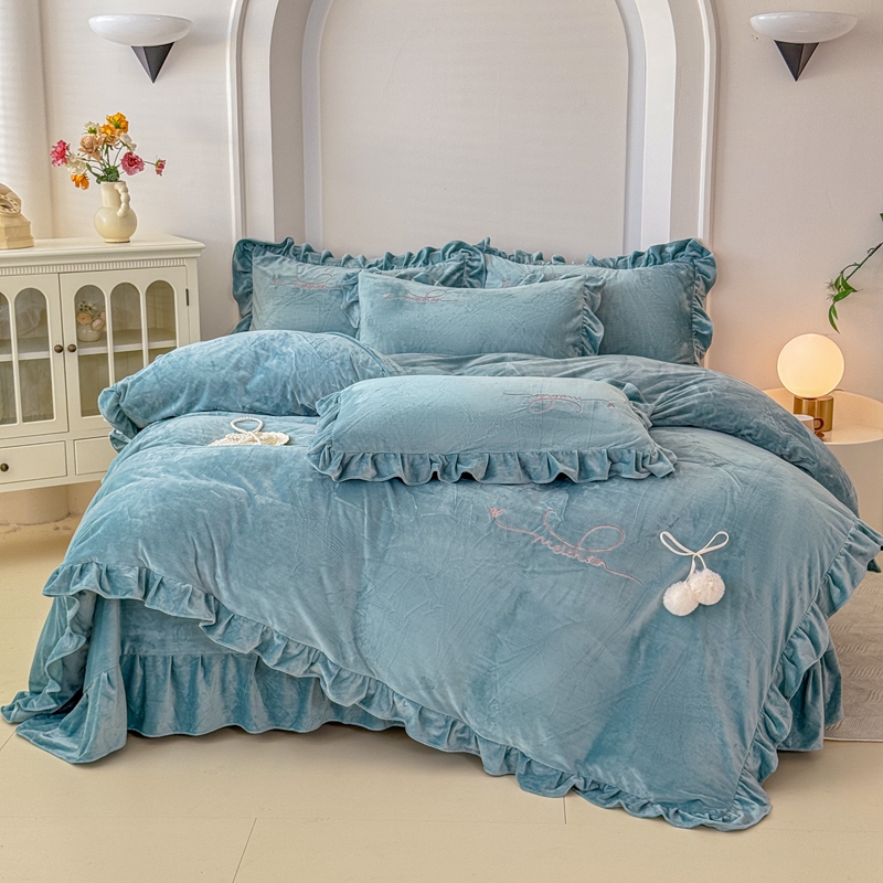 (总)恋尚羽家纺 2025新款韩版花边婴儿绒大床盖四件套宝宝绒婴肤绒公主风韩式盘花四件套,大红色,豆沙,湖蓝色,灰色,桔色,墨绿,紫色