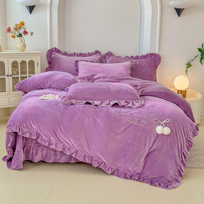 恋尚羽家纺 2025新款韩版花边婴儿绒绣花大床裙四件套宝宝绒婴肤绒公主风韩式 紫色