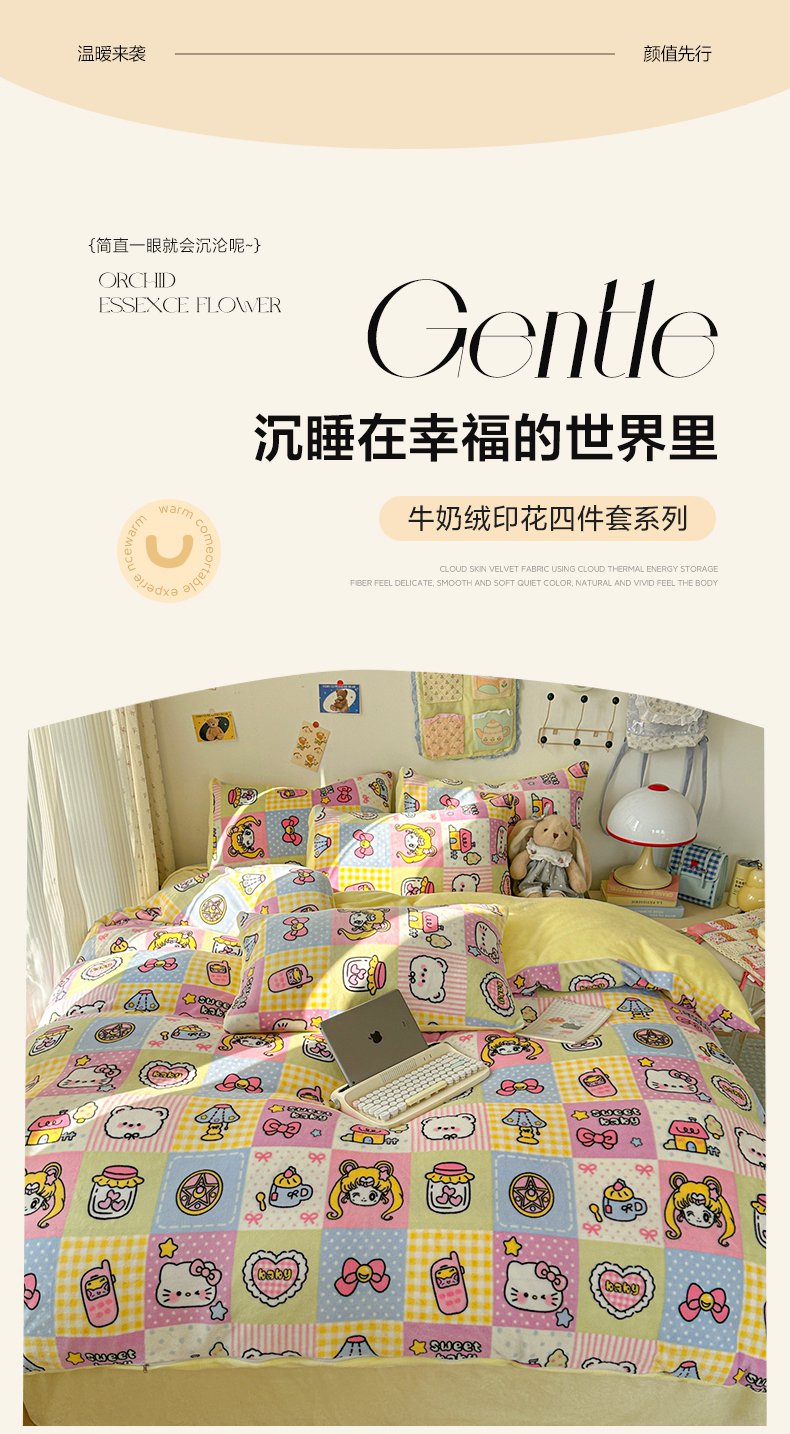 韩巢家纺 2025新款高克重印花牛奶绒床品四件套 爱心小樱桃,爱心小樱桃