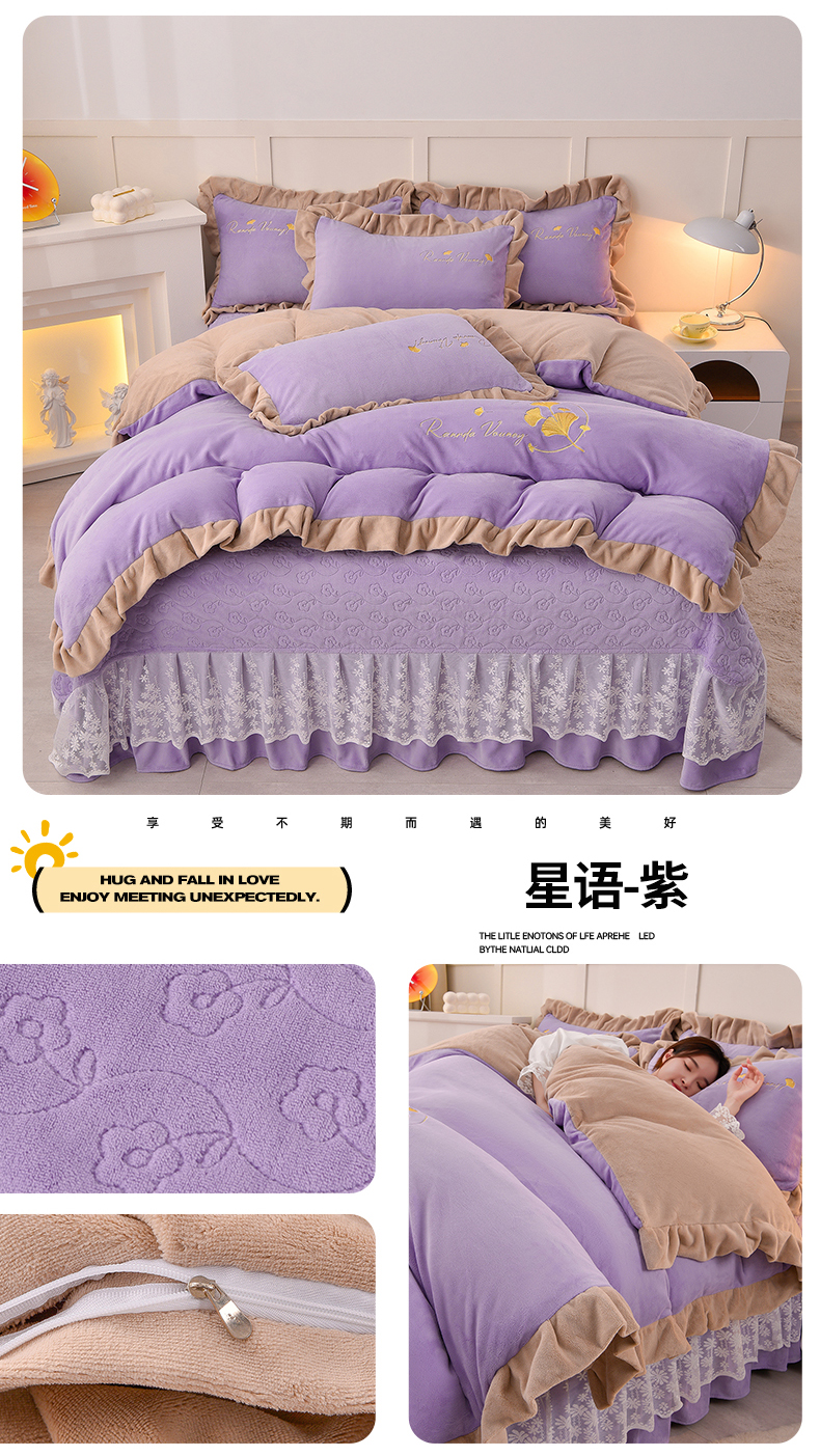 湘雪家居 2025新款高克重纯色刺绣牛奶绒床盖款星语系列四件套-提供买家秀 星语款-熏韵紫