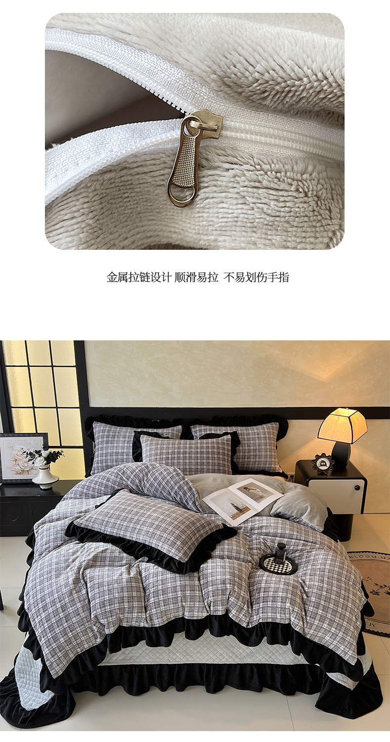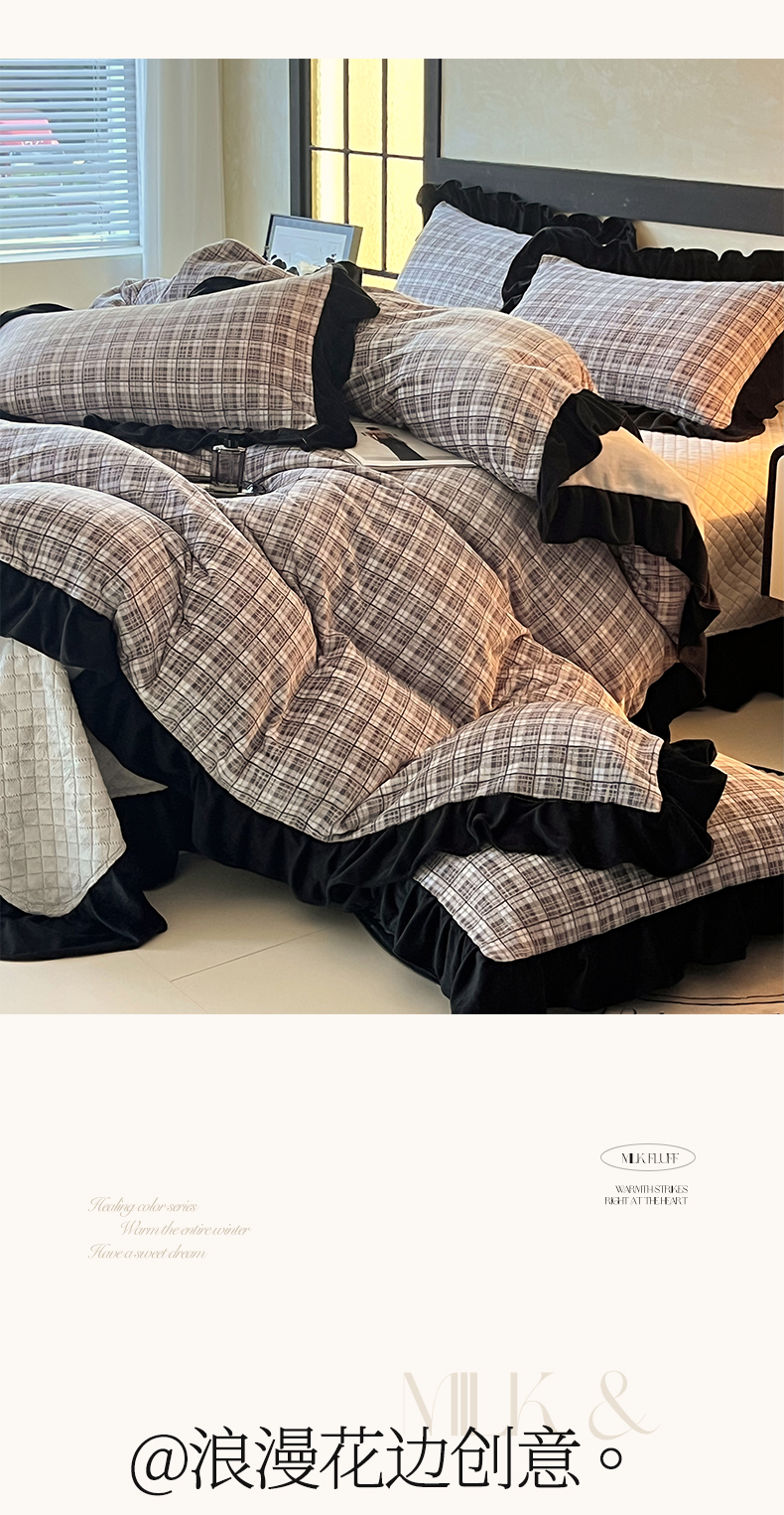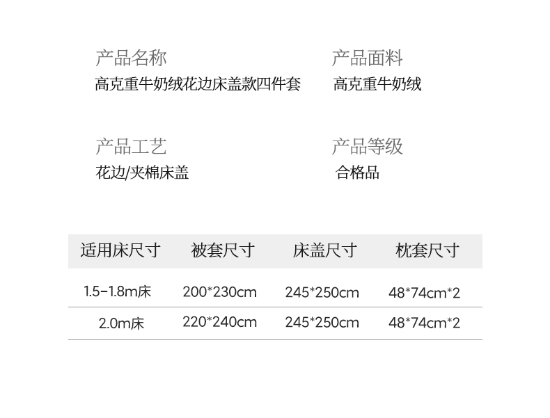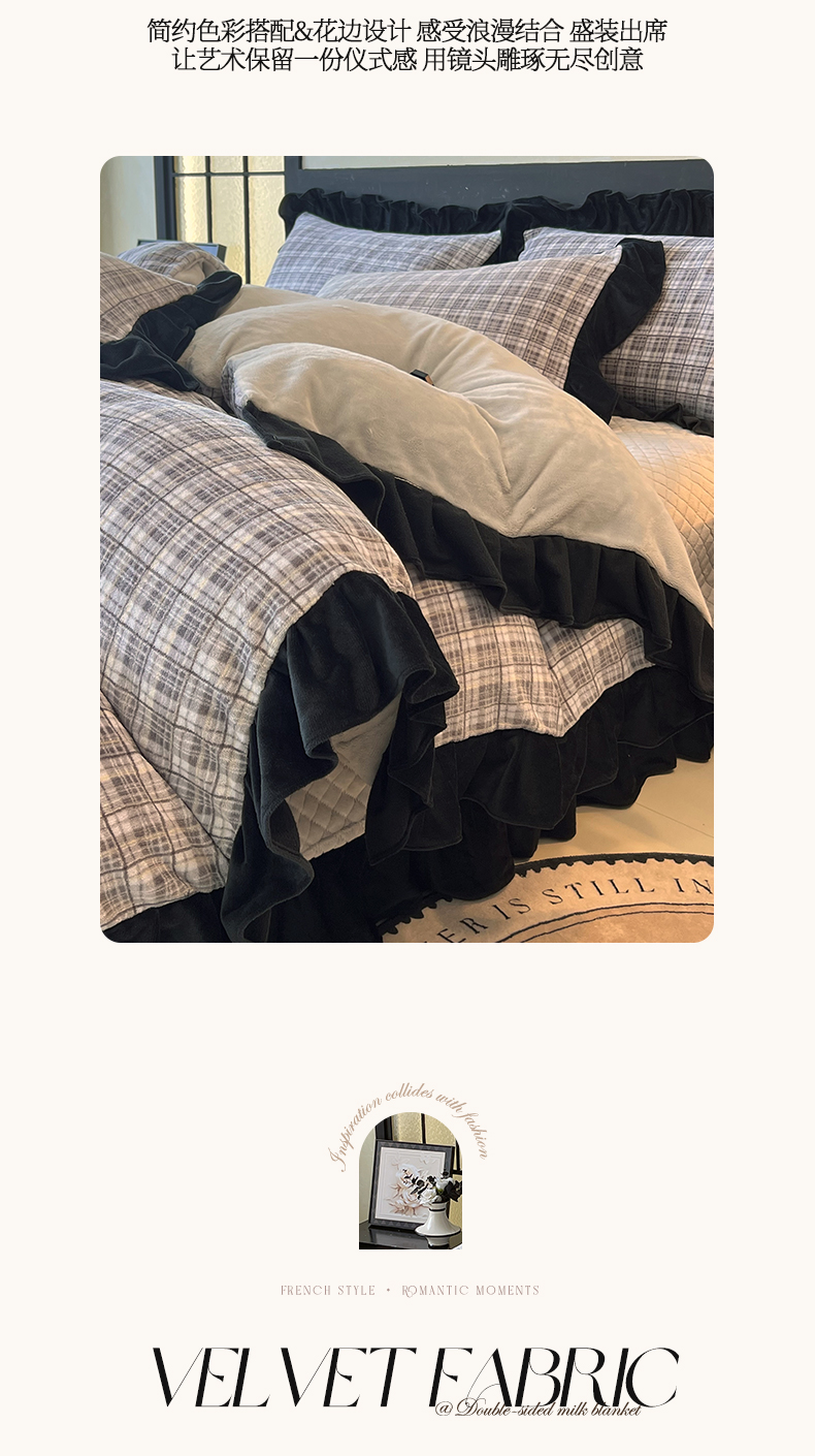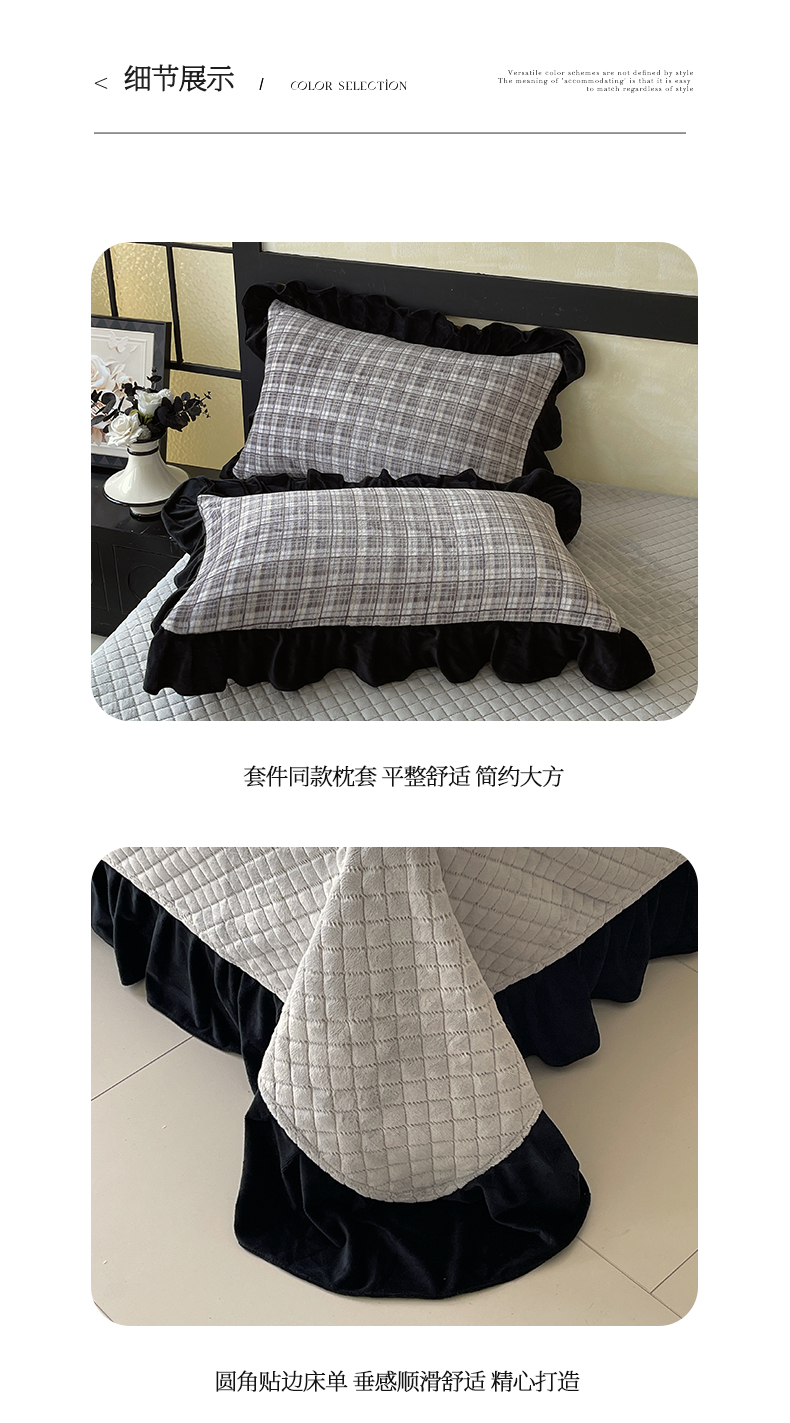 商品名称:慕希家纺 2025新款高克重牛奶绒花边床盖款四件套-格律时尚 格律时尚-灰
