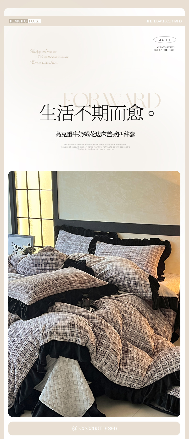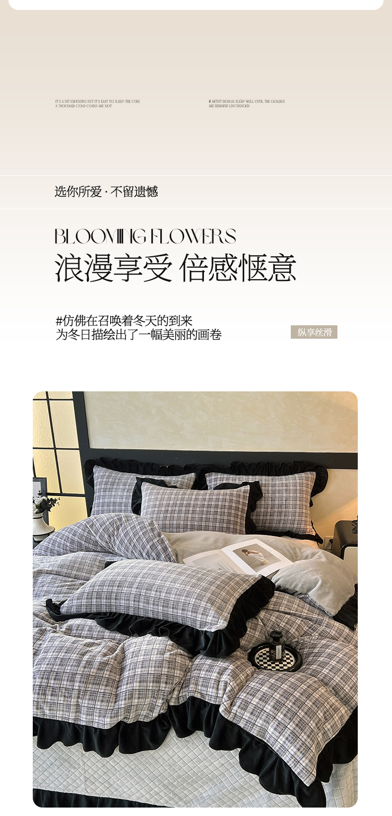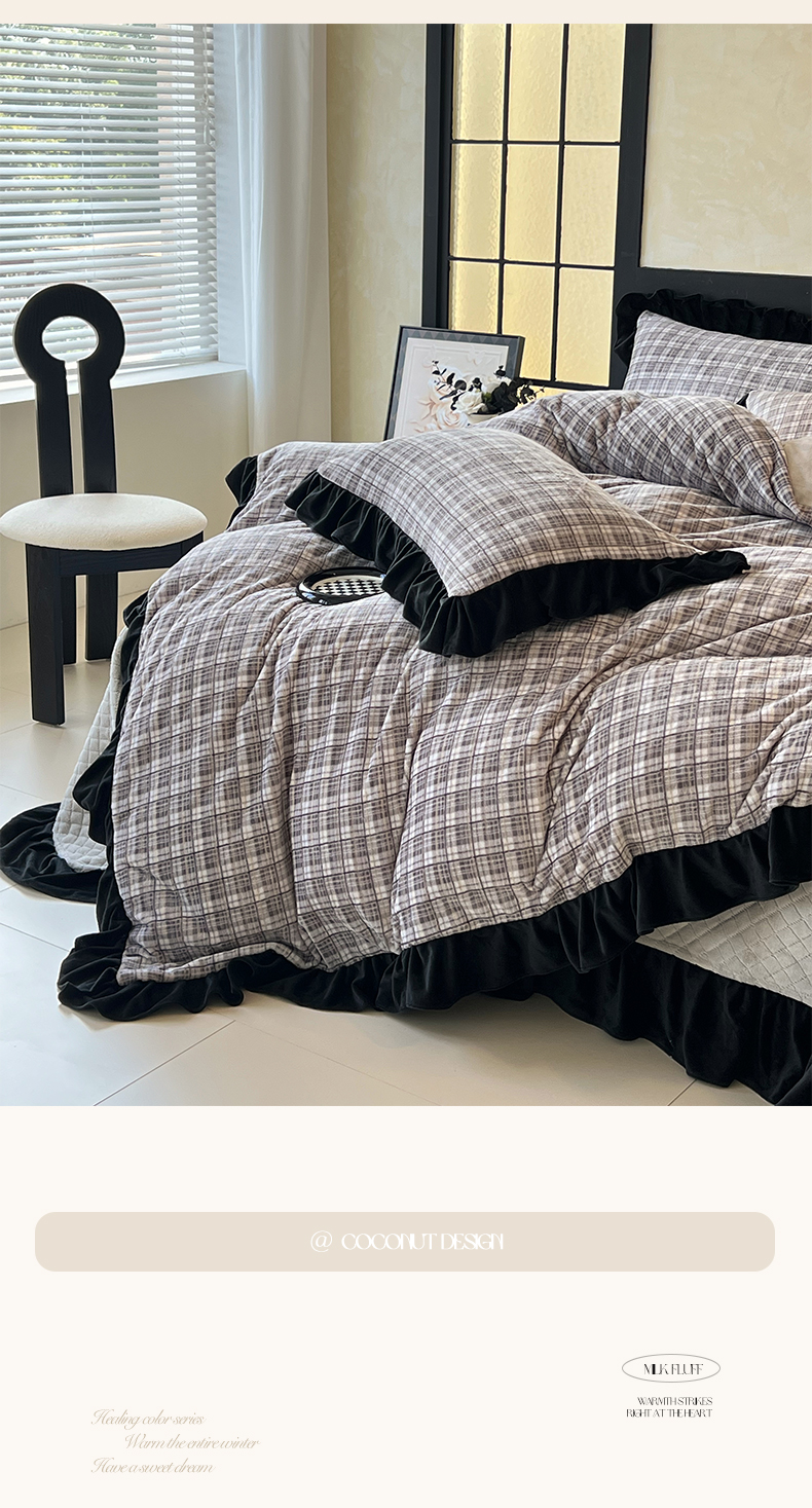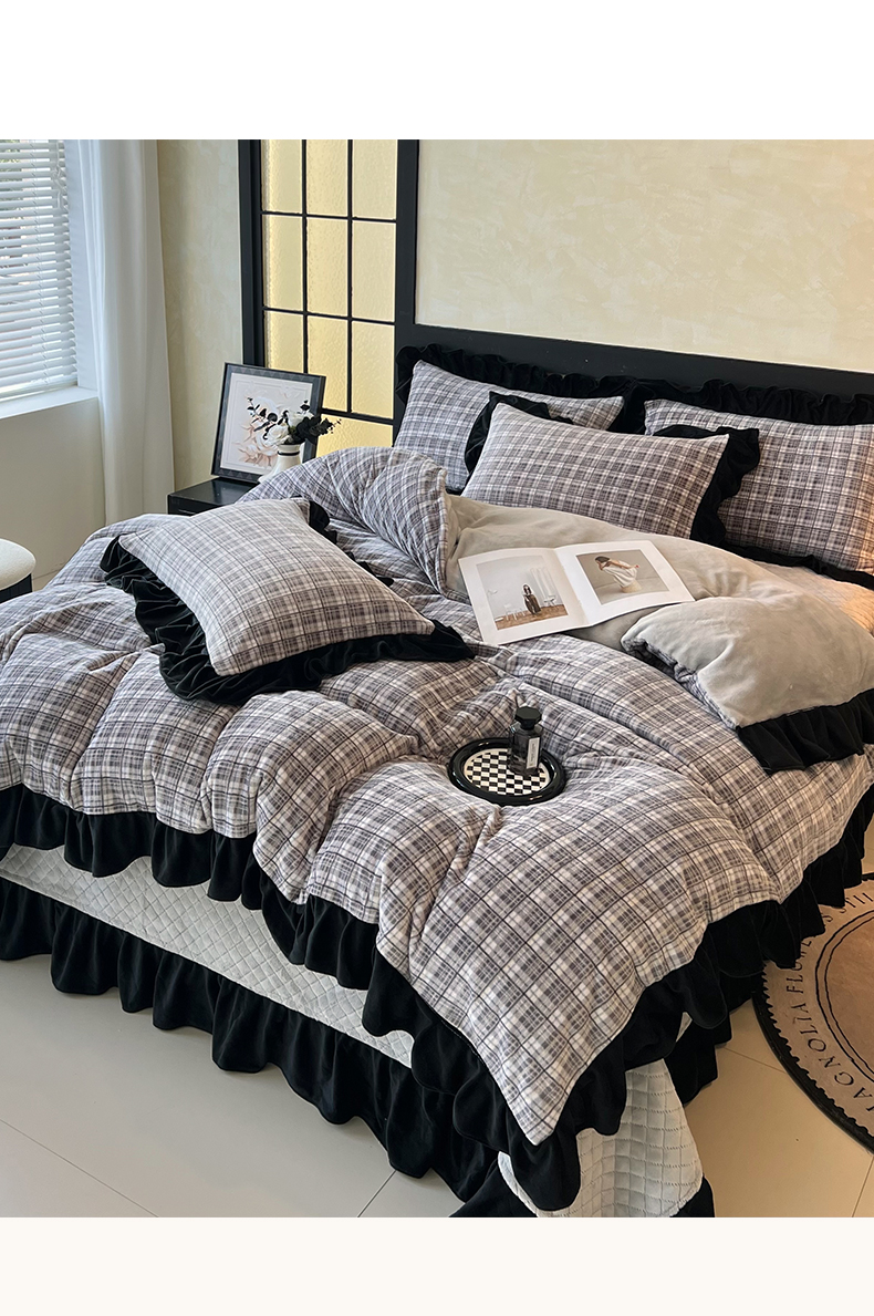 商品名称:慕希家纺 2025新款高克重牛奶绒花边床盖款四件套-格律时尚 格律时尚-灰