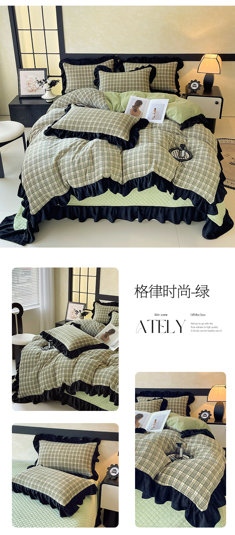 (总)慕希家纺 2025新款高克重牛奶绒花边床盖款四件套-格律时尚,格律时尚-红,格律时尚-灰,格律时尚-咖,格律时尚-蓝,格律时尚-绿