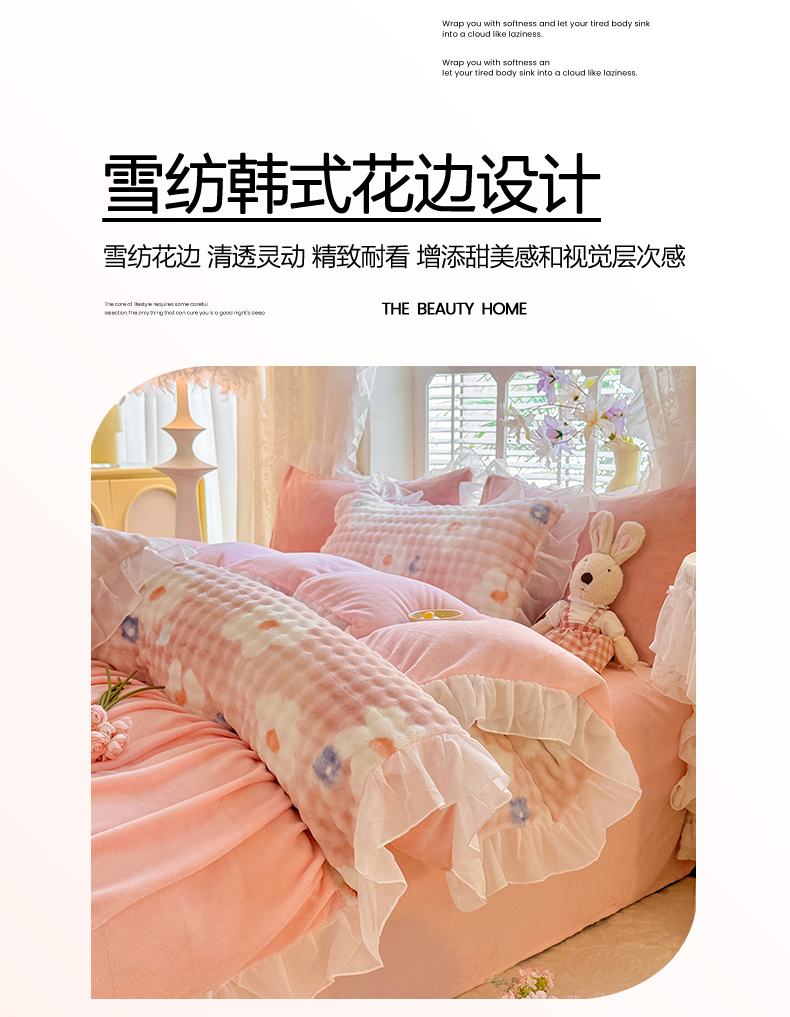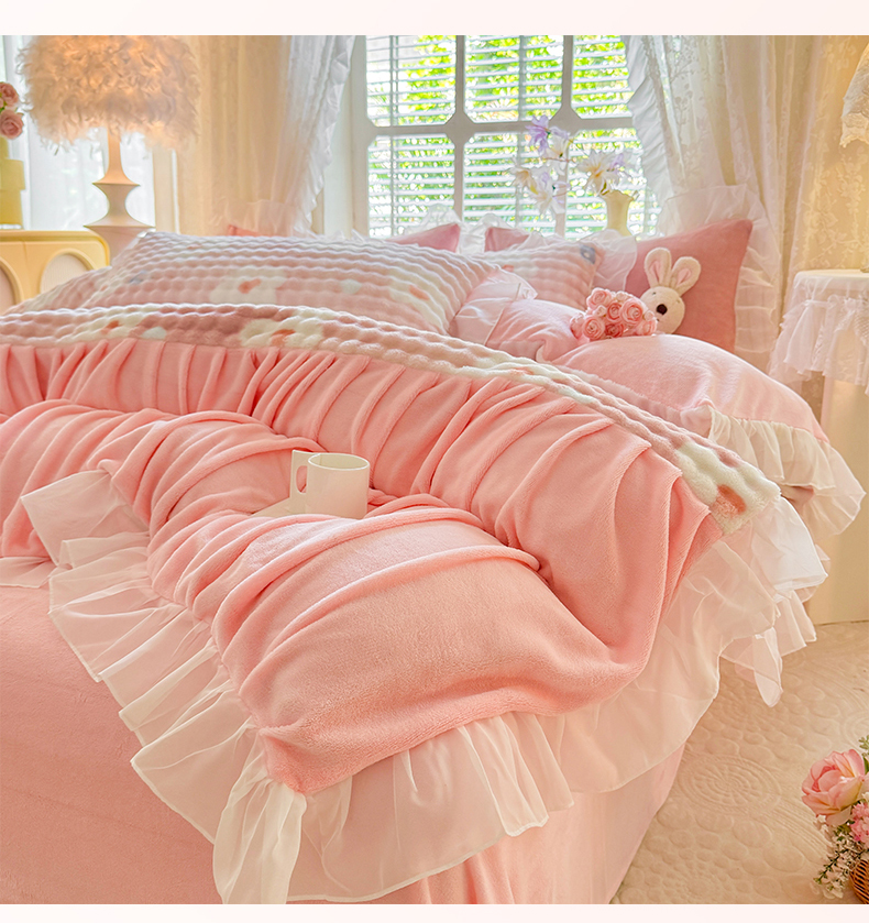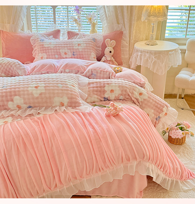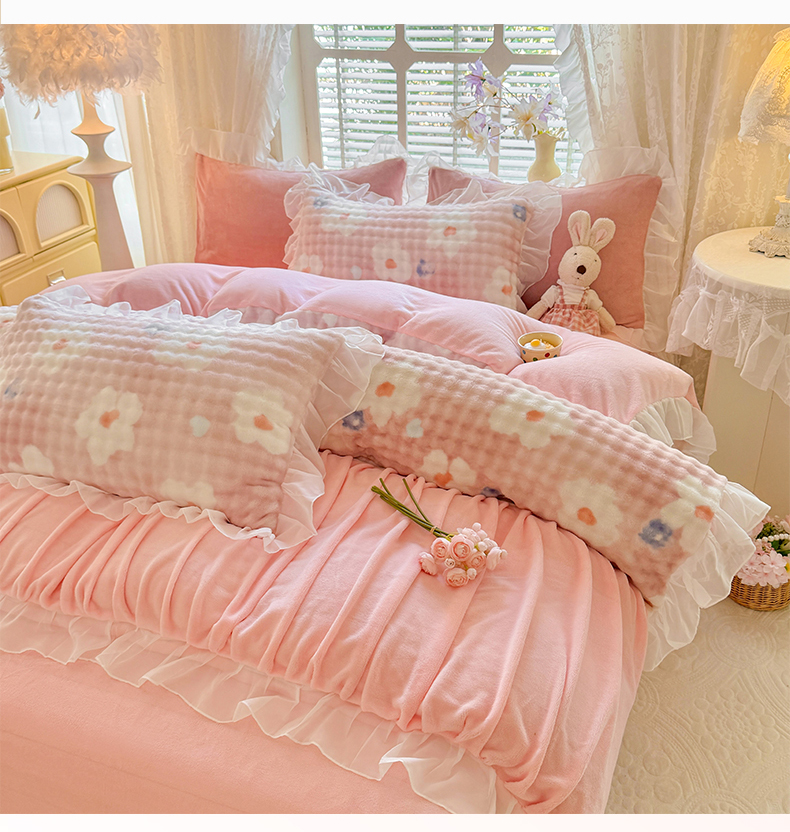 艾米家居 2025秋冬新款牛奶绒泡泡印花花边四件套 豆沙条纹粉