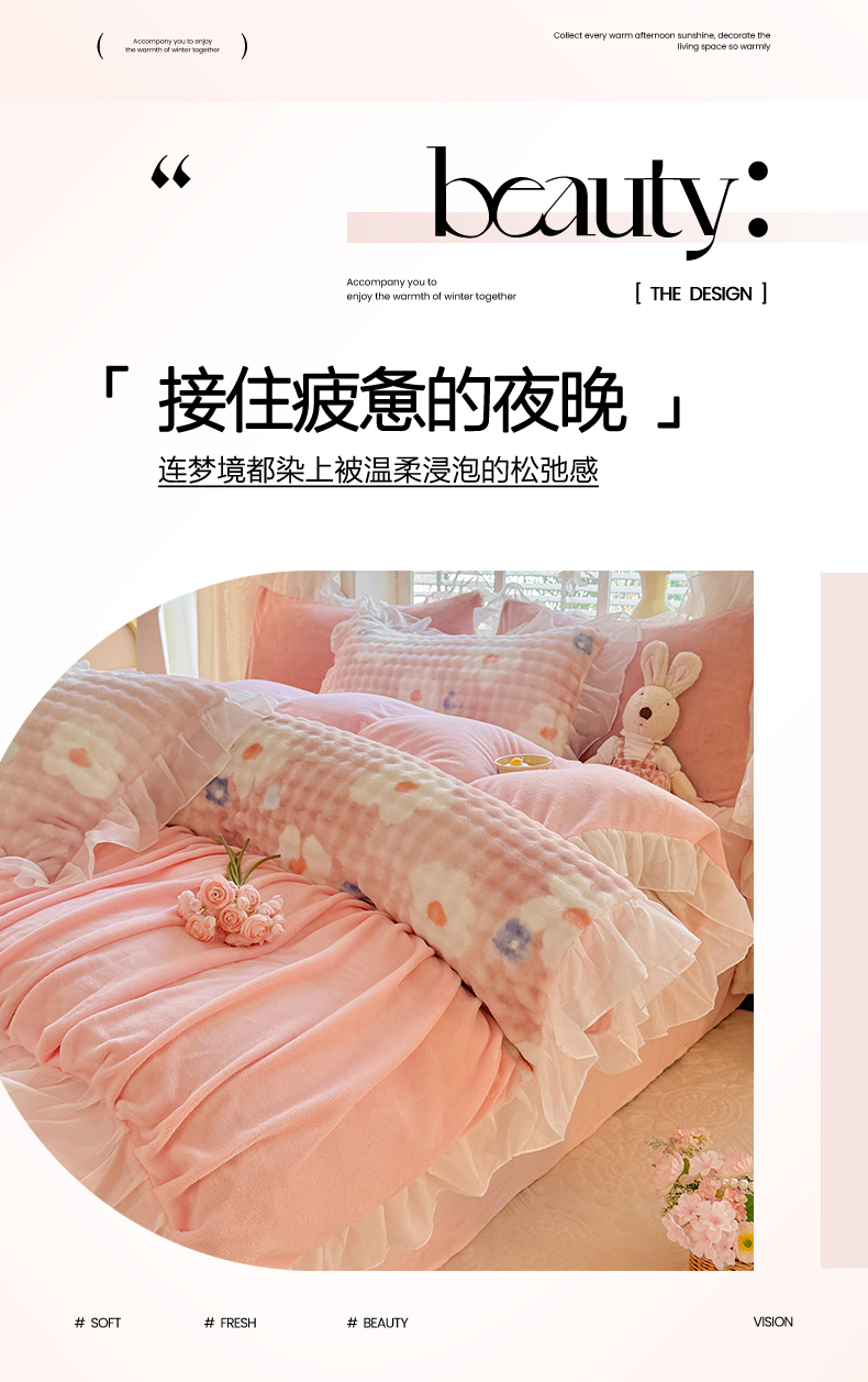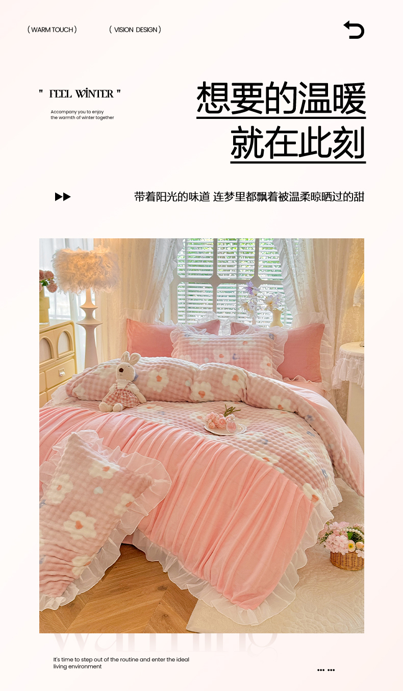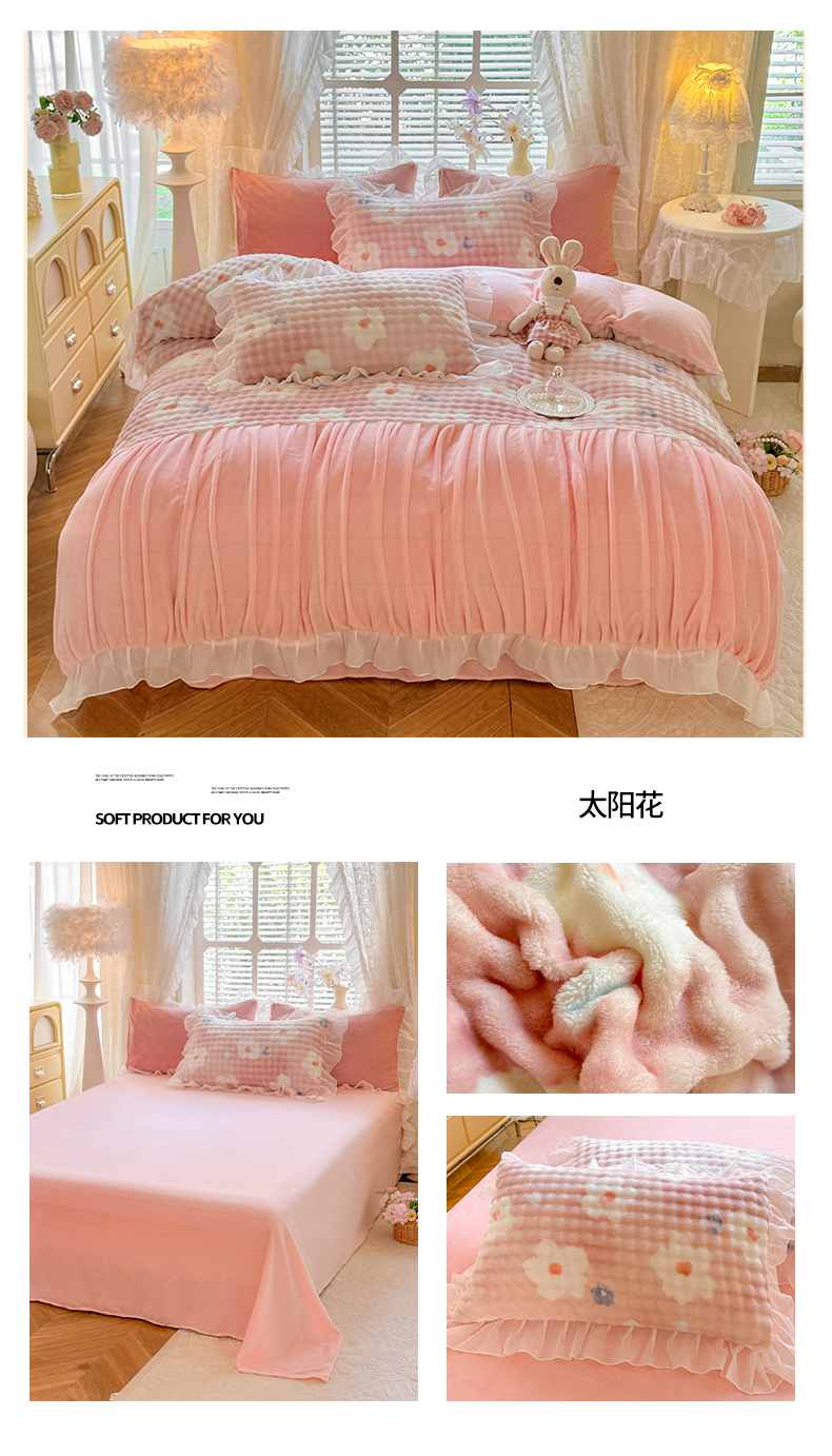 (总)艾米家居 2025秋冬新款牛奶绒泡泡印花花边四件套,豆沙条纹粉,蝴蝶花,太阳花