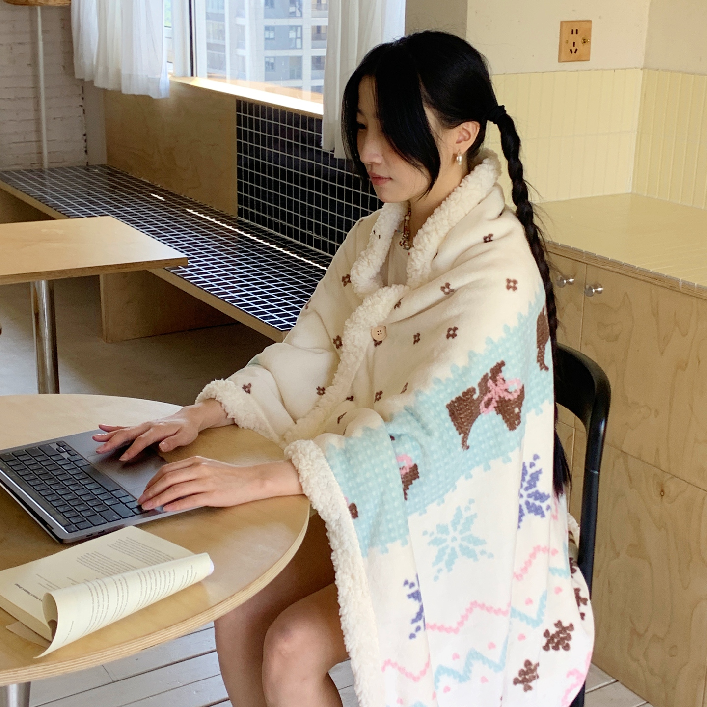 商品名称:桃喜 2025秋冬新款加厚牛奶绒羊羔绒披肩毯 绿苹果小猫(羊羔绒披肩毯)