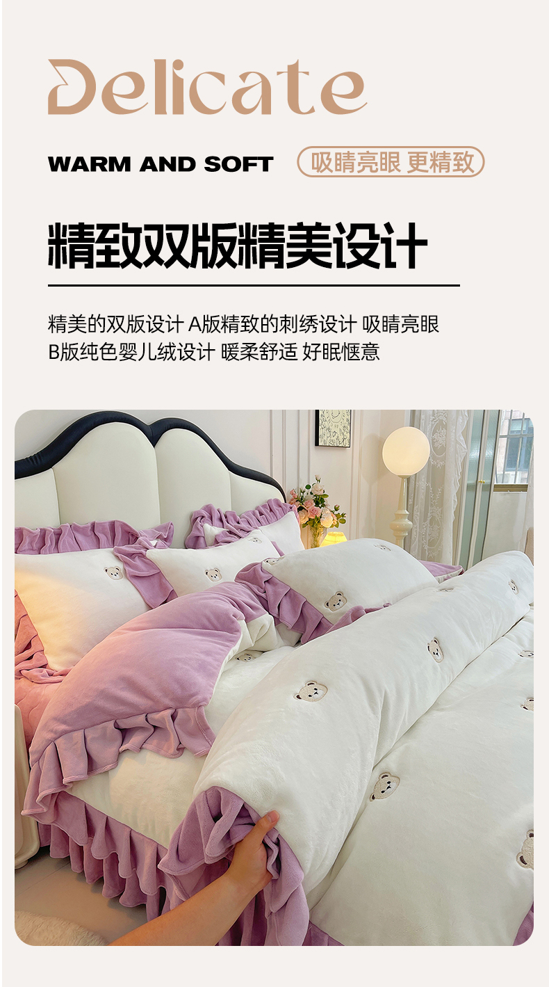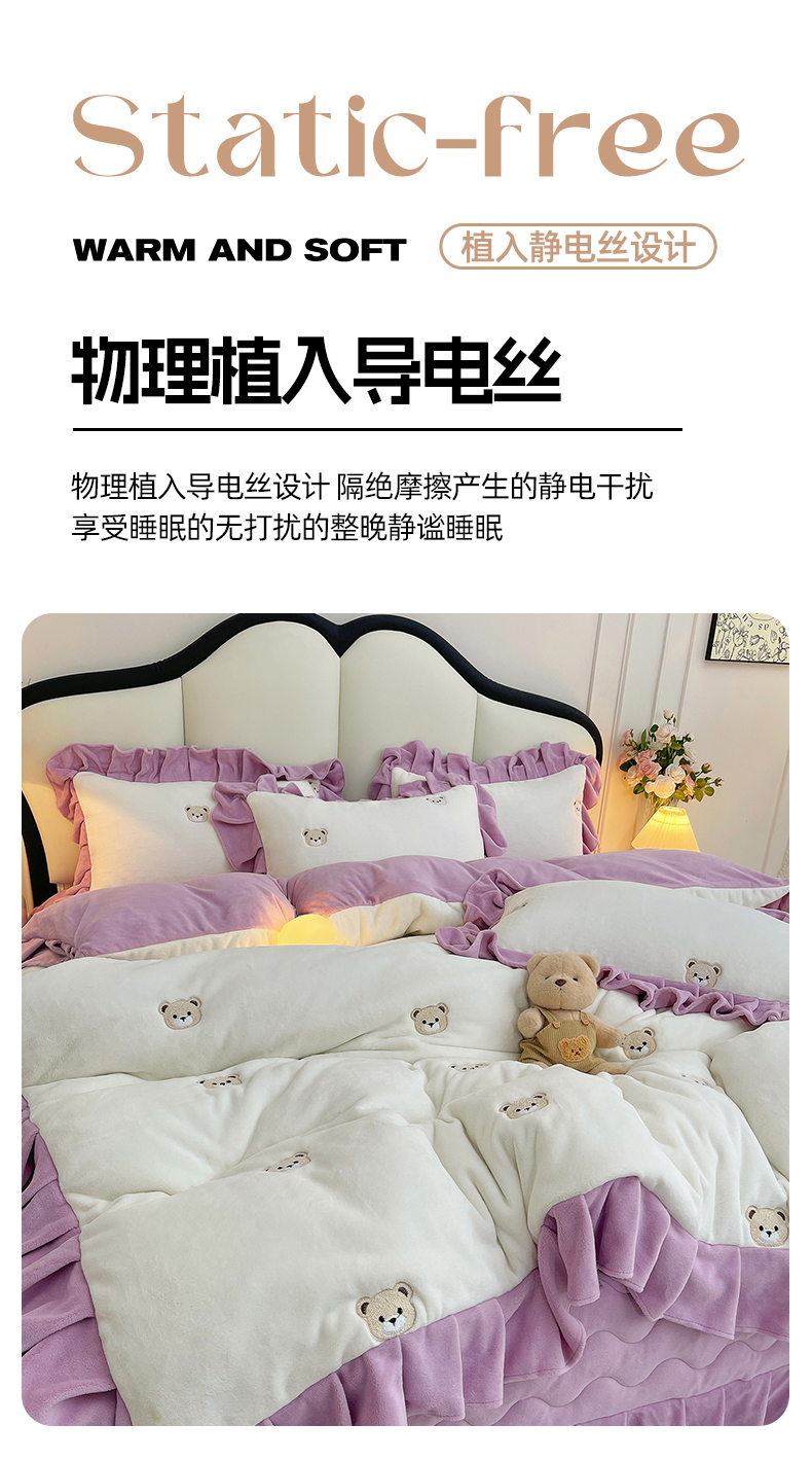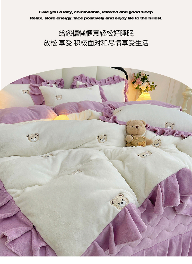 商品名称:茉保家纺 2025新款高克重9.5斤婴儿绒牛奶绒绣花夹棉床盖四件套 小熊-白拼紫