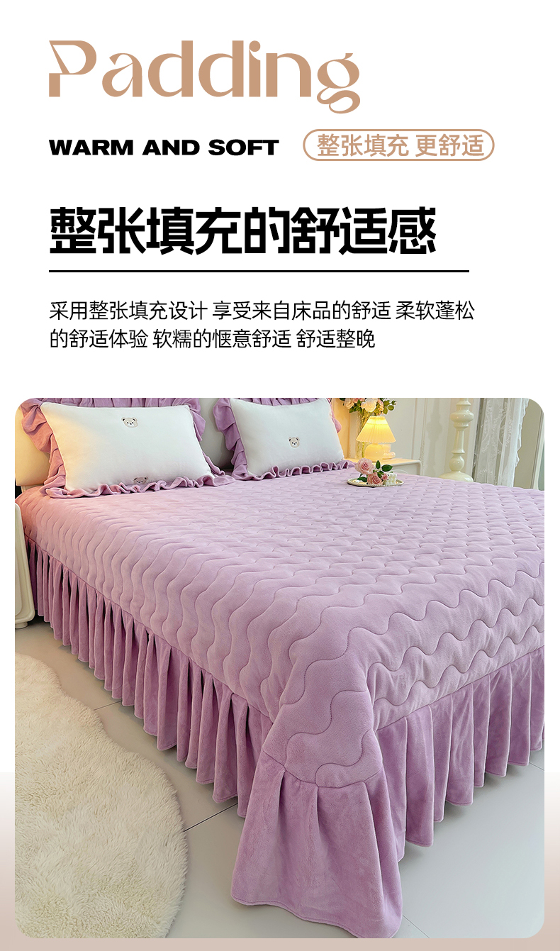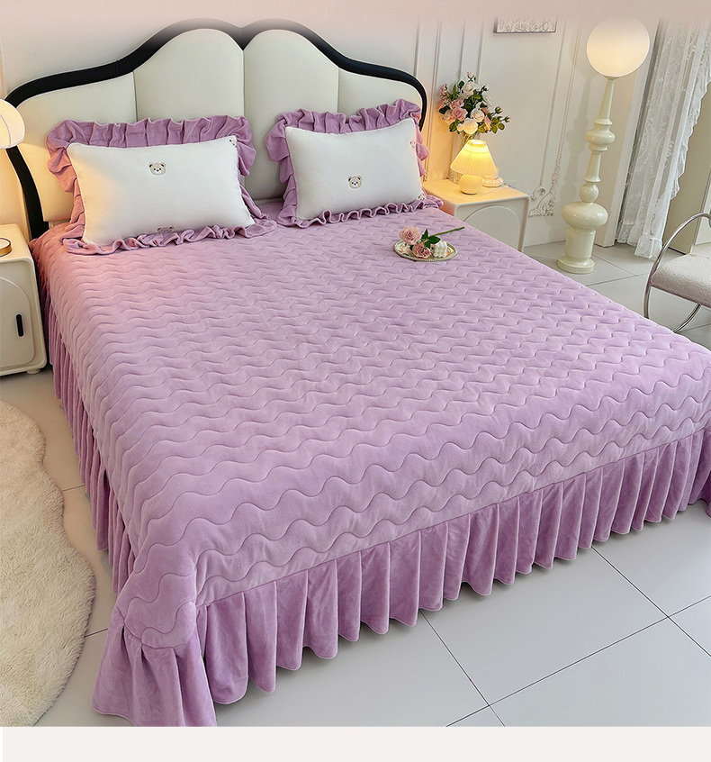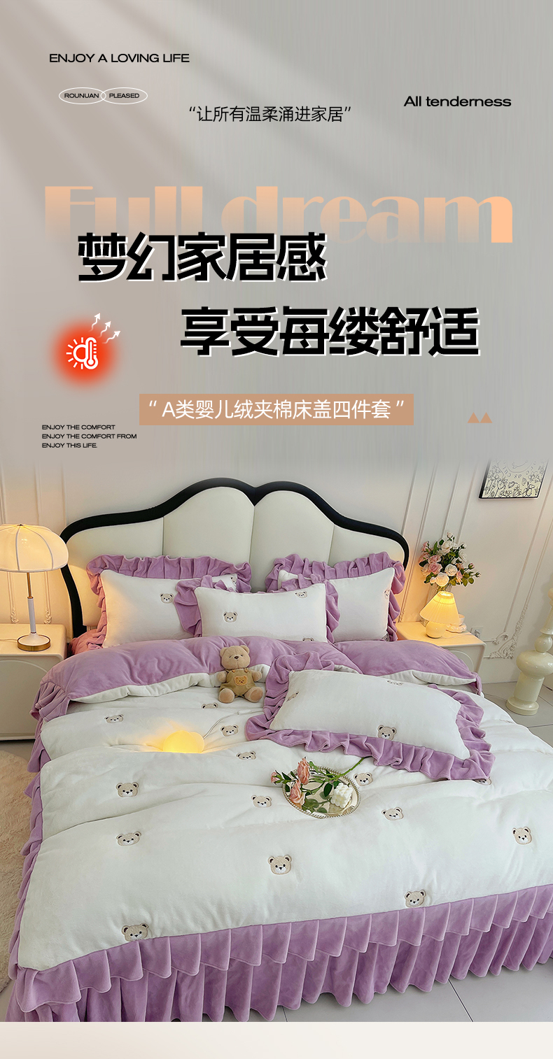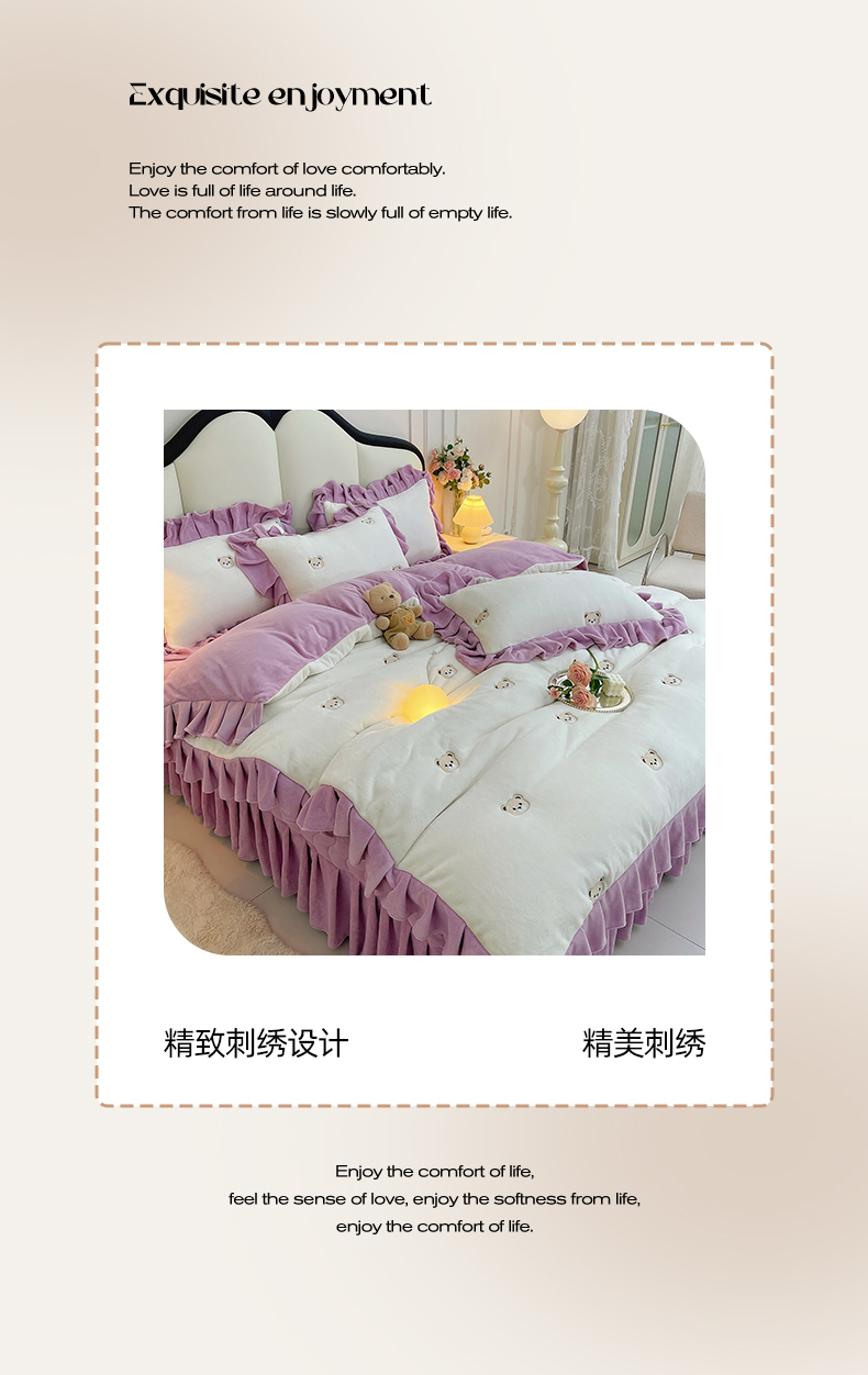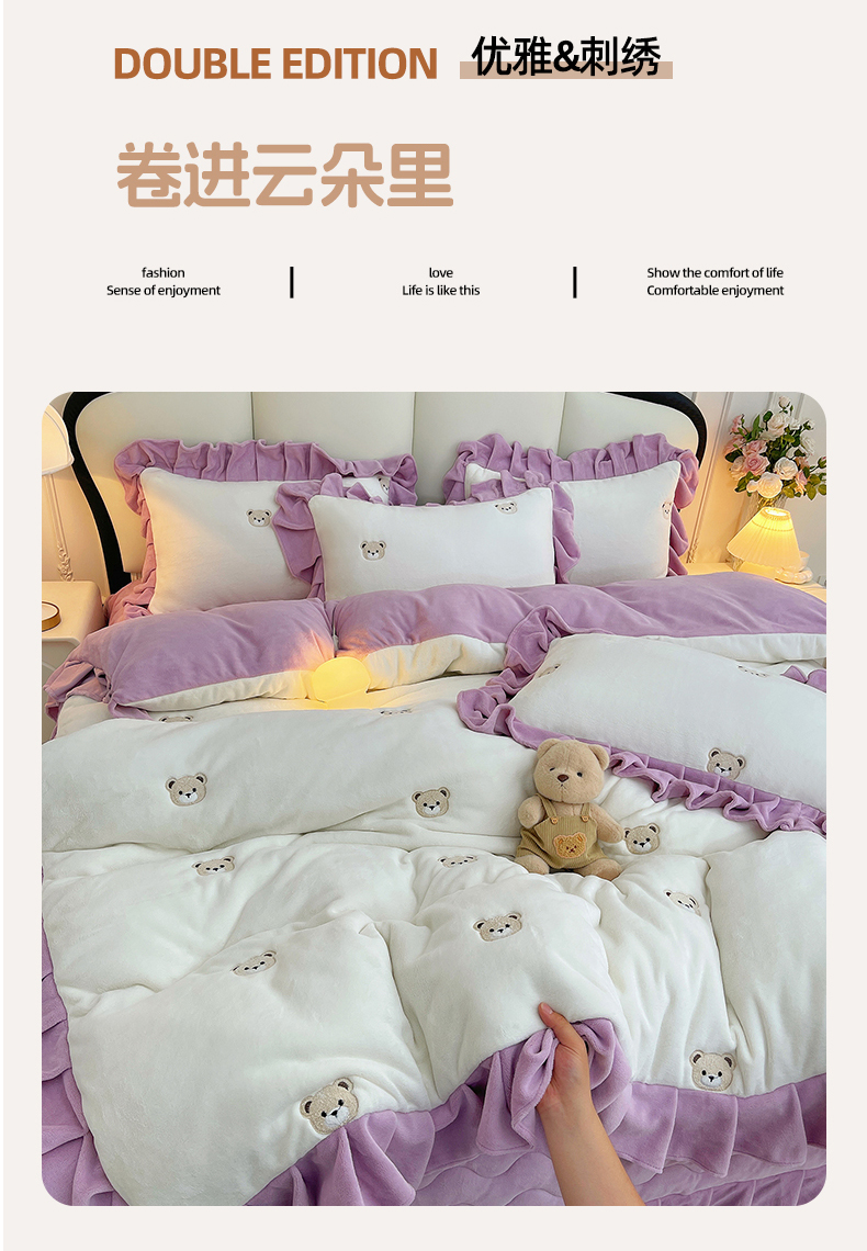茉保家纺 2025新款高克重9.5斤婴儿绒牛奶绒绣花夹棉床盖四件套 小熊-白拼紫