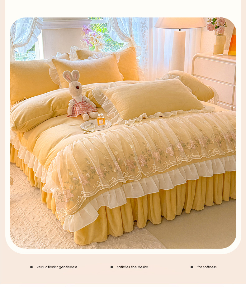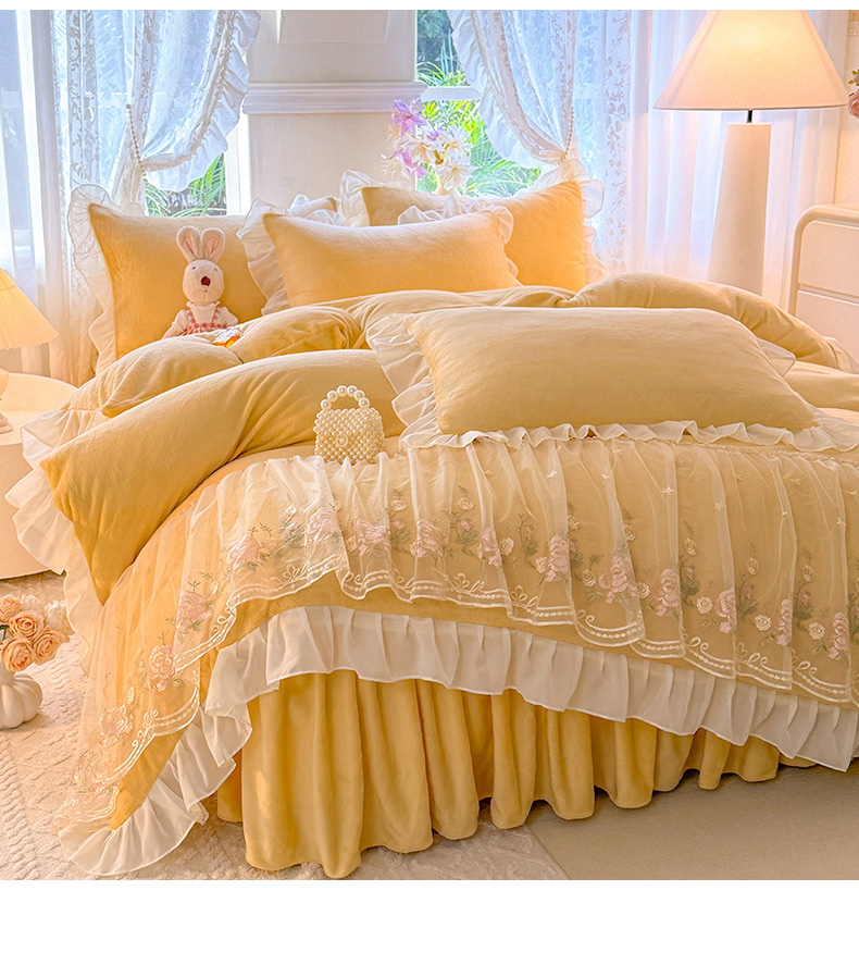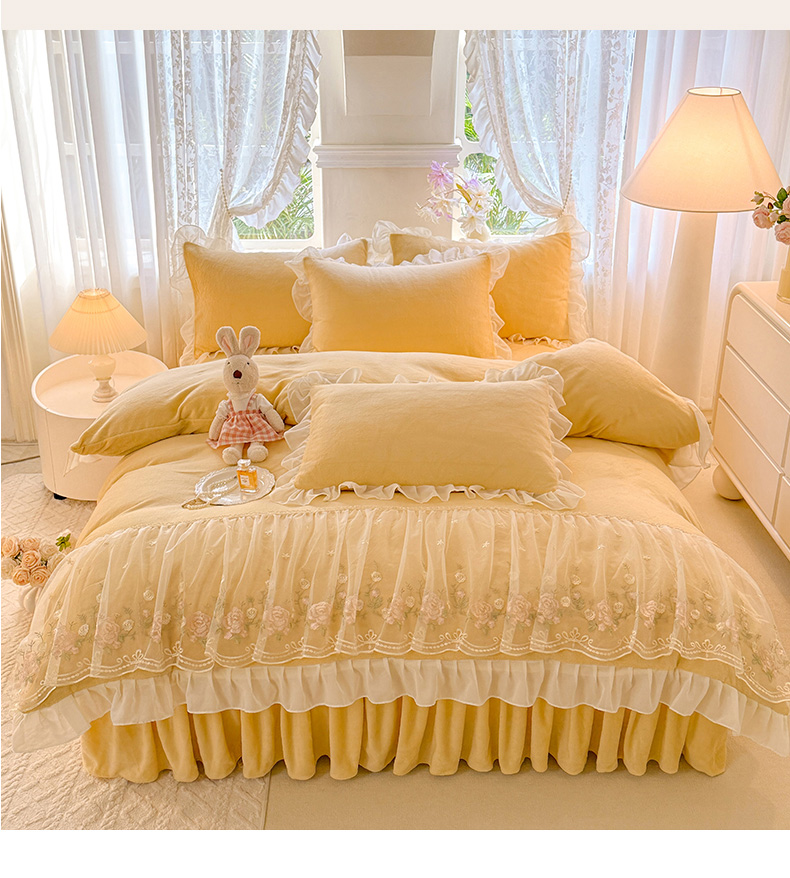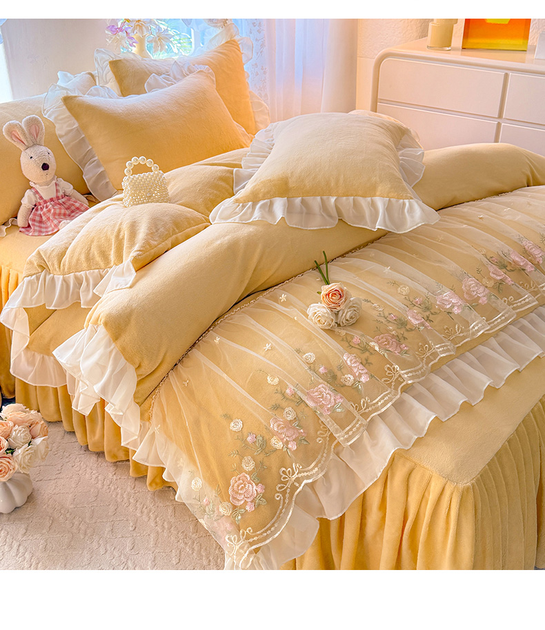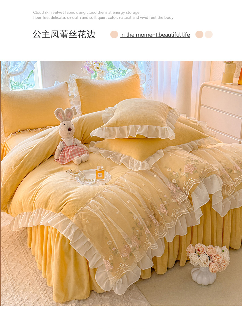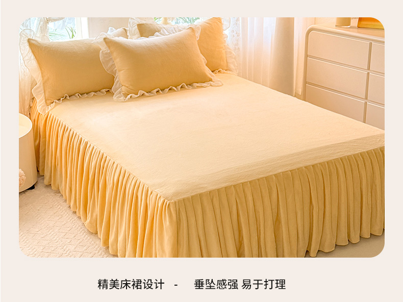 当前位置: 91家纺网 > 商品网购 > 床品套件 > 四件套 > 牛奶绒四件套 > 后庭寝室 2025新款高克重牛奶绒公主风床裙四件套-甜心系列 甜心-嫩黄