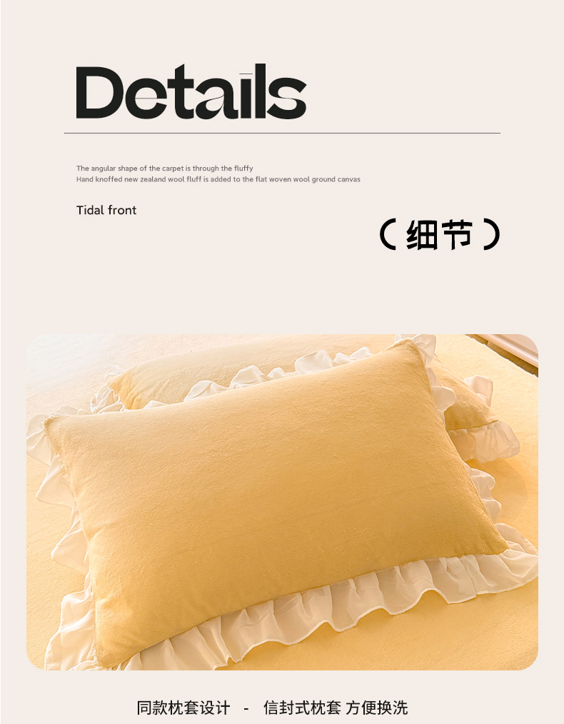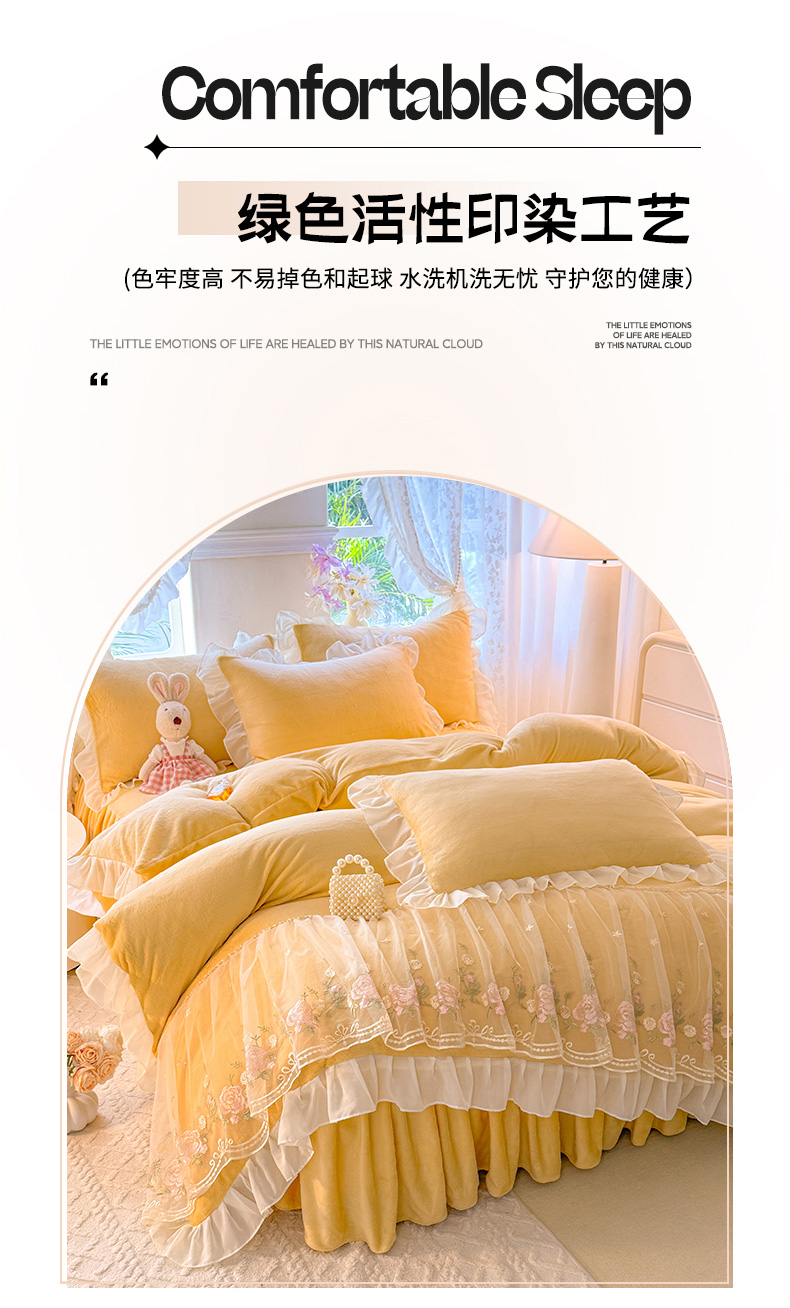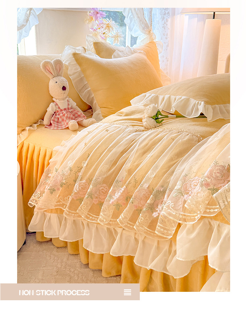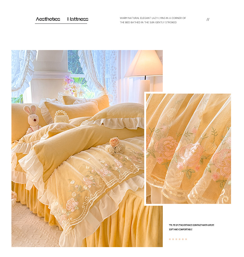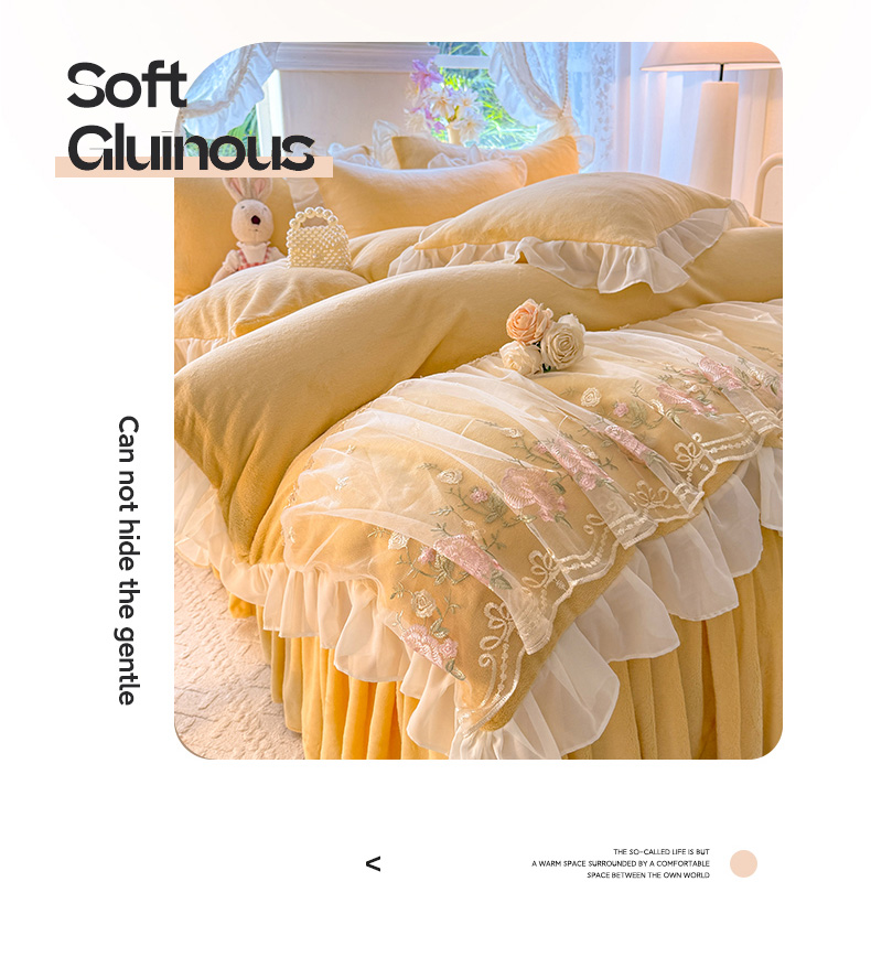 当前位置: 91家纺网 > 商品网购 > 床品套件 > 四件套 > 牛奶绒四件套 > 后庭寝室 2025新款高克重牛奶绒公主风床裙四件套-甜心系列 甜心-嫩黄