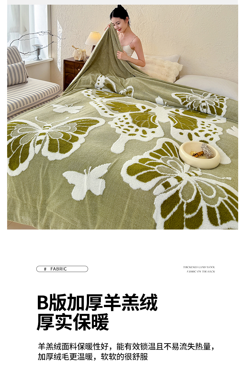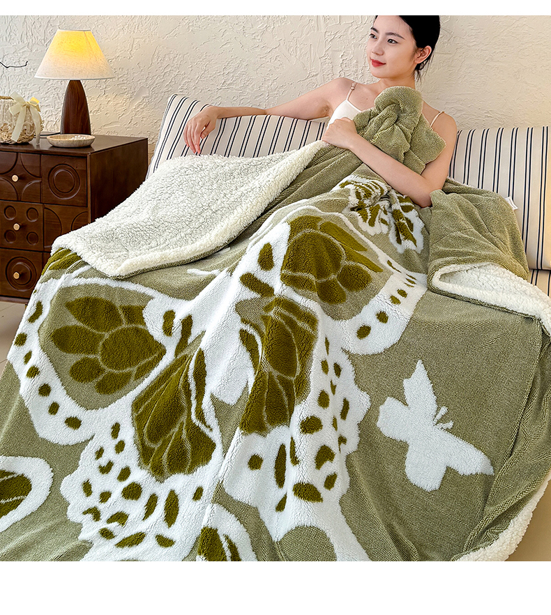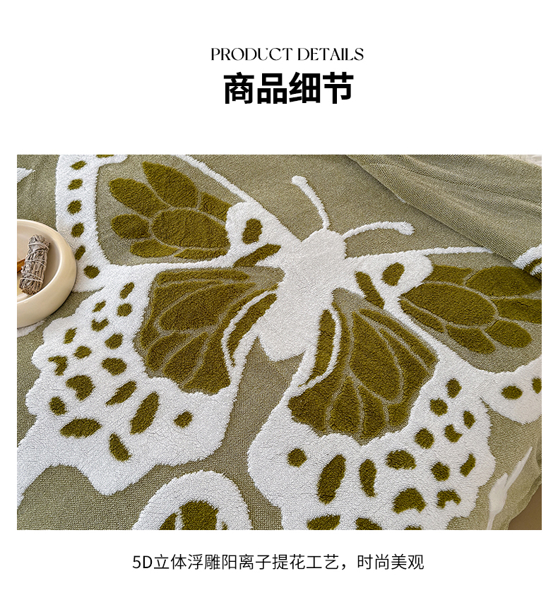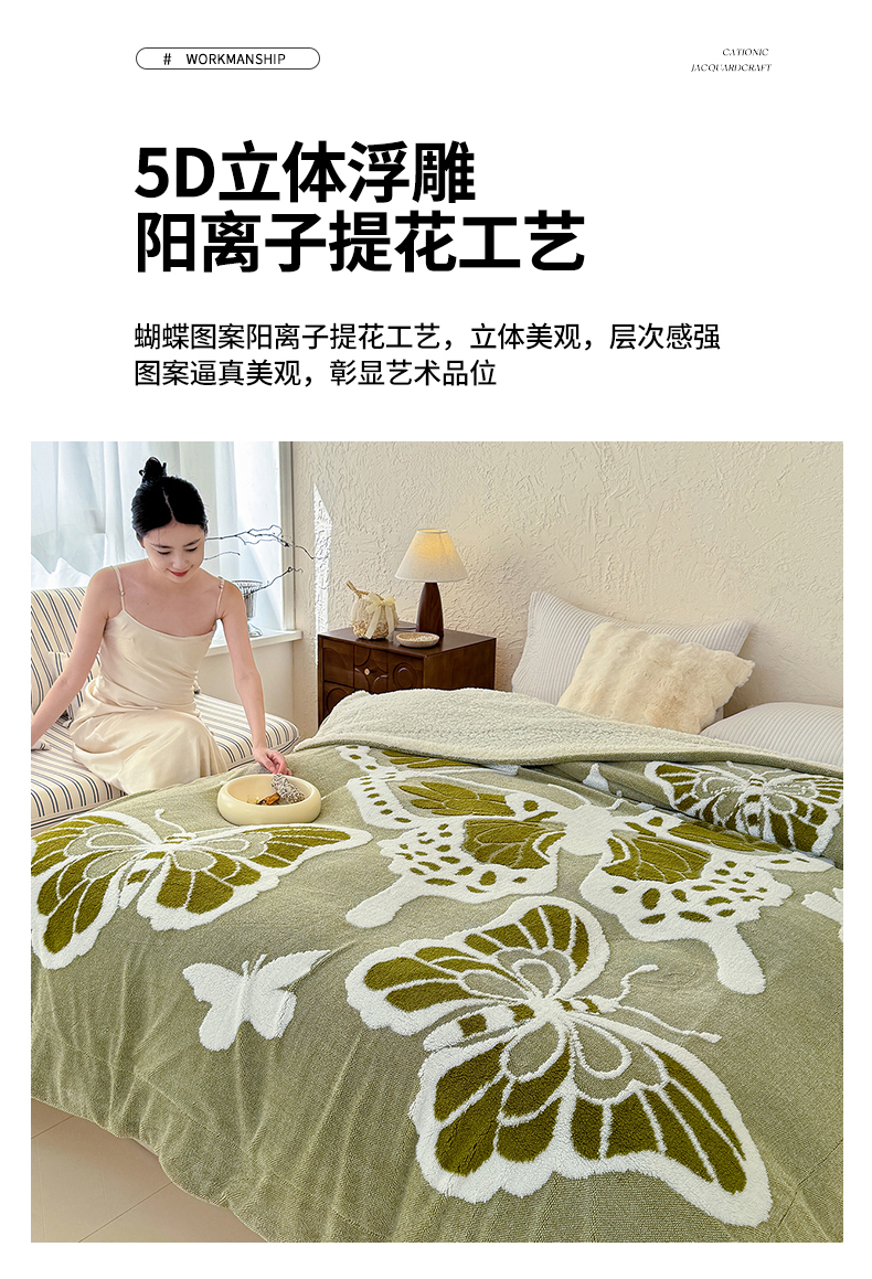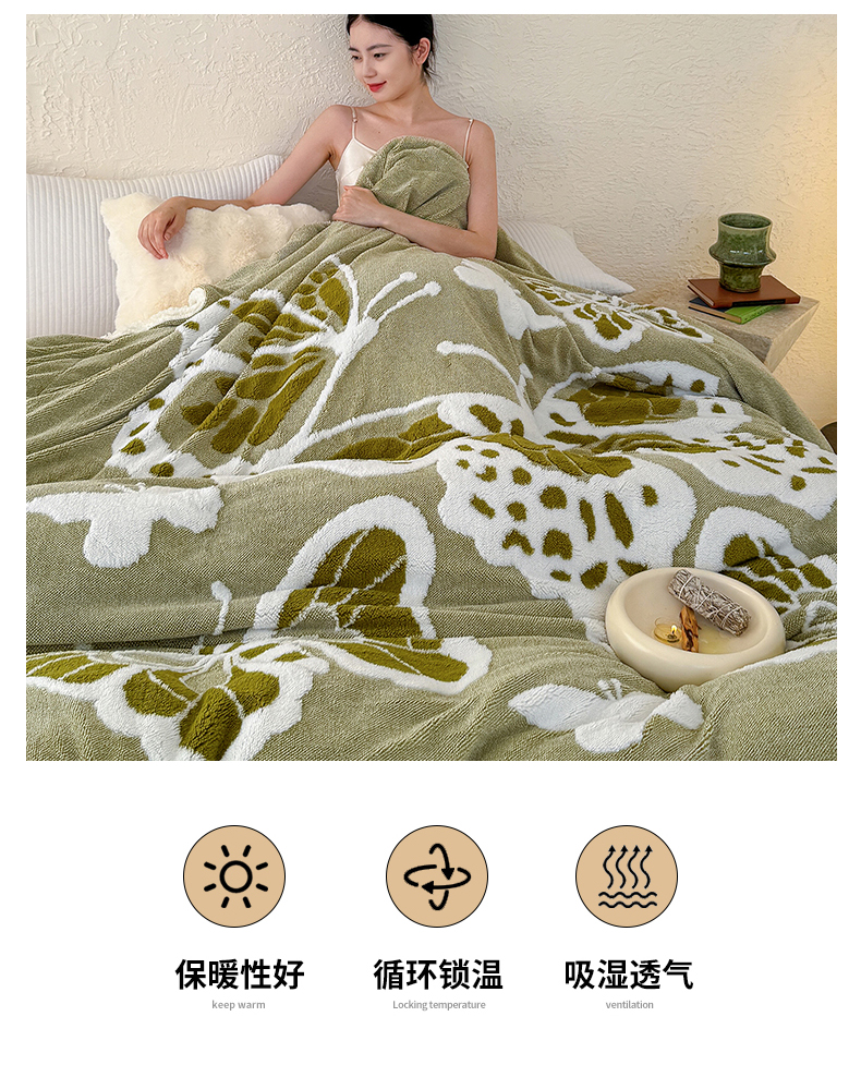 商品名称:枋梢家纺 2025新款5D立体浮雕森系蝴蝶阳离子提花塔芙绒羊羔绒 加厚保暖盖毯 居家午睡保暖毯 橄榄绿