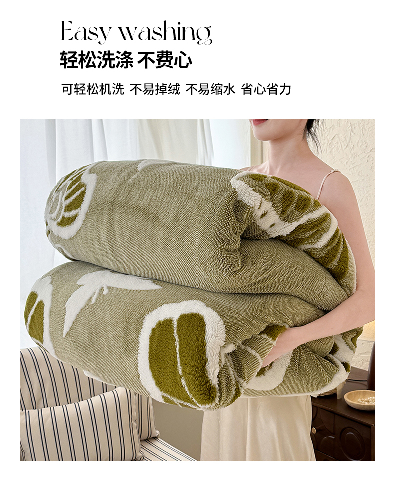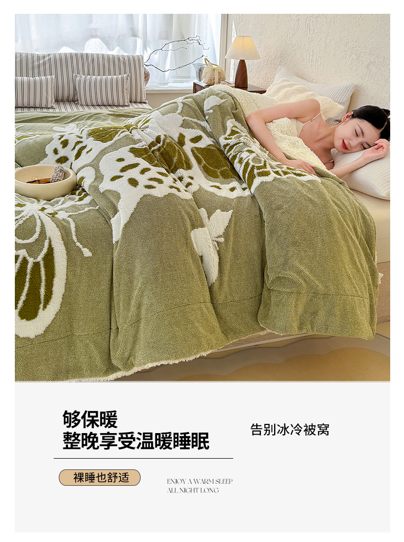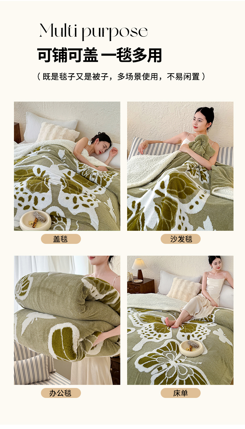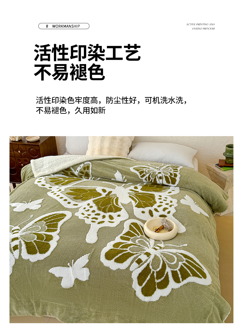商品名称:枋梢家纺 2025新款5D立体浮雕森系蝴蝶阳离子提花塔芙绒羊羔绒 加厚保暖盖毯 居家午睡保暖毯 橄榄绿
