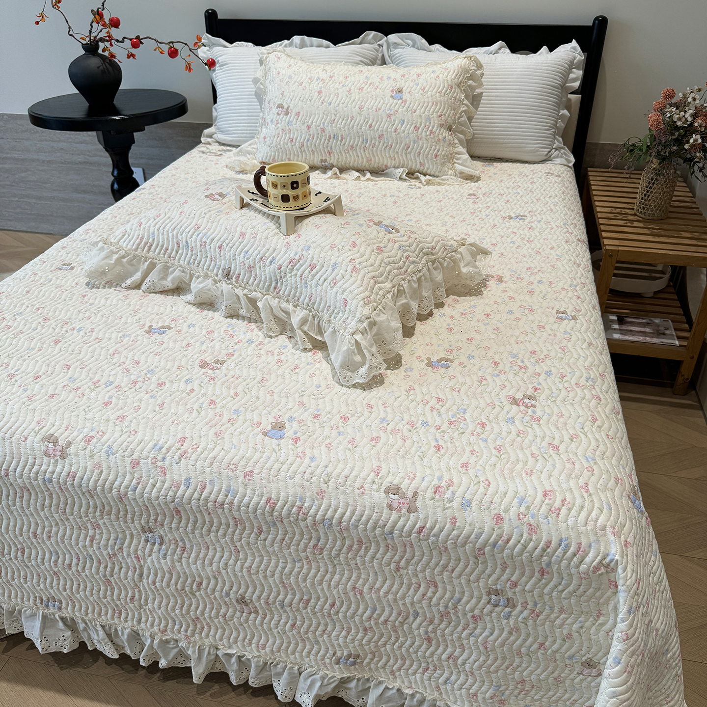 (总)莱豫家纺 2025春夏新款纯棉全棉花边款床盖三件套,呆呆熊,组合图仅供参考,花语绿,花语紫,柠檬,蔷薇,西瓜兔,夏蓝,夏梦,夏之语,小花熊,樱花