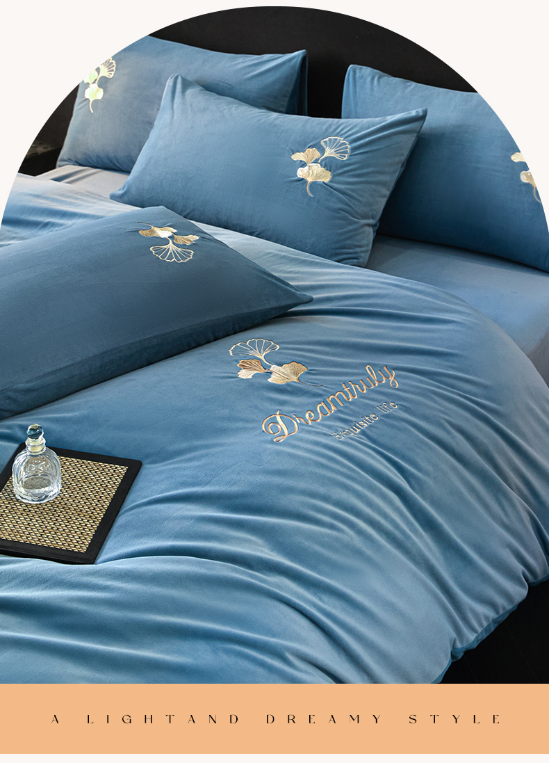 商品名称:如一 2025新款水晶绒双拼刺绣牛奶绒单品被套 银杏-宾利蓝