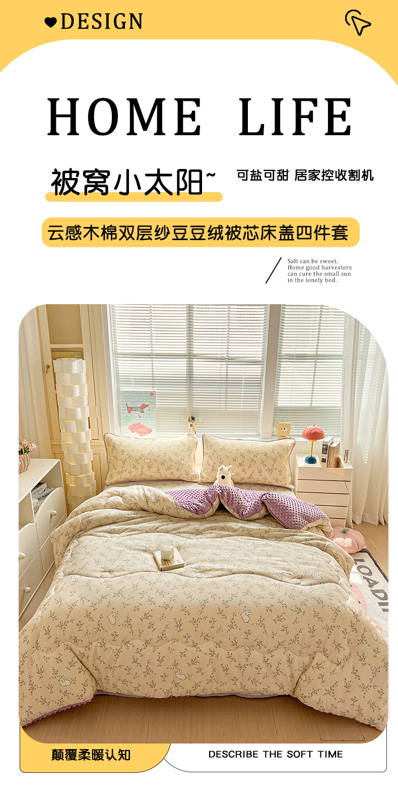 • 91家纺网 家纺一手货源 找家纺 优选 2025新款木棉双层纱ins少女心可爱加厚豆豆冬被四件套床盖三件套暖梦小红书推荐 花花兔兔