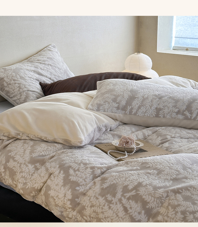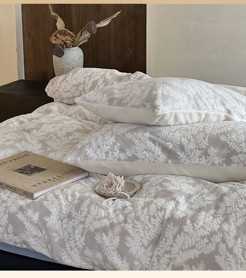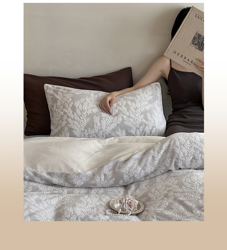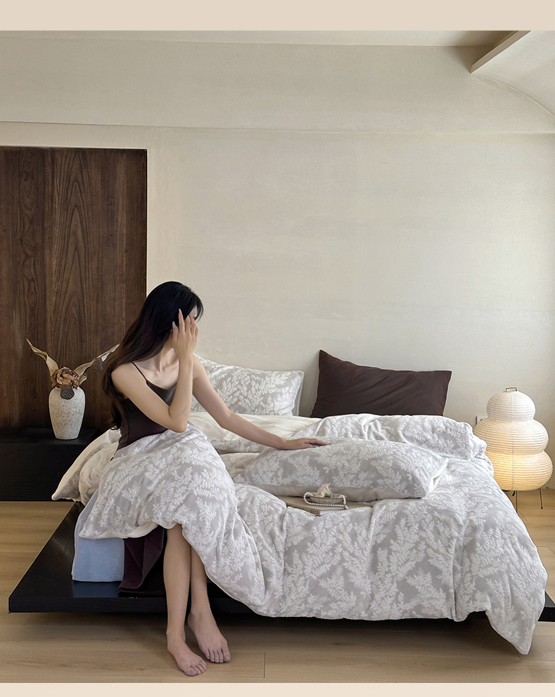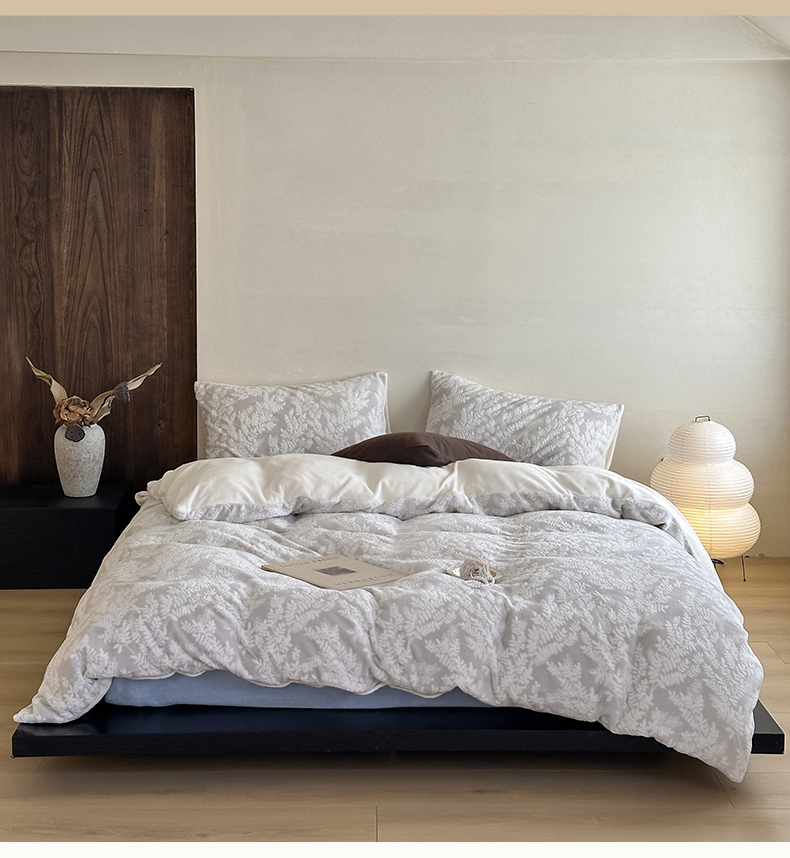 商品名称:玛奇朵 2025新款秋冬新品230克工艺立体雕花牛奶绒四件套 花满溪系列 花满溪-灰
