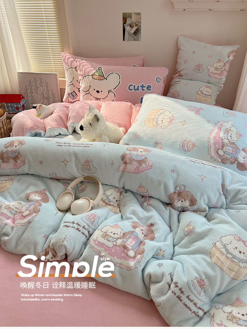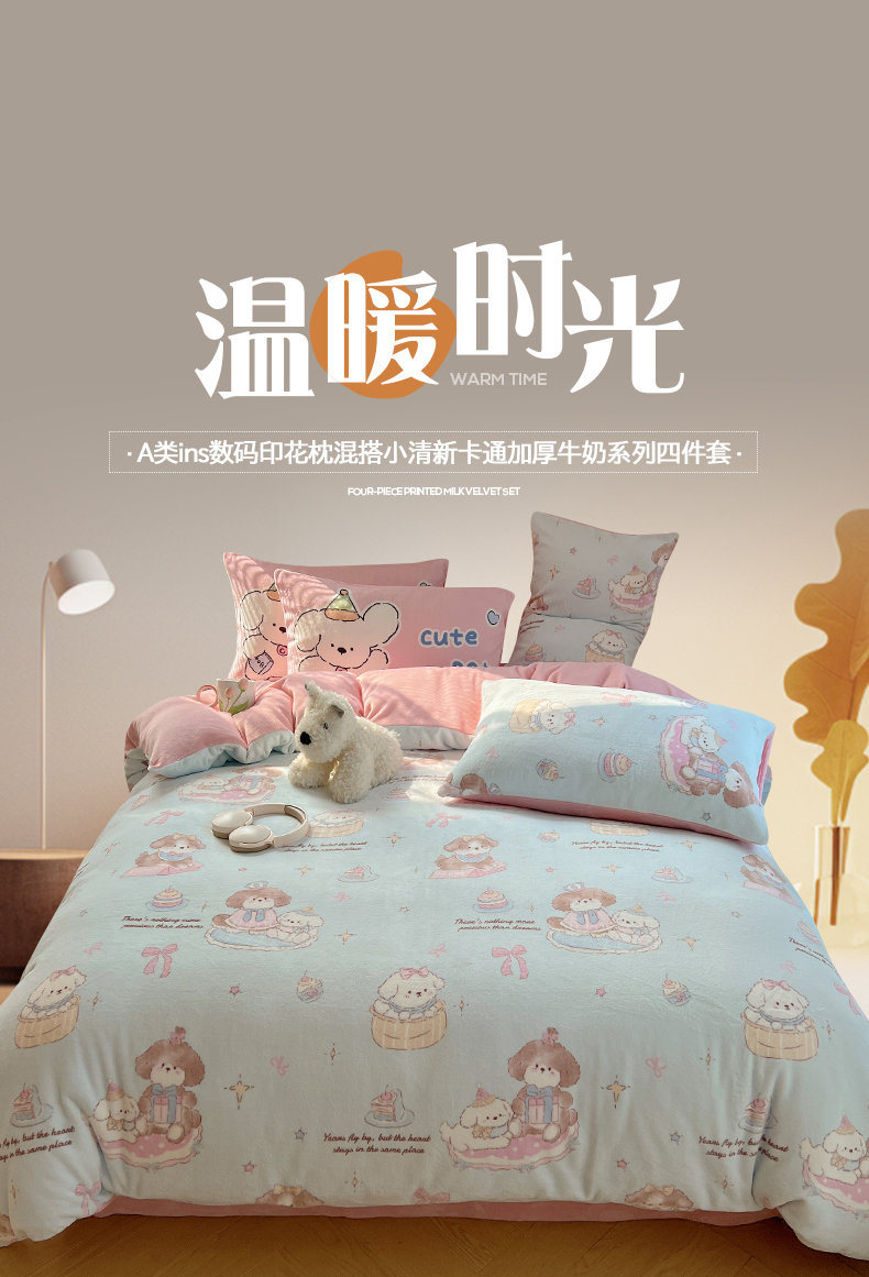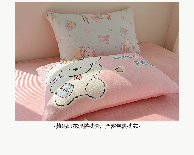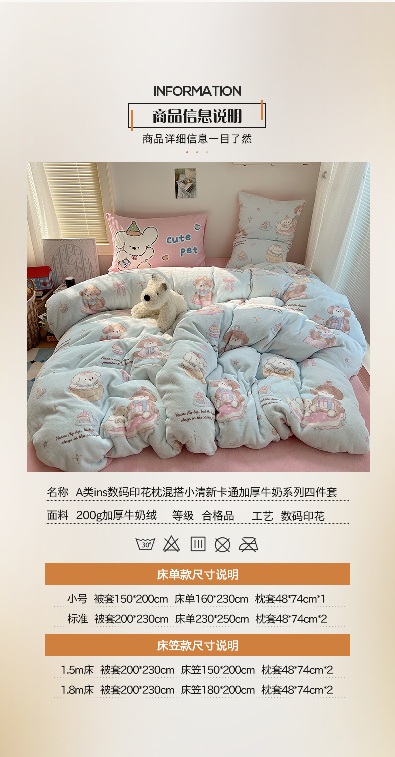 商品名称:桃子家居 2025新款A类ins数码印花枕混搭小清新少女卡通猫咪加厚牛奶系列四件套 绒-混搭蓝粉小狗