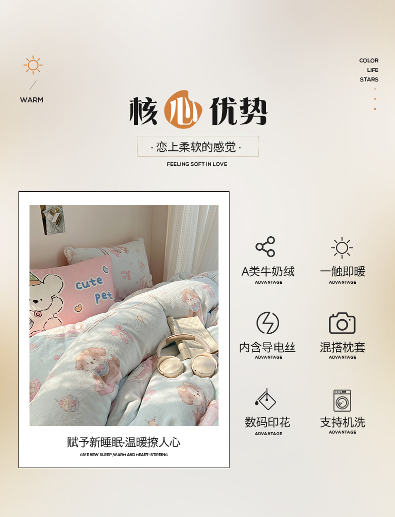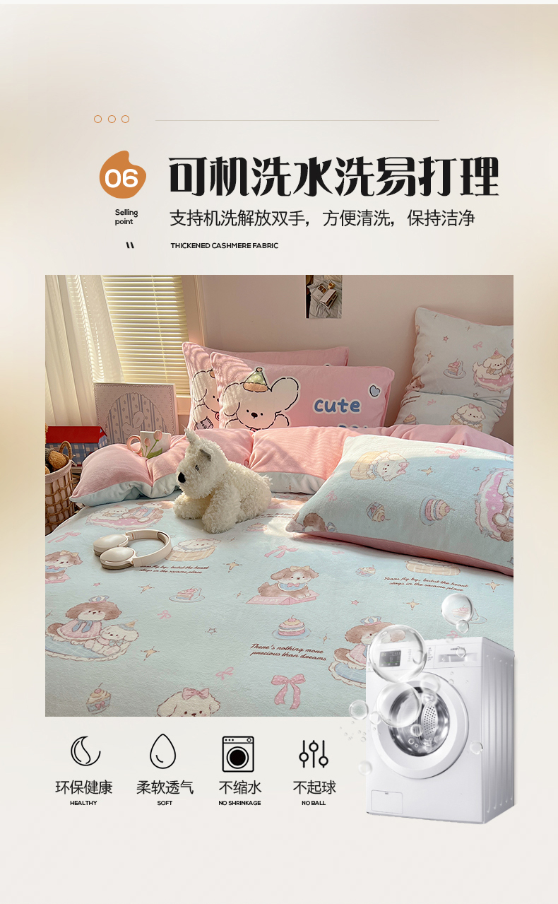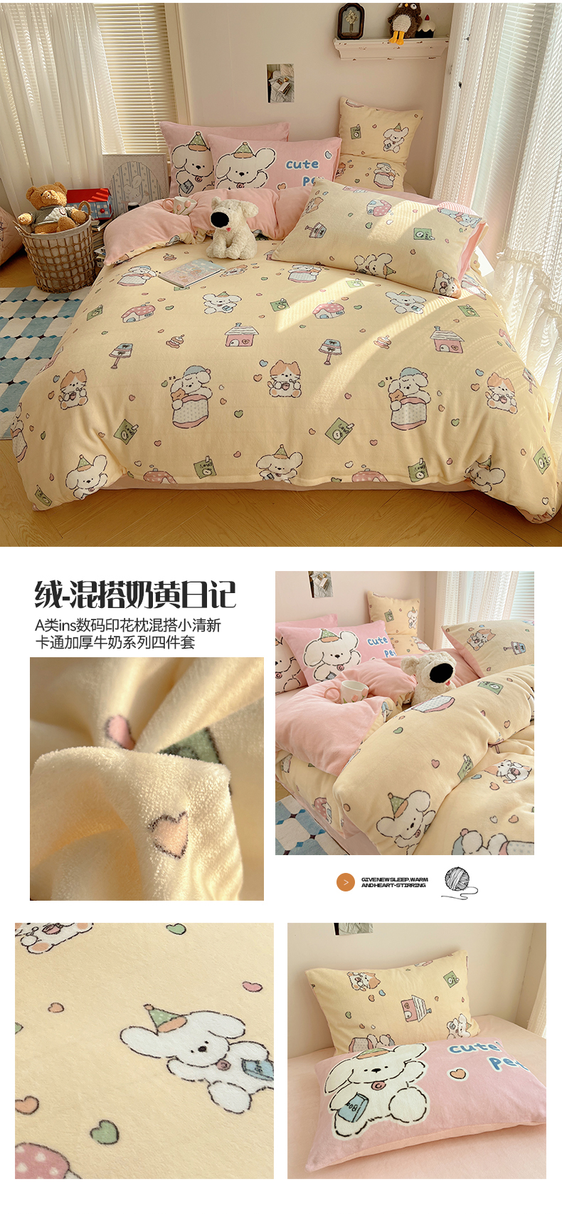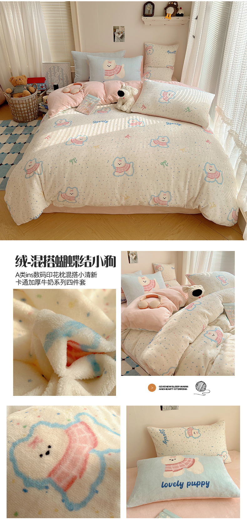 商品名称:桃子家居 2025新款A类ins数码印花枕混搭小清新少女卡通猫咪加厚牛奶系列四件套 绒-混搭蓝粉小狗
