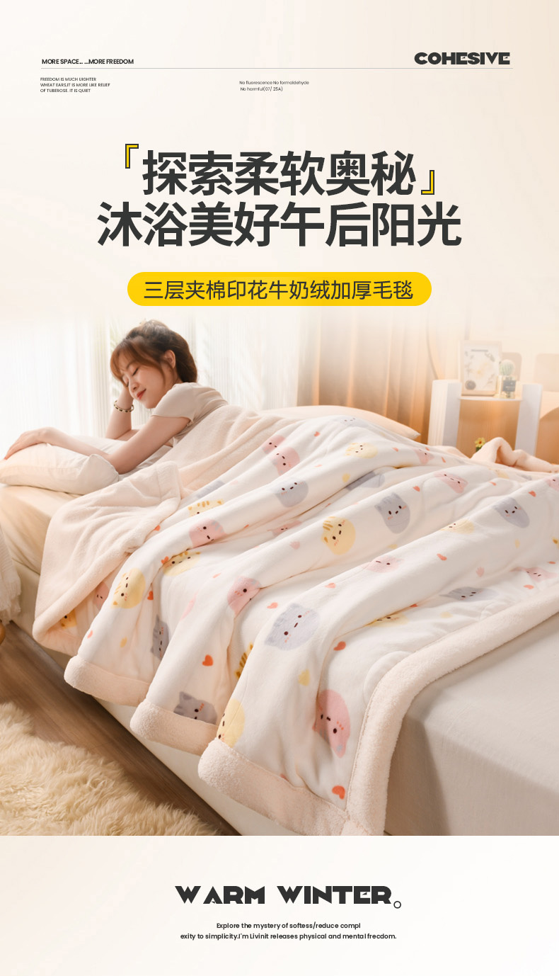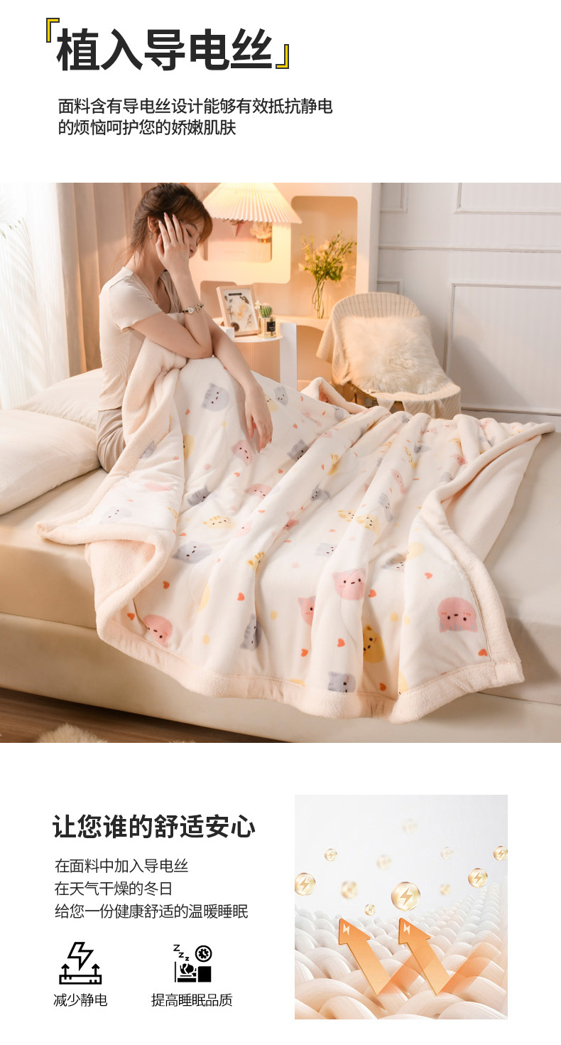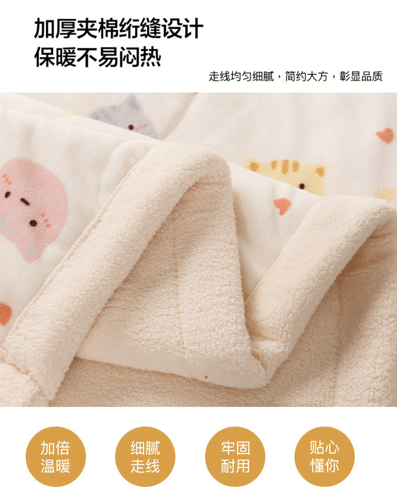 商品名称:印季家纺 2025新款三层夹棉印花牛奶绒毛毯毯子 小猫咪-羊羔绒