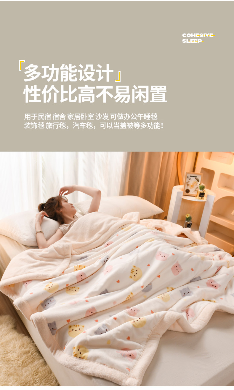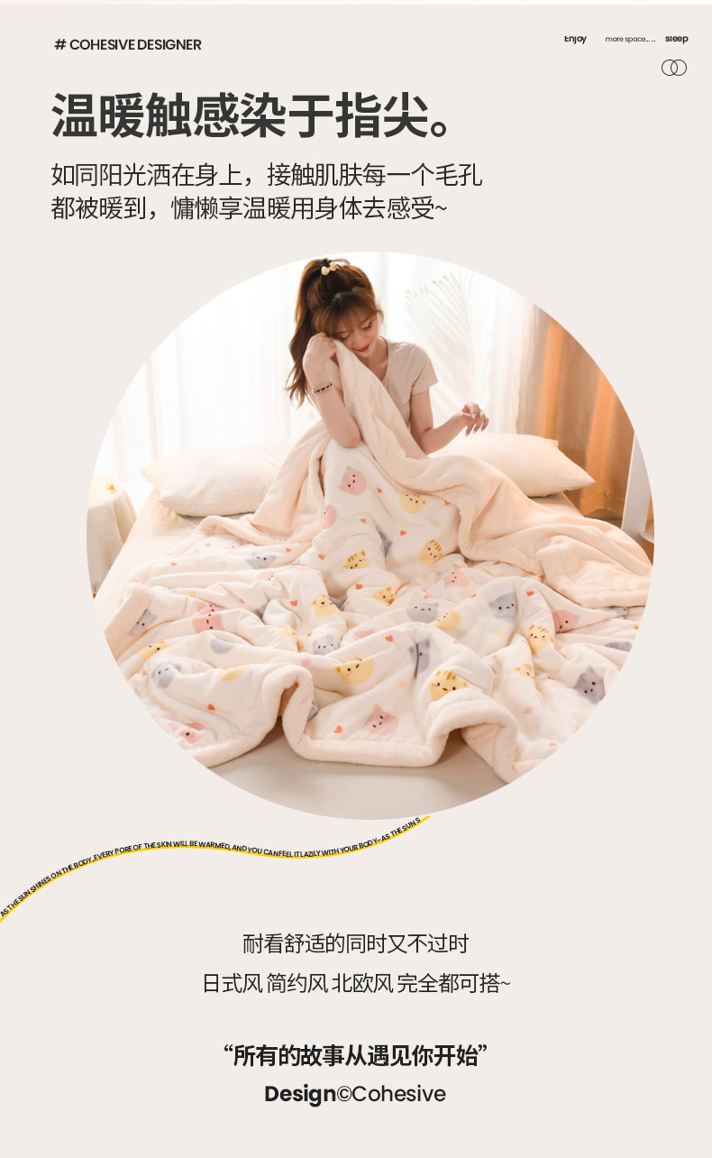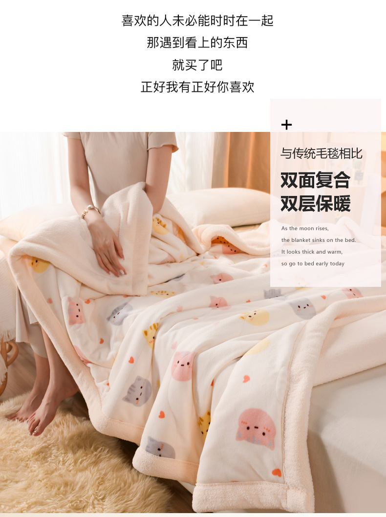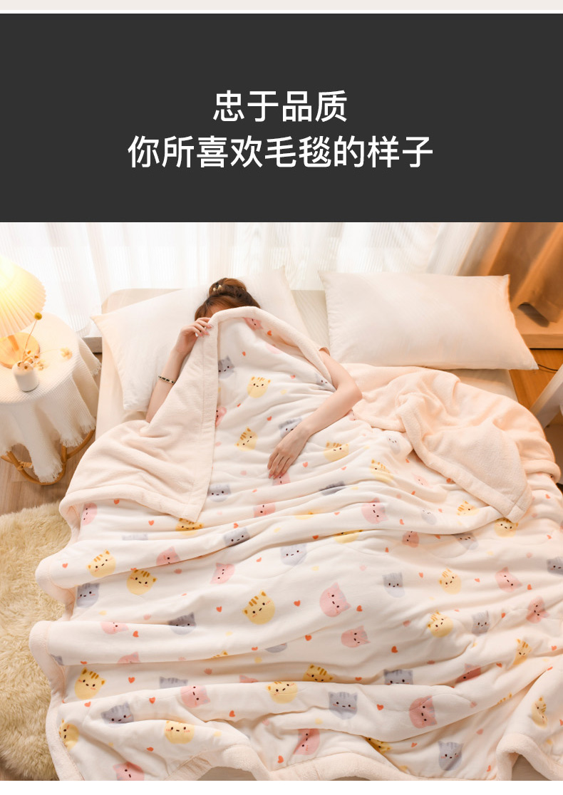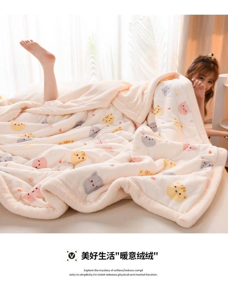 印季家纺 2025新款三层夹棉印花牛奶绒毛毯毯子 小猫咪-羊羔绒